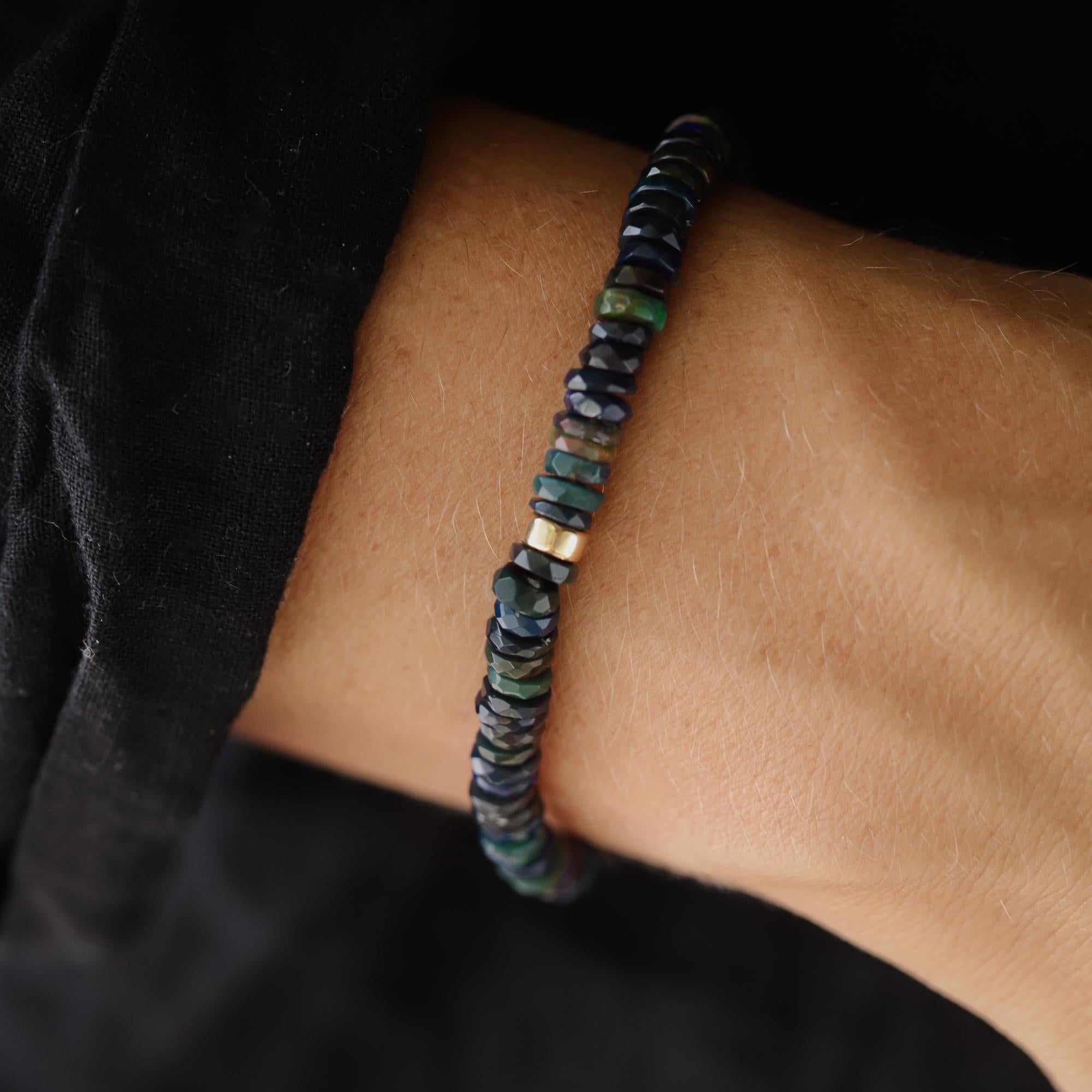 This striking stretch bracelet features AAA-grade black Ethiopian opal—dark, moody, and full of cosmic flash. Finished with a solid 14K gold accent bead and strung on durable stretch cord, this piece is both luxurious and easy to wear—powerful, grounded, and unmistakably unique.