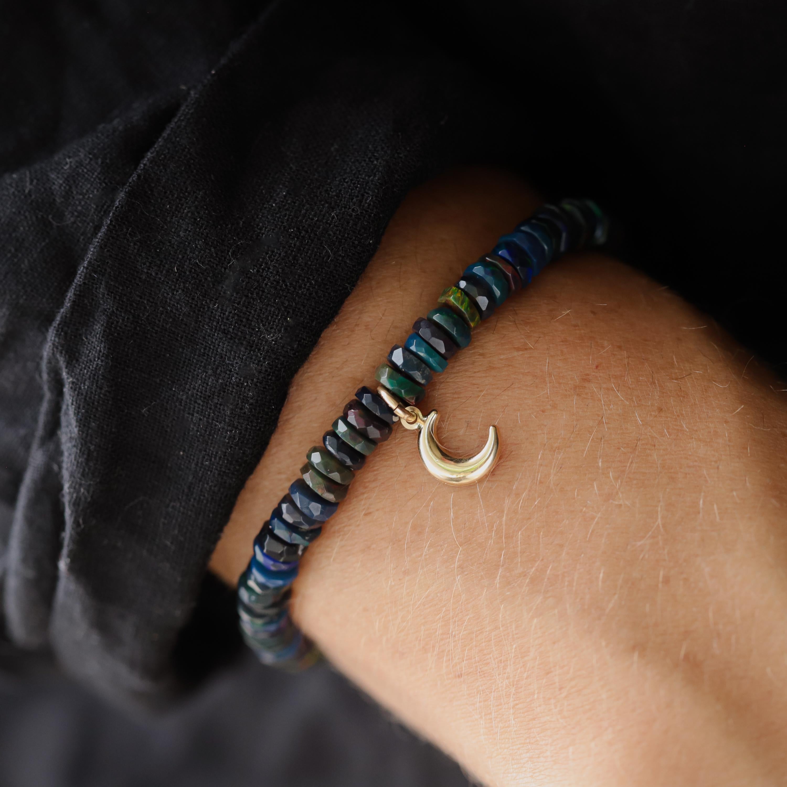 This captivating stretch bracelet features AAA-grade black Ethiopian opal—dark, moody, and glowing with cosmic flashes of color. Accented with a solid 14K gold rondel bead and a delicate 14K gold moon charm, it’s a luxurious piece that honors both intuition and individuality. Easy to slip on, powerful in presence.