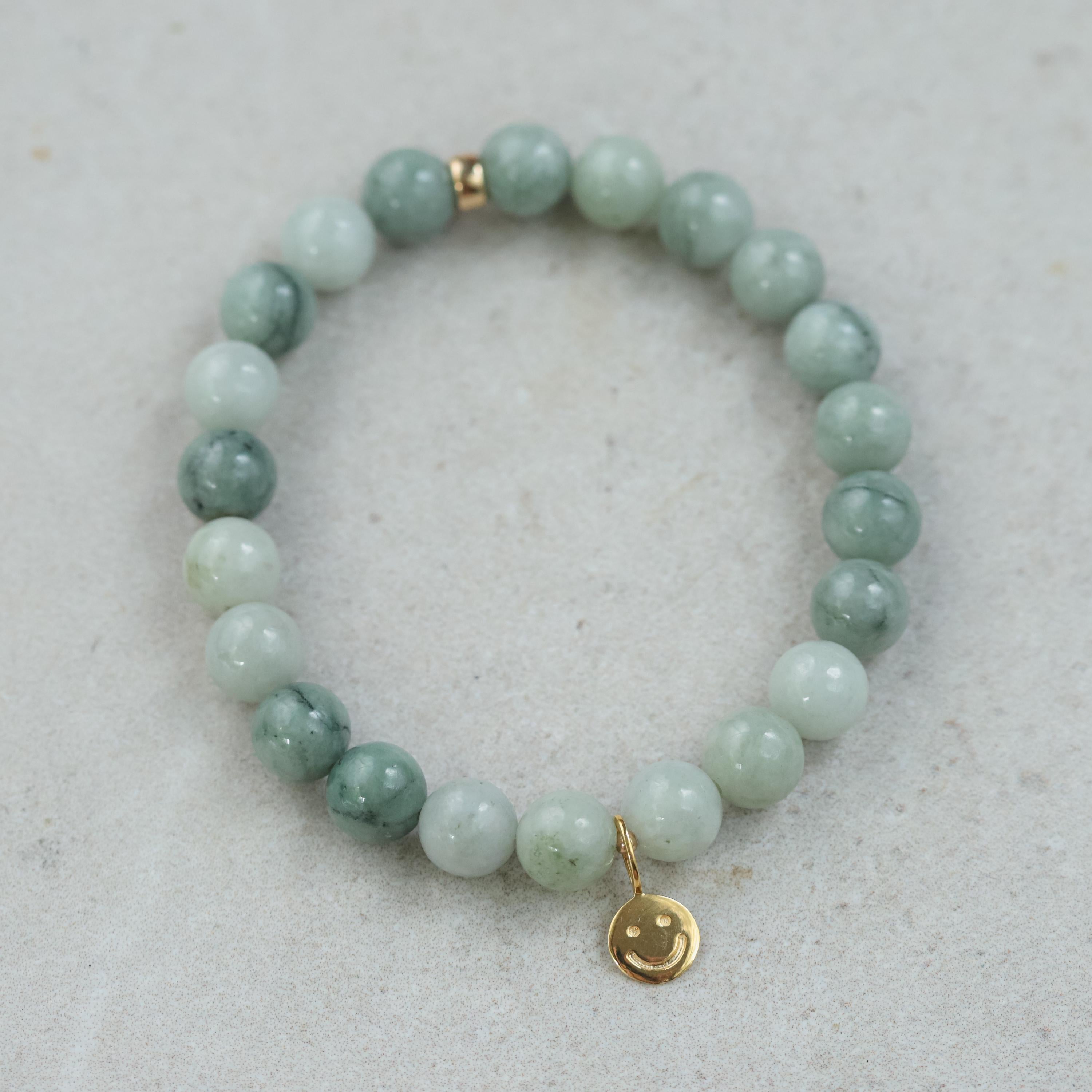 Crafted from smooth 8mm Burmese jade, this bracelet carries the timeless energy of abundance, harmony, and healing. Choose between a playful solid 14K gold happy face charm or a refined 14K gold rondel—or opt for the set of two to enjoy both styles, perfect for stacking. Strung on a durable stretch cord for everyday ease and comfort.