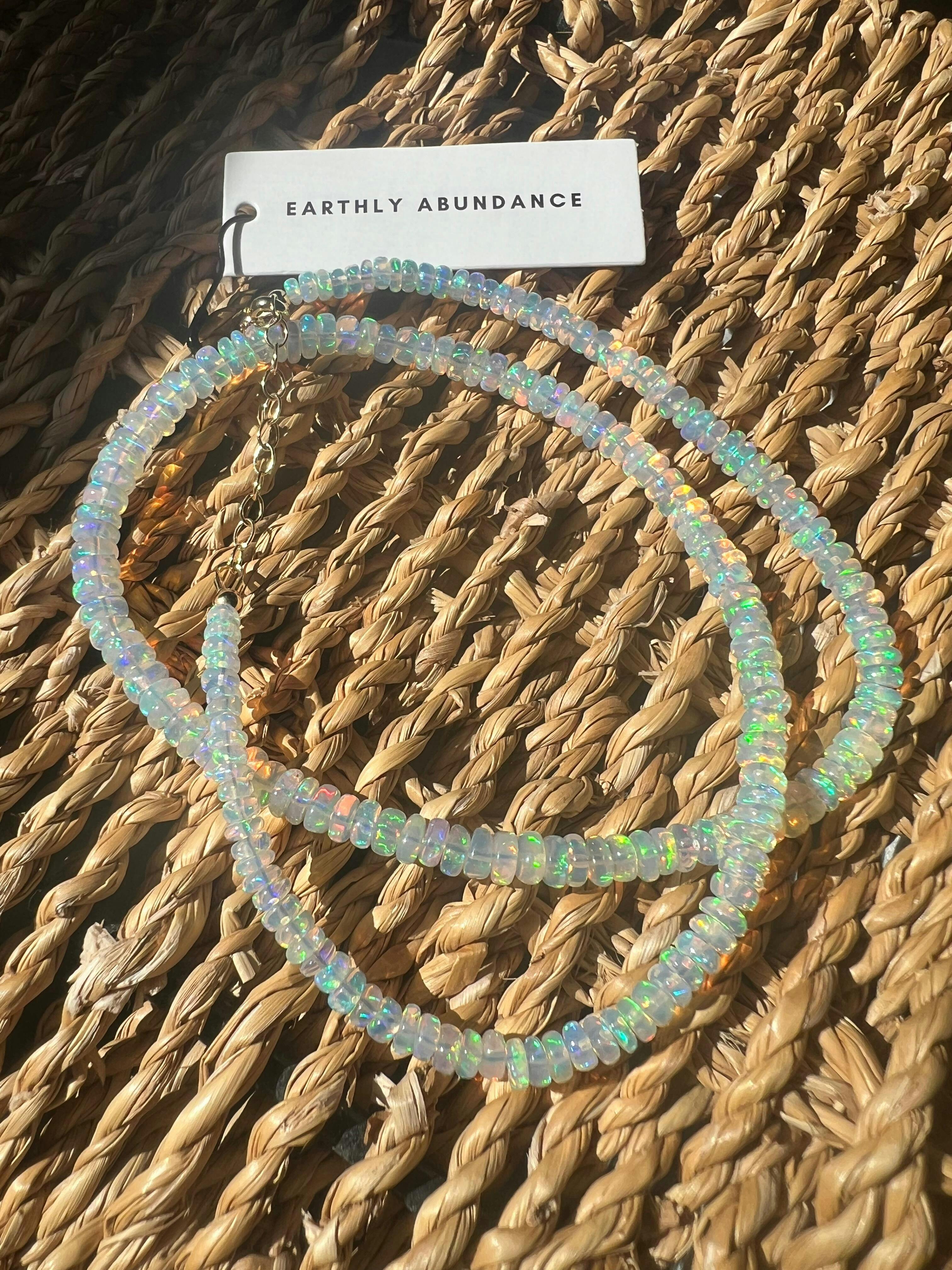 Crafted with 100% natural, un-dyed, non-synthetic Ethiopian opal, this glowing necklace showcases a soft milky tone with ethereal shimmer. The smooth rondelle cut and delicate gradient size bring dimension and movement to this elevated piece, finished entirely in solid 14K gold for lasting beauty.