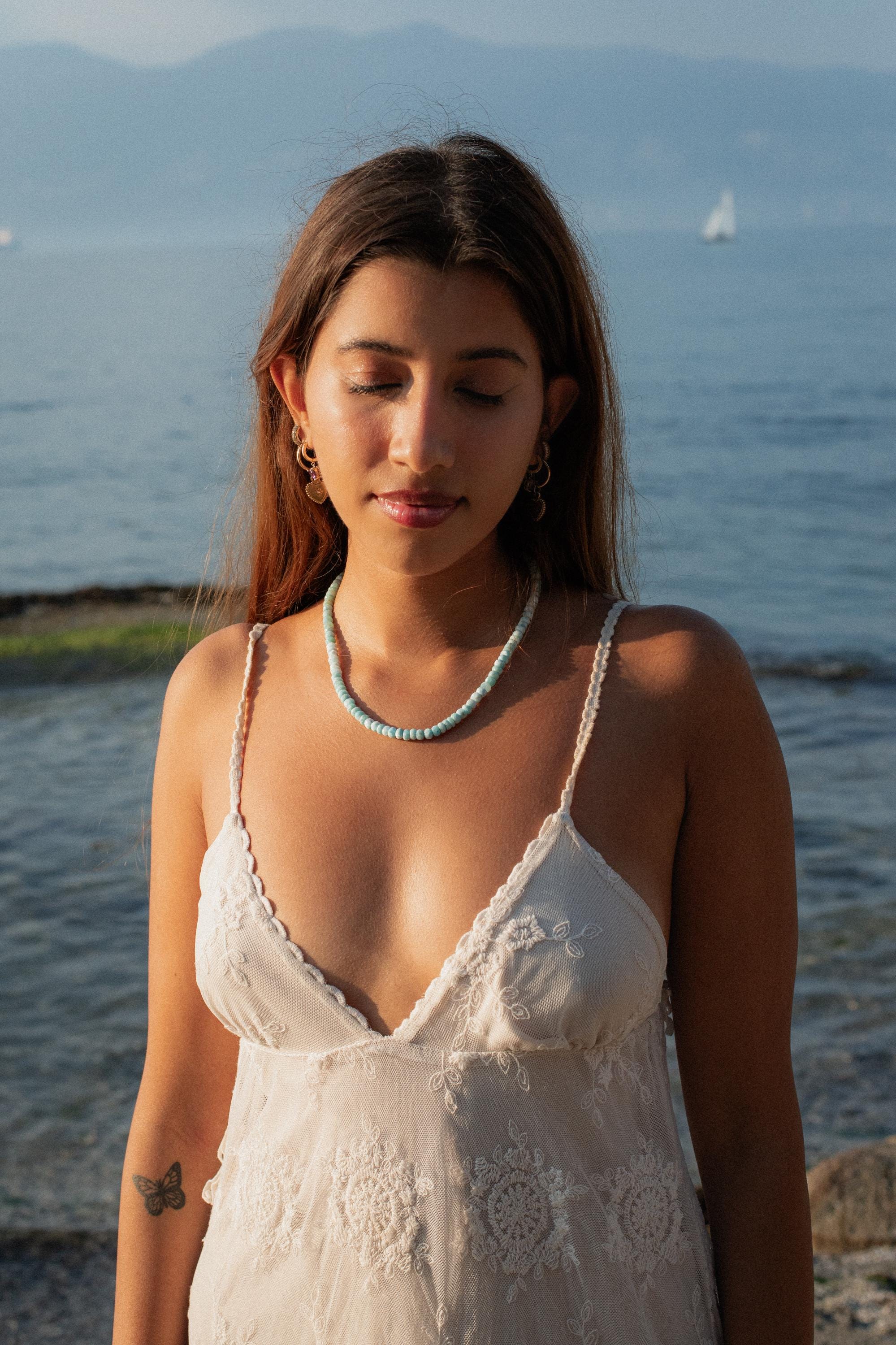 This serene necklace features genuine larimar in a faceted rondelle cut, ranging from approximately 4 to 5.5mm. Each stone reflects soft, natural variation—capturing the essence of tranquil waters and peaceful presence. Finished with a 14K gold filled clasp.