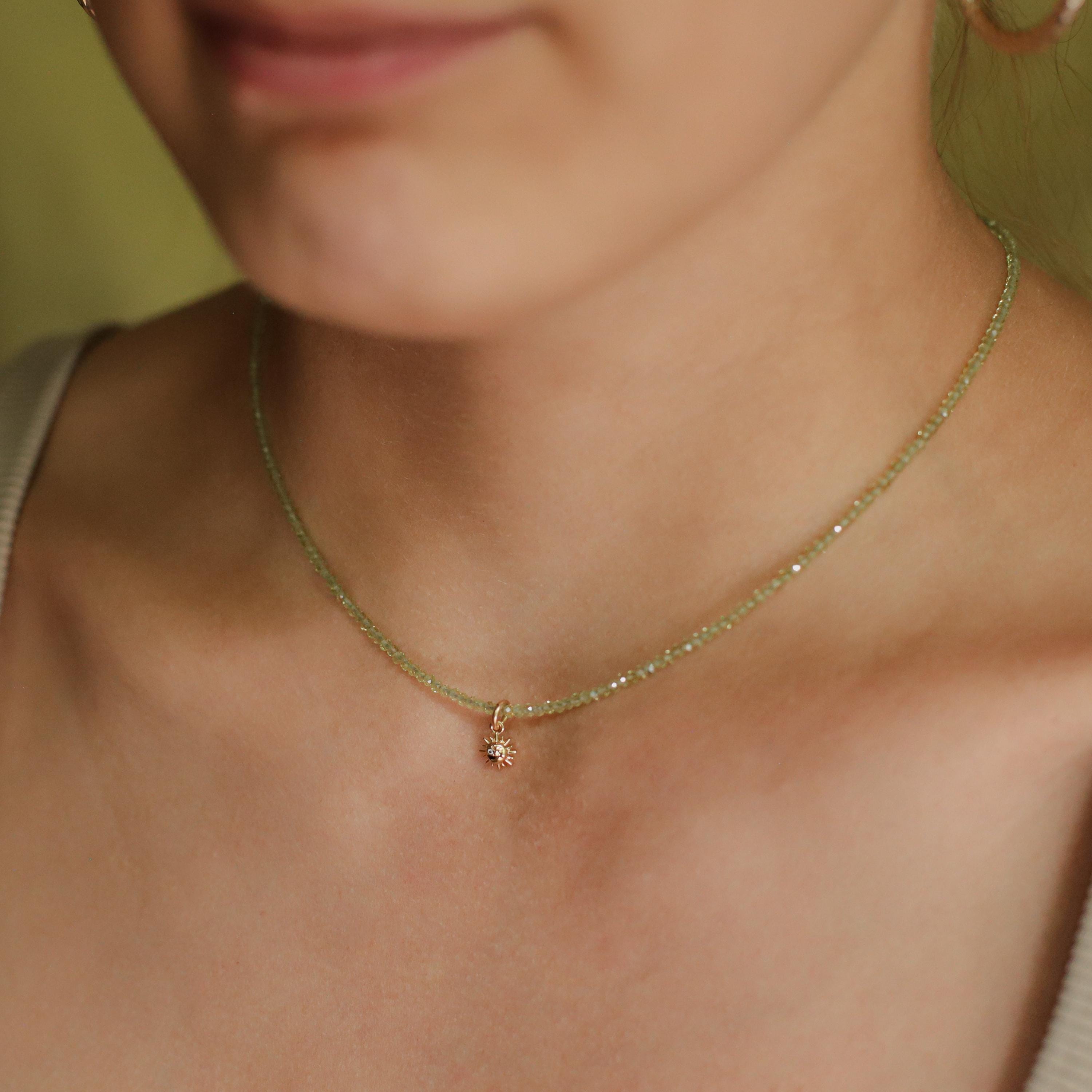 Peridot is known for opening the heart to joy, enhancing confidence, and supporting new beginnings. This radiant necklace features high-grade 2mm faceted peridot—delicately strung and finished with a solid 14K gold spring clasp. Choose to wear it solo or add a symbolic sun & moon charm in solid 14K gold with diamond-cut detailing for extra intention and light.