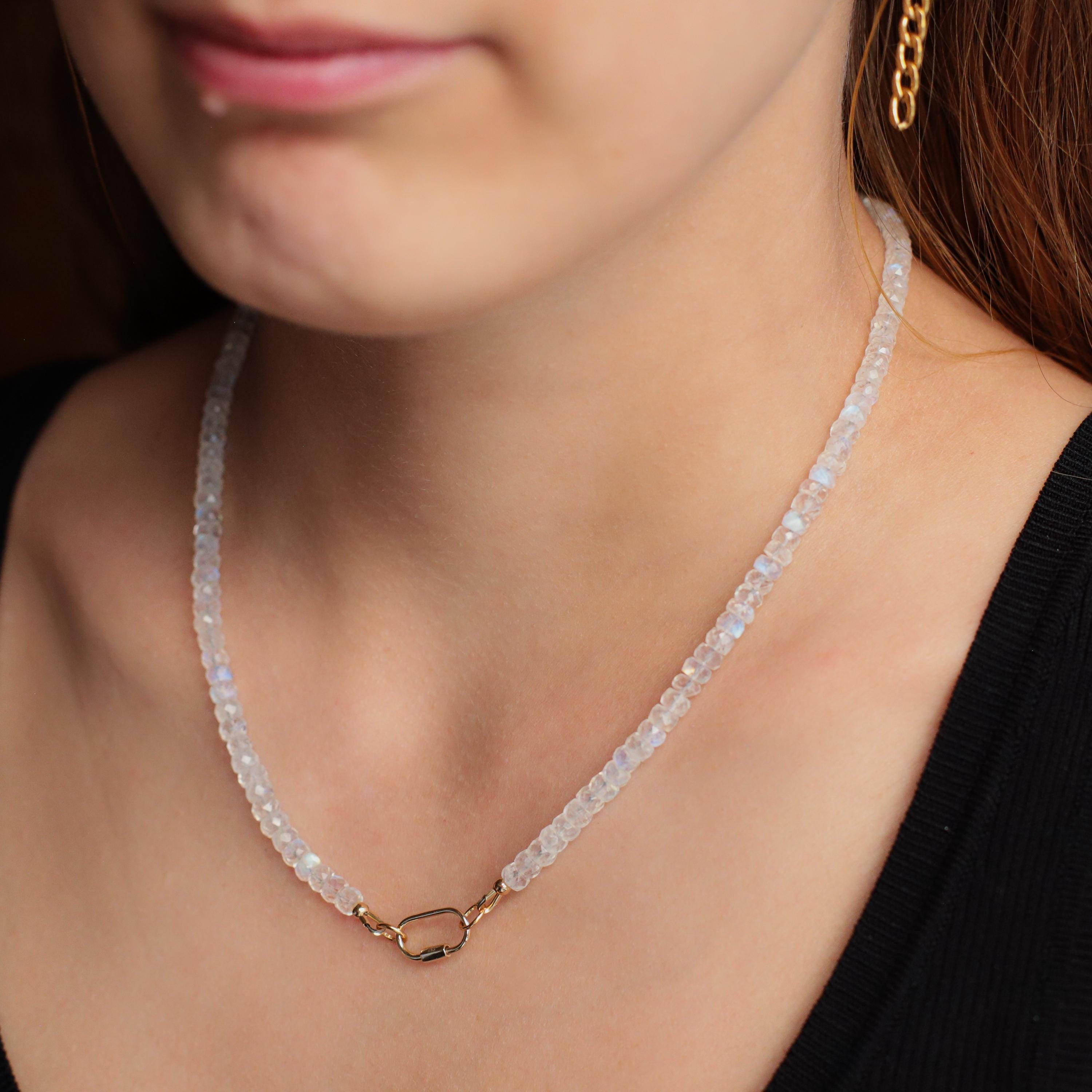 A luminous strand of AAAA+ rainbow moonstone, shimmering with soft flashes of blue and white light. Each faceted rondelle is hand-strung for a delicate, elevated look—finished with your choice of sterling silver, 14K gold filled, or solid 14K gold carabiner and components.