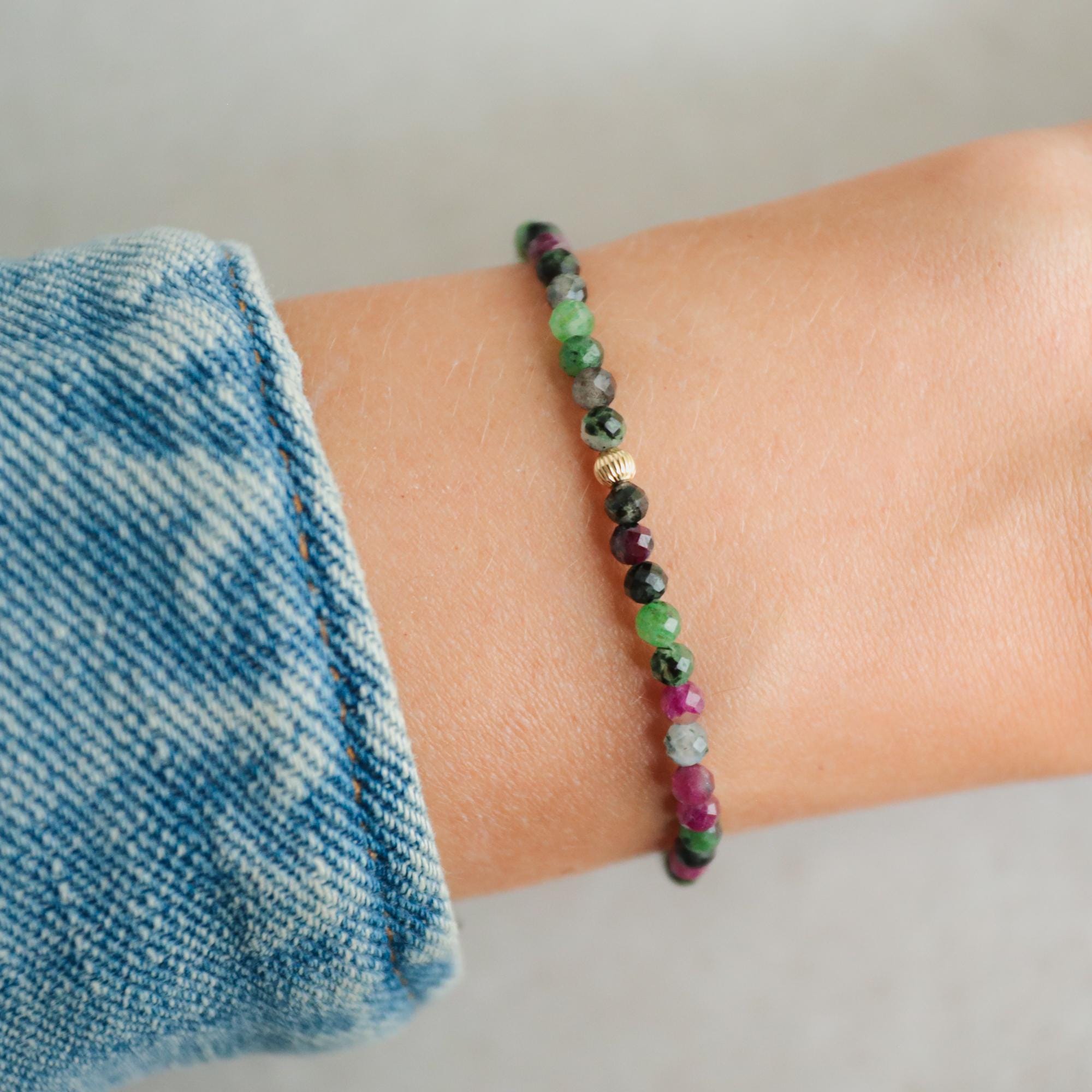 This vibrant bracelet features natural ruby zoisite in a 3mm faceted round cut—merging the grounding energy of zoisite with the fiery spark of ruby. A rare and powerful pairing, accented with a solid 14K gold bead for timeless elegance.