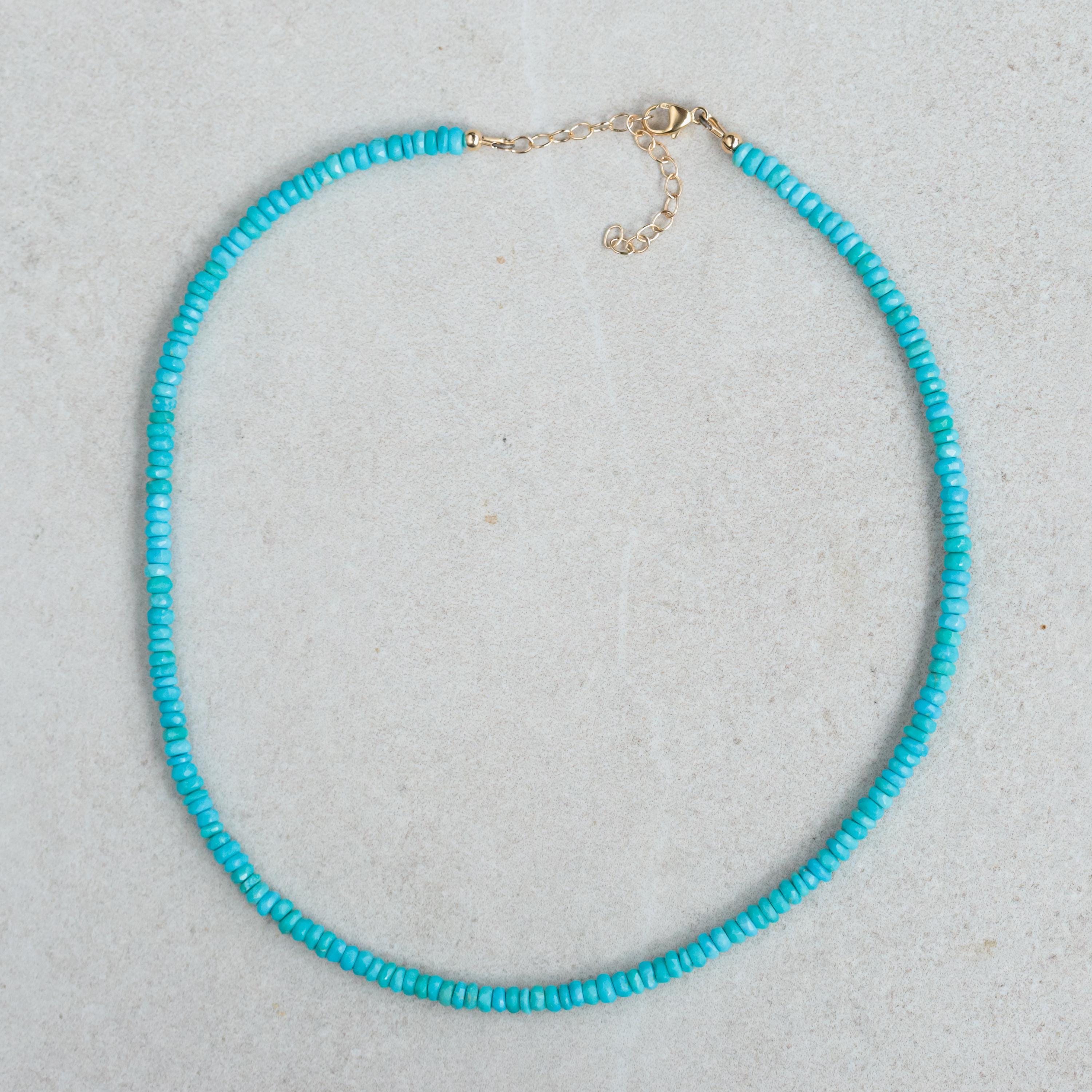 • Genuine Sleeping Beauty Turquoise (approx. 3mm faceted rondelle) • Hand-selected in Tucson for color and quality • Solid 14K gold lobster clasp • Finished with solid gold wire protectors for durability • Extender included for the perfect adjustable fit • Handmade in Canada • 100% genuine gemstones