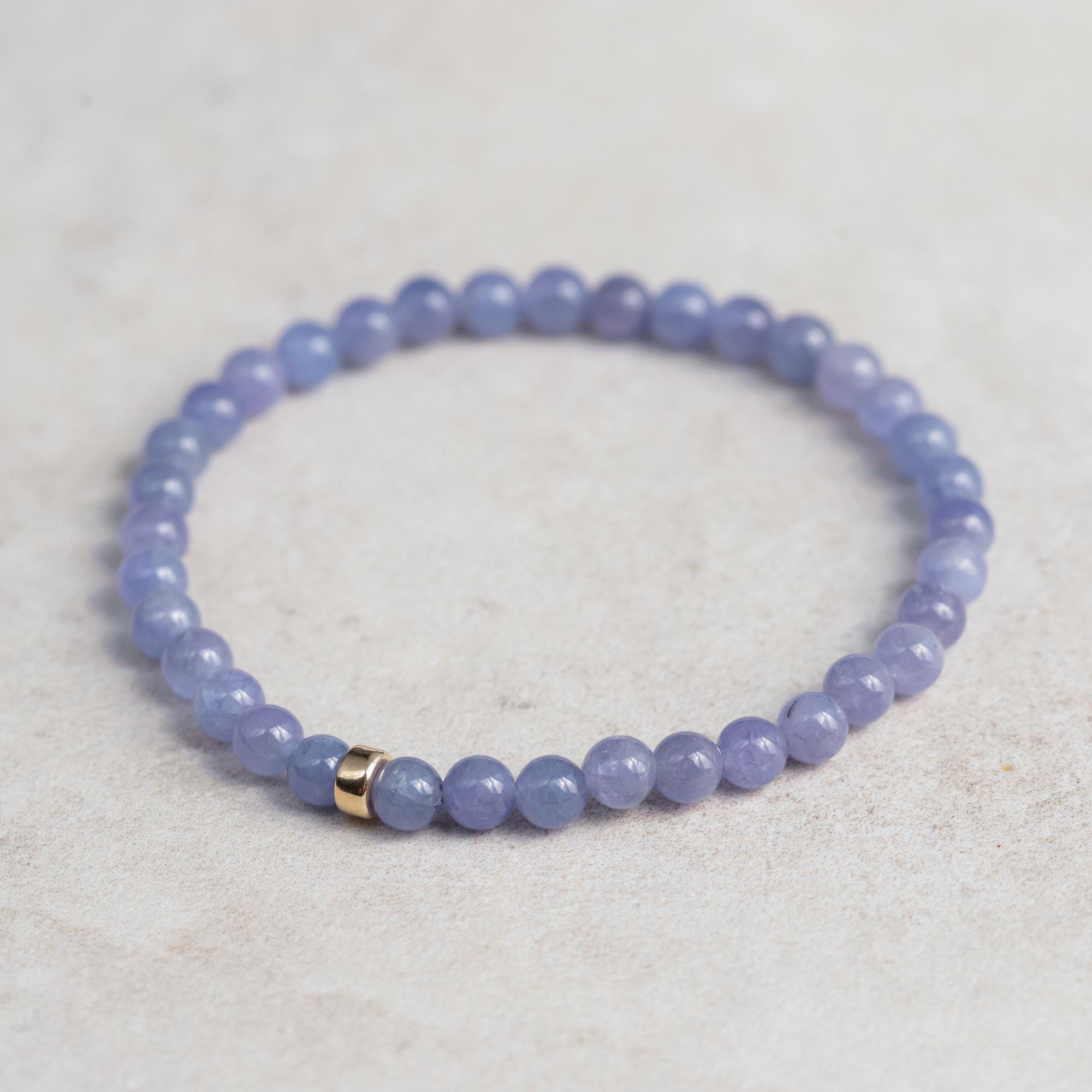 Details: • Handmade in Vancouver • Genuine AAAA+ tanzanite (smooth round, approx. 5mm) • Solid 14K gold rondel accent • Strung on durable stretch cord – no clasp • Multiple sizes available • 100% genuine gemstones
