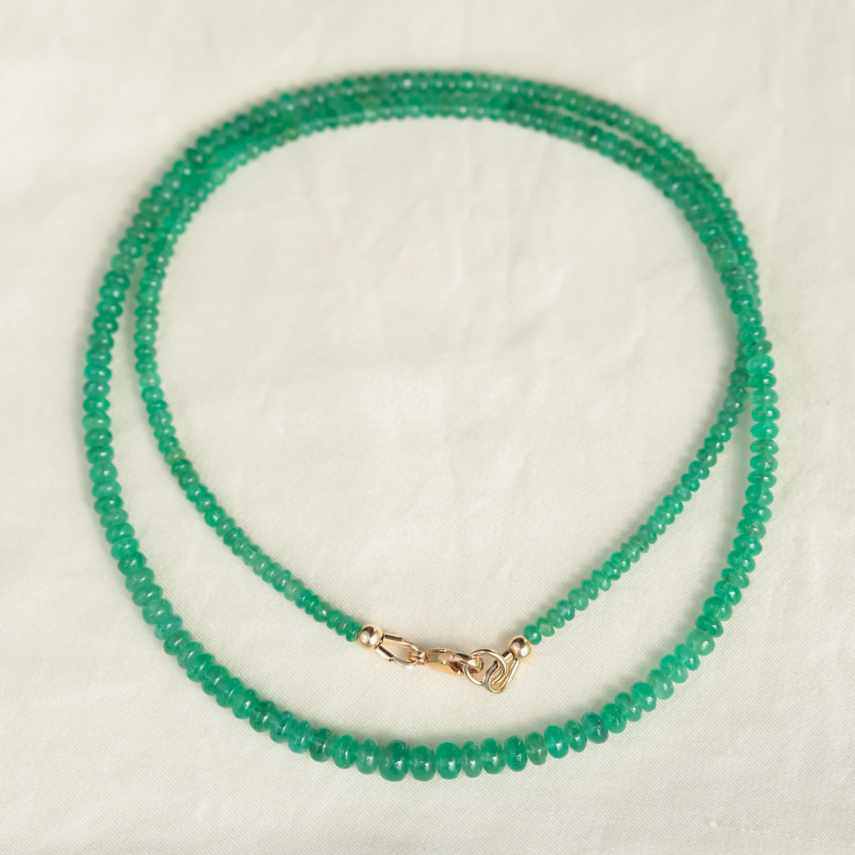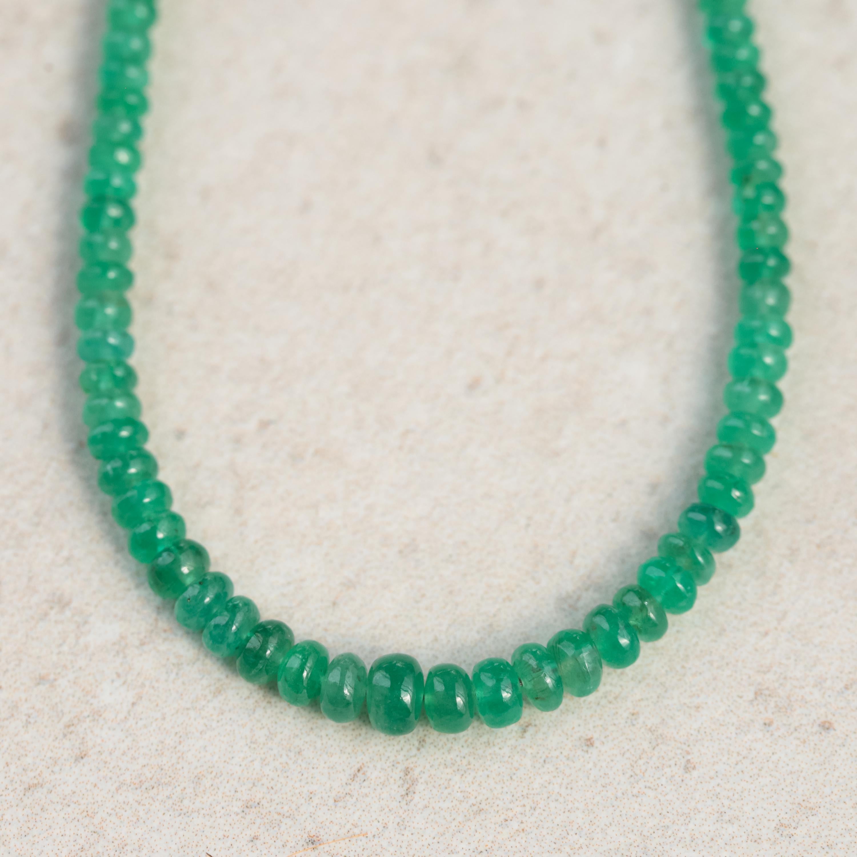 This exceptional necklace features AAAA+ Zambian emeralds in rich, smooth rondel cuts—chosen for their deep green glow and natural clarity. Strung with care and finished in solid 14K gold, including a refined lobster clasp, this piece is made to be treasured for a lifetime. A true heirloom of understated luxury and lasting significance.