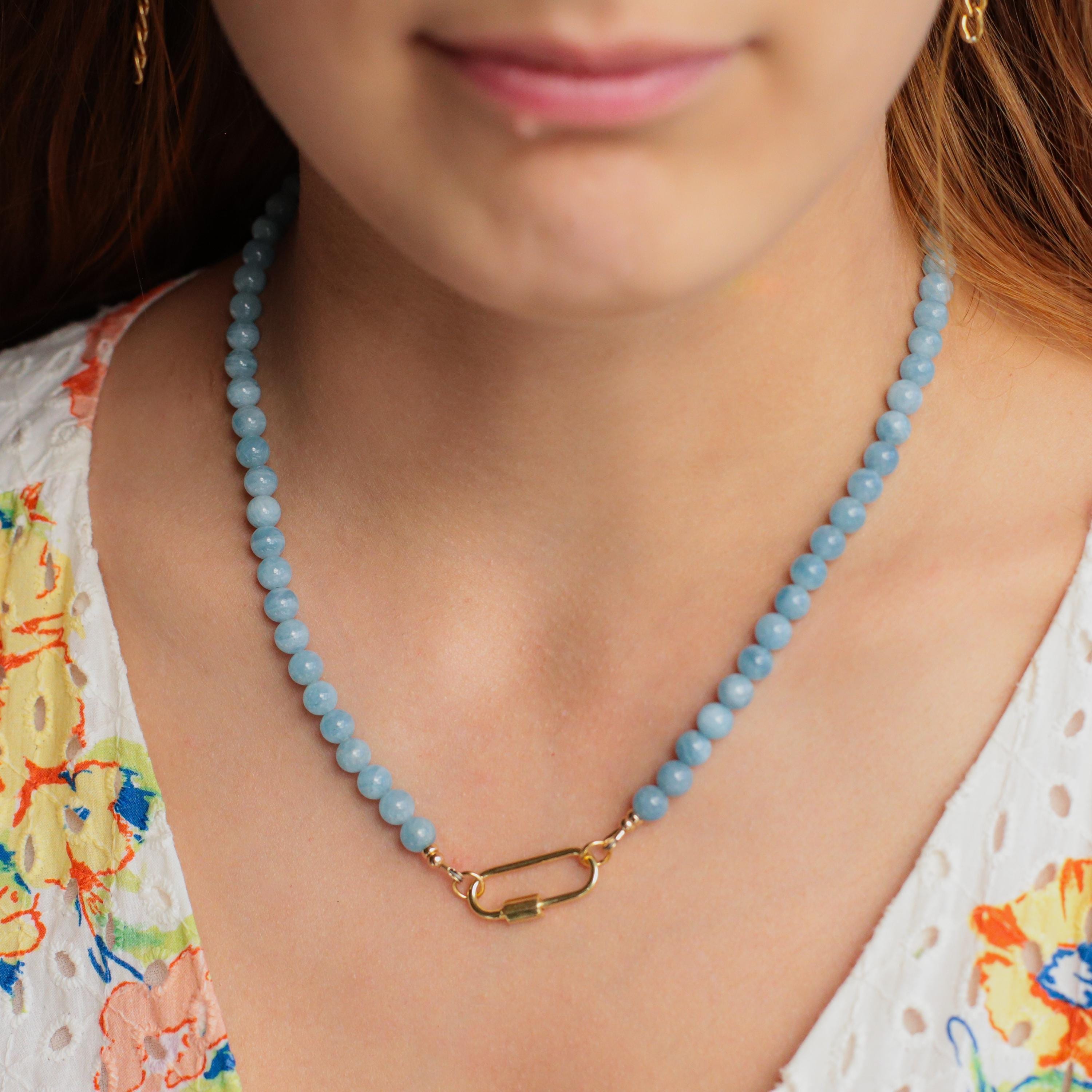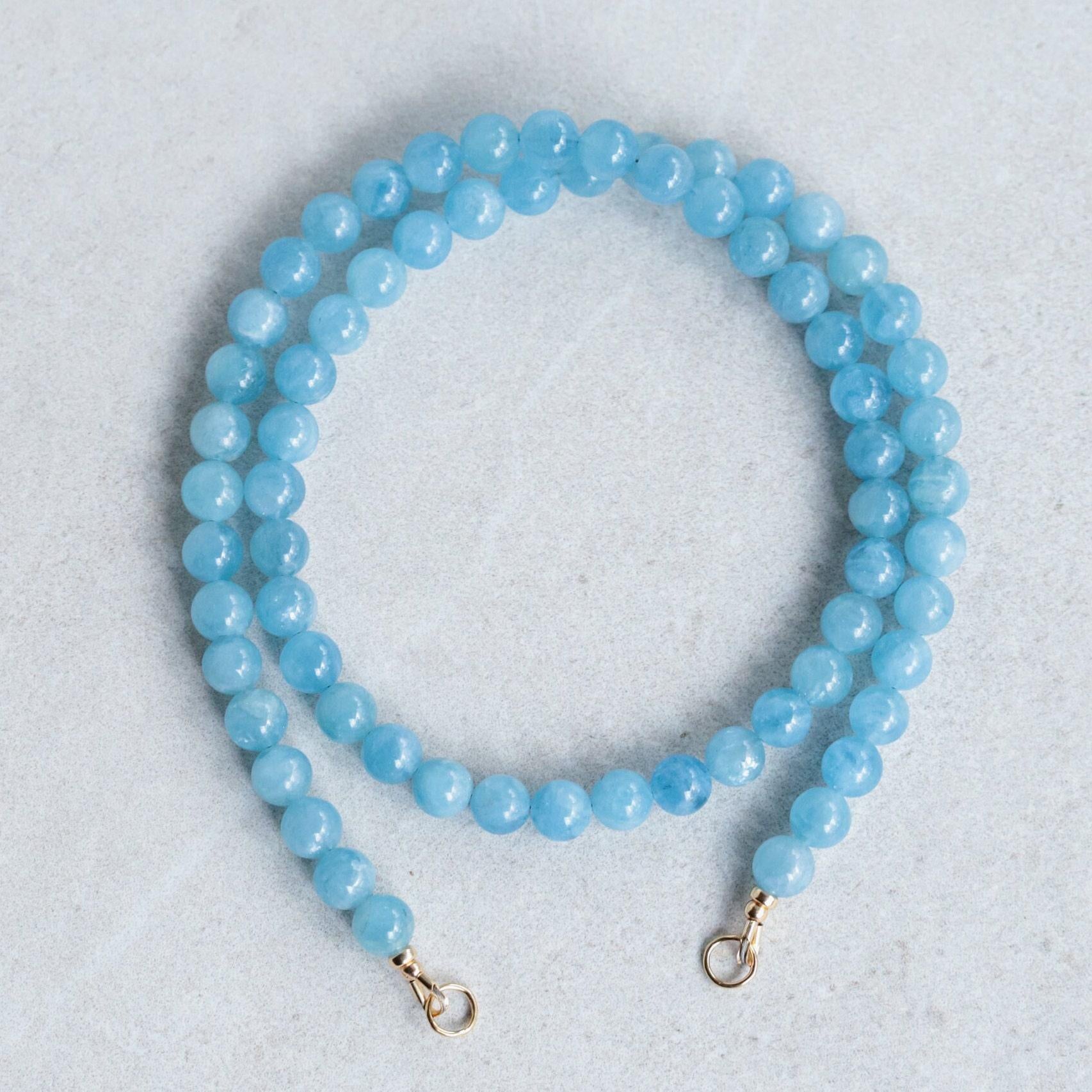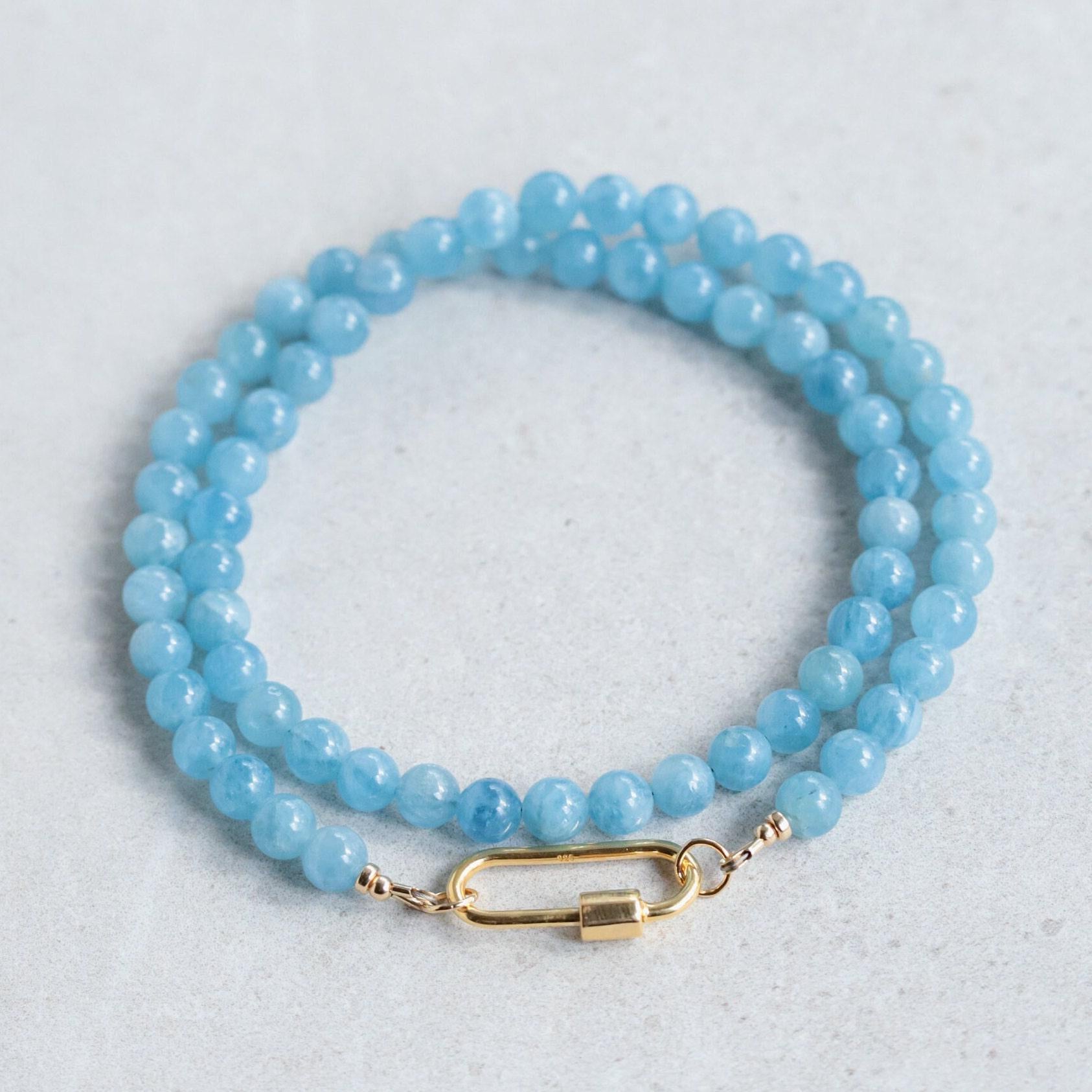 Details • Handmade in Vancouver • High-quality aquamarine (approx. 5.5mm) • 14K gold filled clasp and findings • High-quality gold vermeil carabiner (3 microns of gold over sterling silver) • Strand length: 18" (carabiner adds additional length when worn) • 100% genuine gemstones