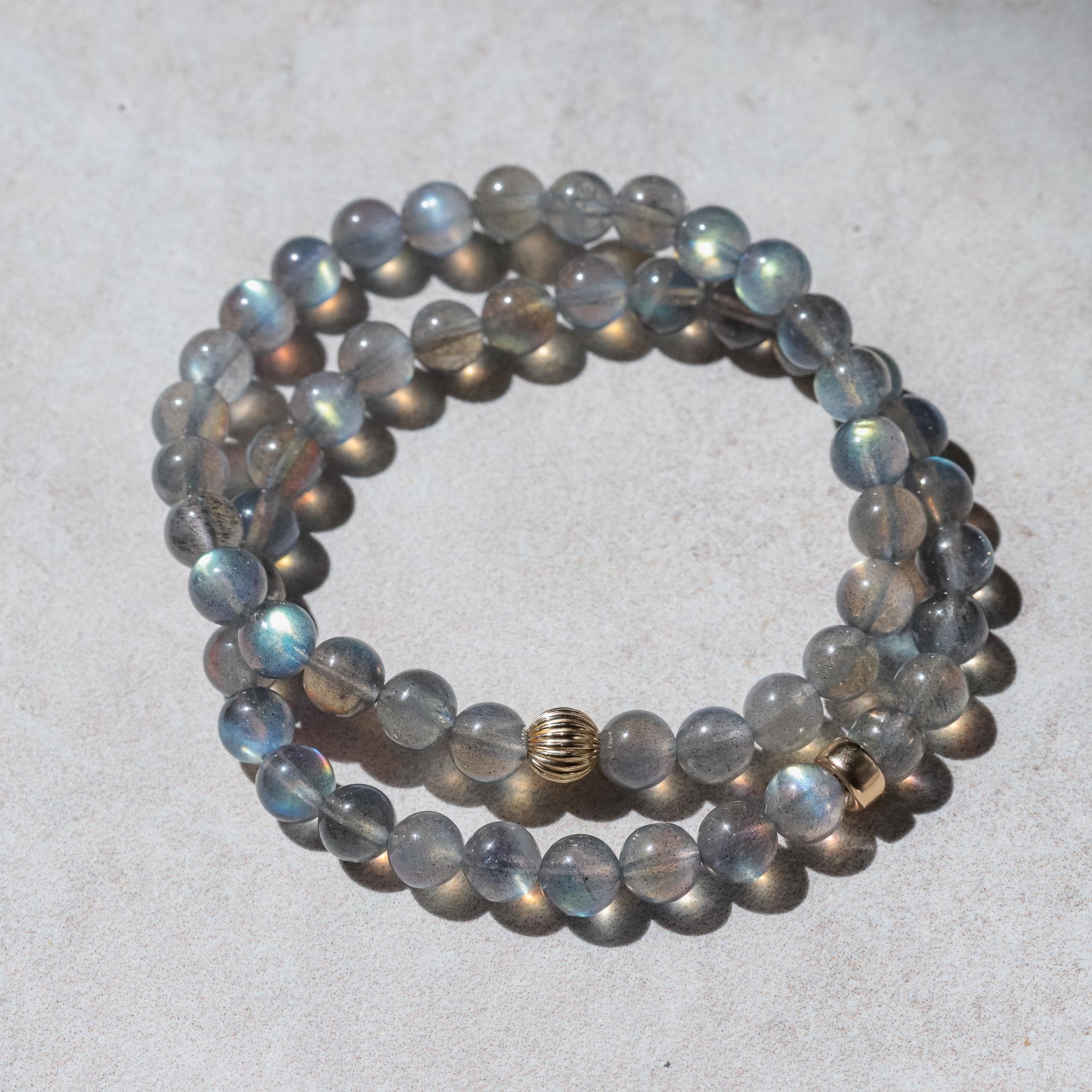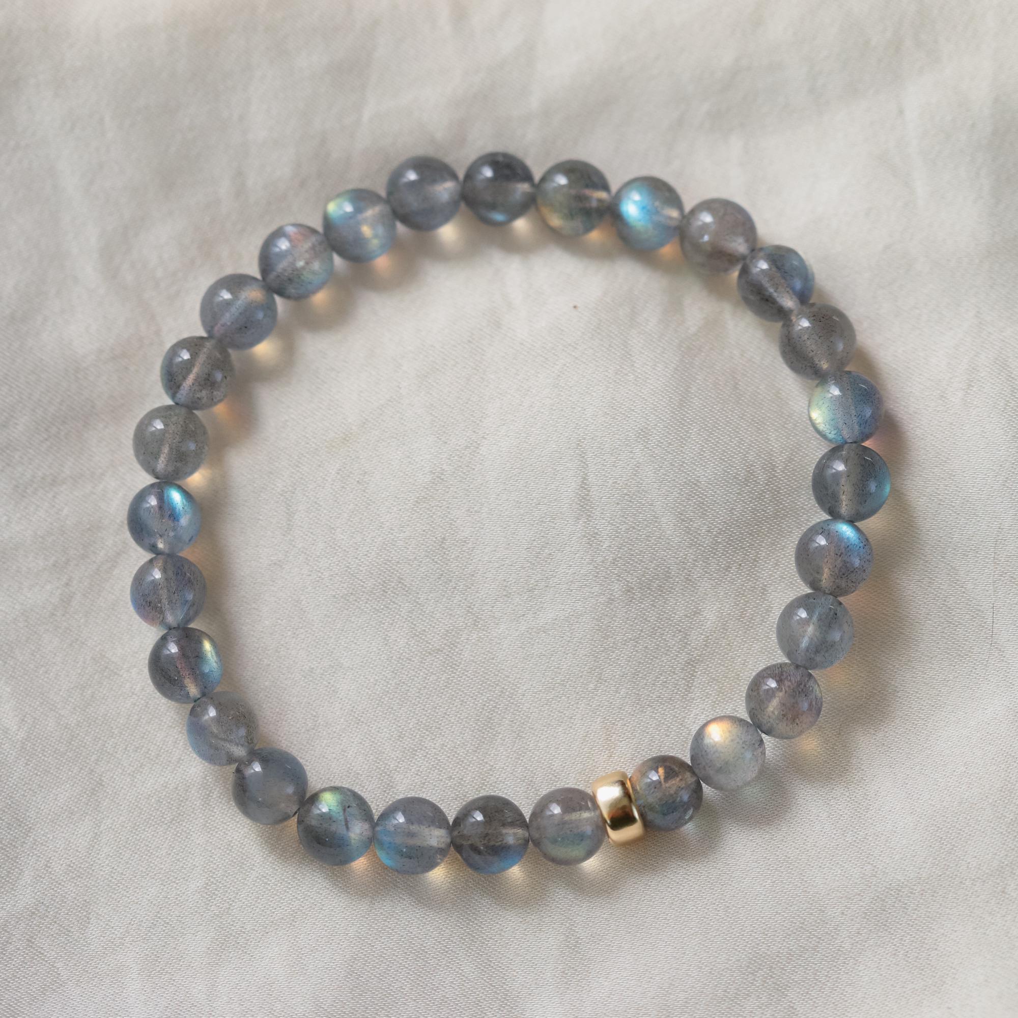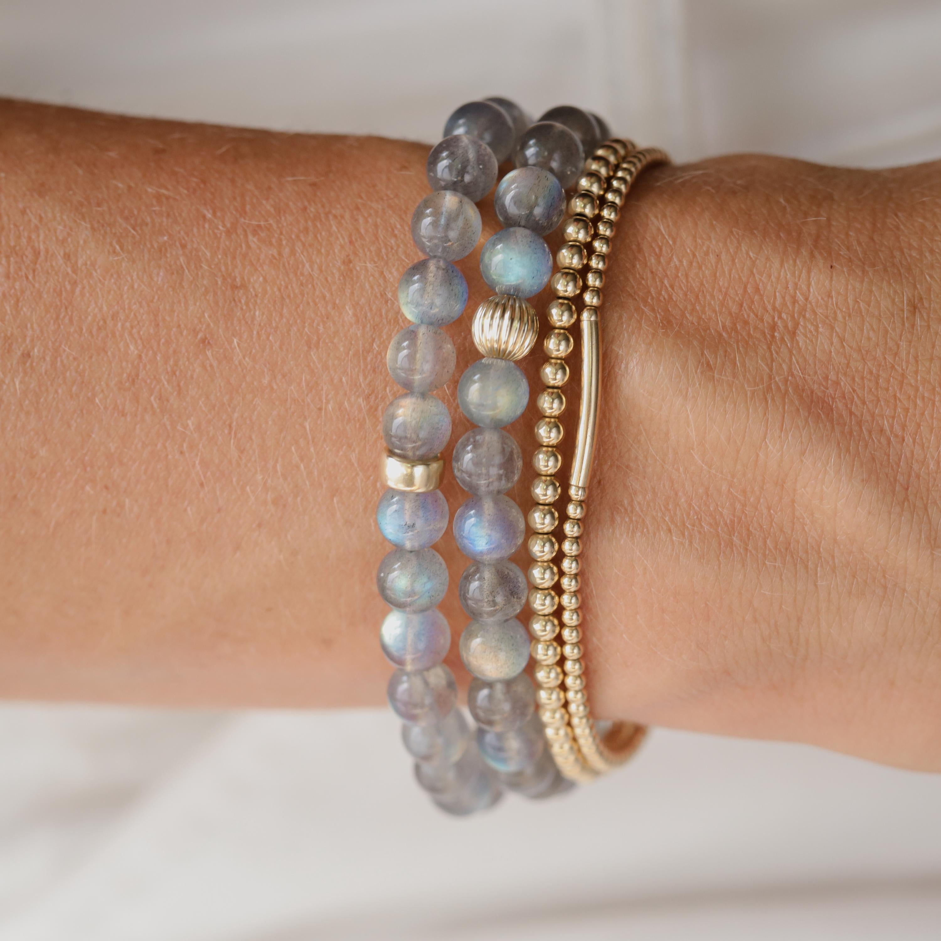 Crafted with exceptionally high-flash AAAA+ labradorite, this bracelet shimmers with every movement—revealing layers of light and energy. Known for its spiritual depth and connection to intuition, it’s a luminous, grounding addition to your stack. Finished with your choice of a solid 14K gold corrugated or rondel accent.