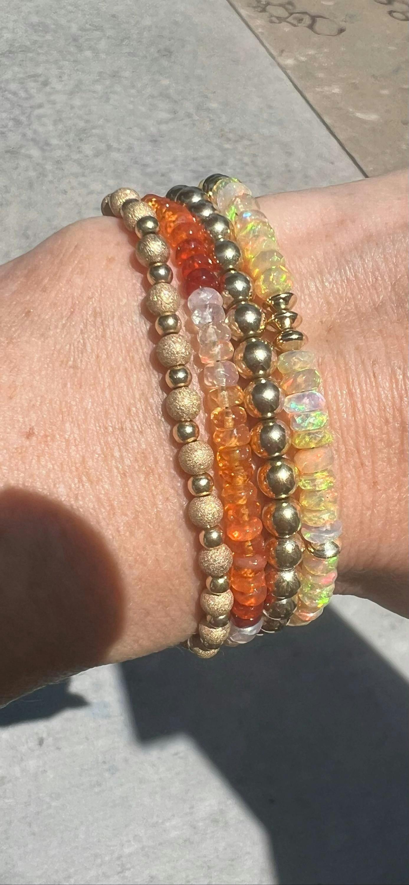 This radiant bracelet features AAAA+ Mexican fire opals in an ombré arrangement—ranging from golden amber to glowing orange. Each 4.5–5mm stone is gemmy, translucent, and light-catching, offering vibrant movement with every turn of the wrist. Finished with a solid 14K gold lobster clasp, this is a luxurious, high-vibration piece perfect for daily wear or stacking.