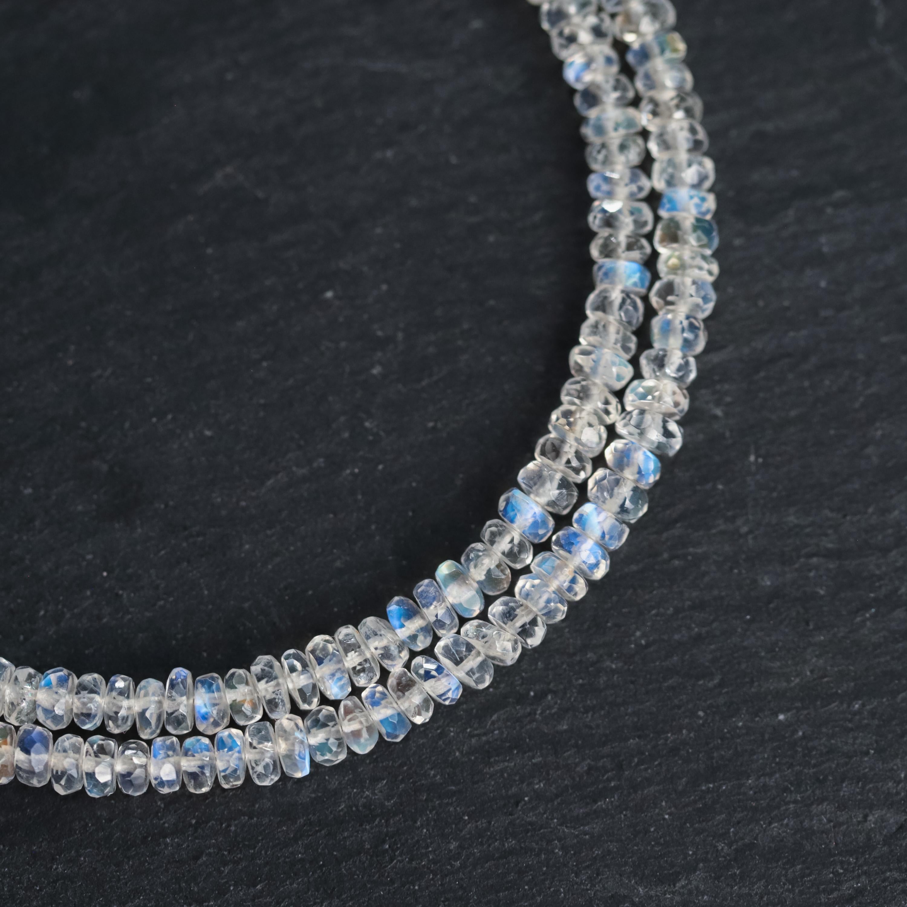 Crafted with AAAA+ faceted rainbow moonstone, this luminous strand glows with soft iridescence and electric blue flash — an elegant reflection of intuition, inspiration, and new beginnings.