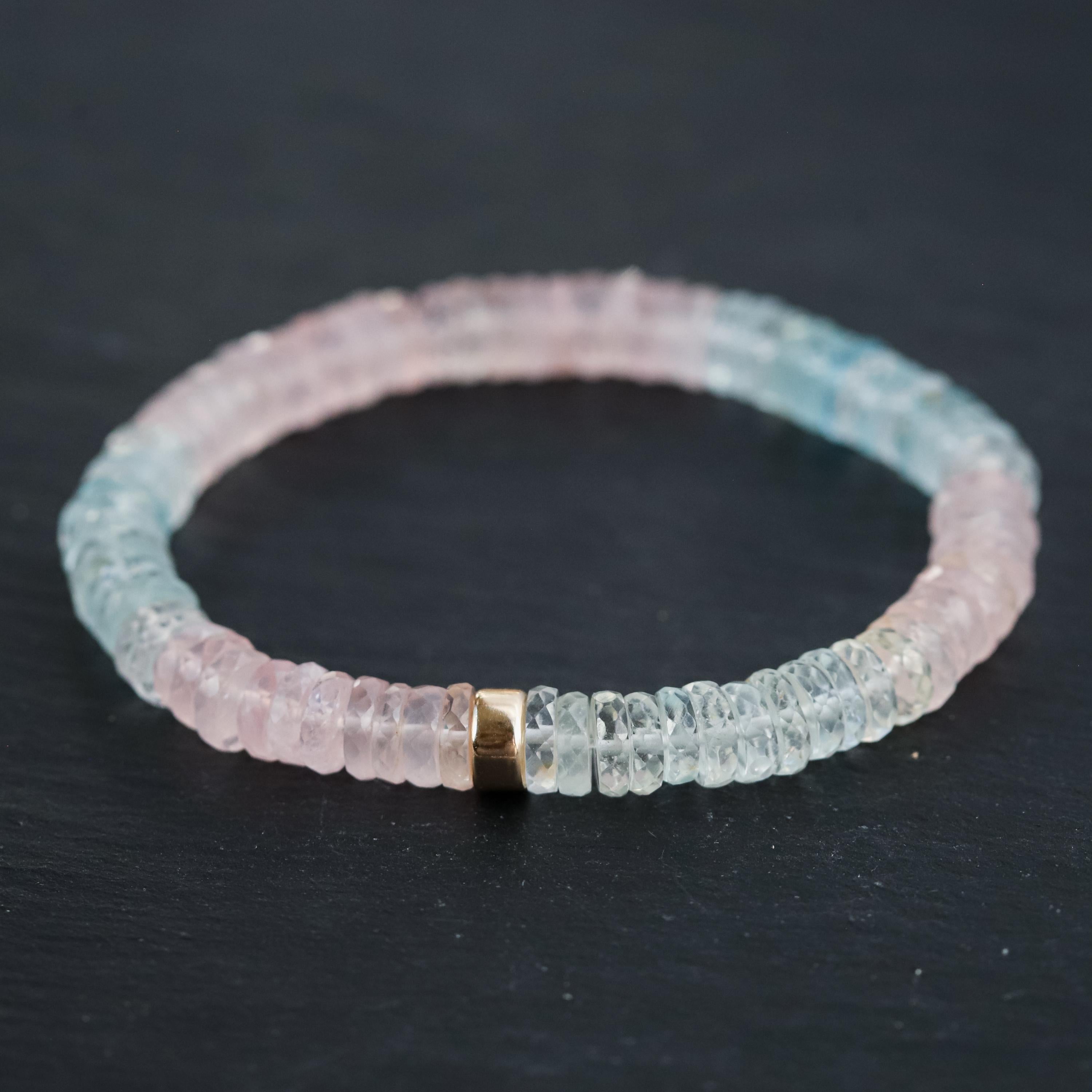 This dreamy bracelet features a pastel palette of natural beryl and morganite—cut in a smooth 6mm heishi shape for a modern, grounded feel. Finished with a solid 14K gold accent bead, it’s a gentle and joyful piece made for everyday ease.