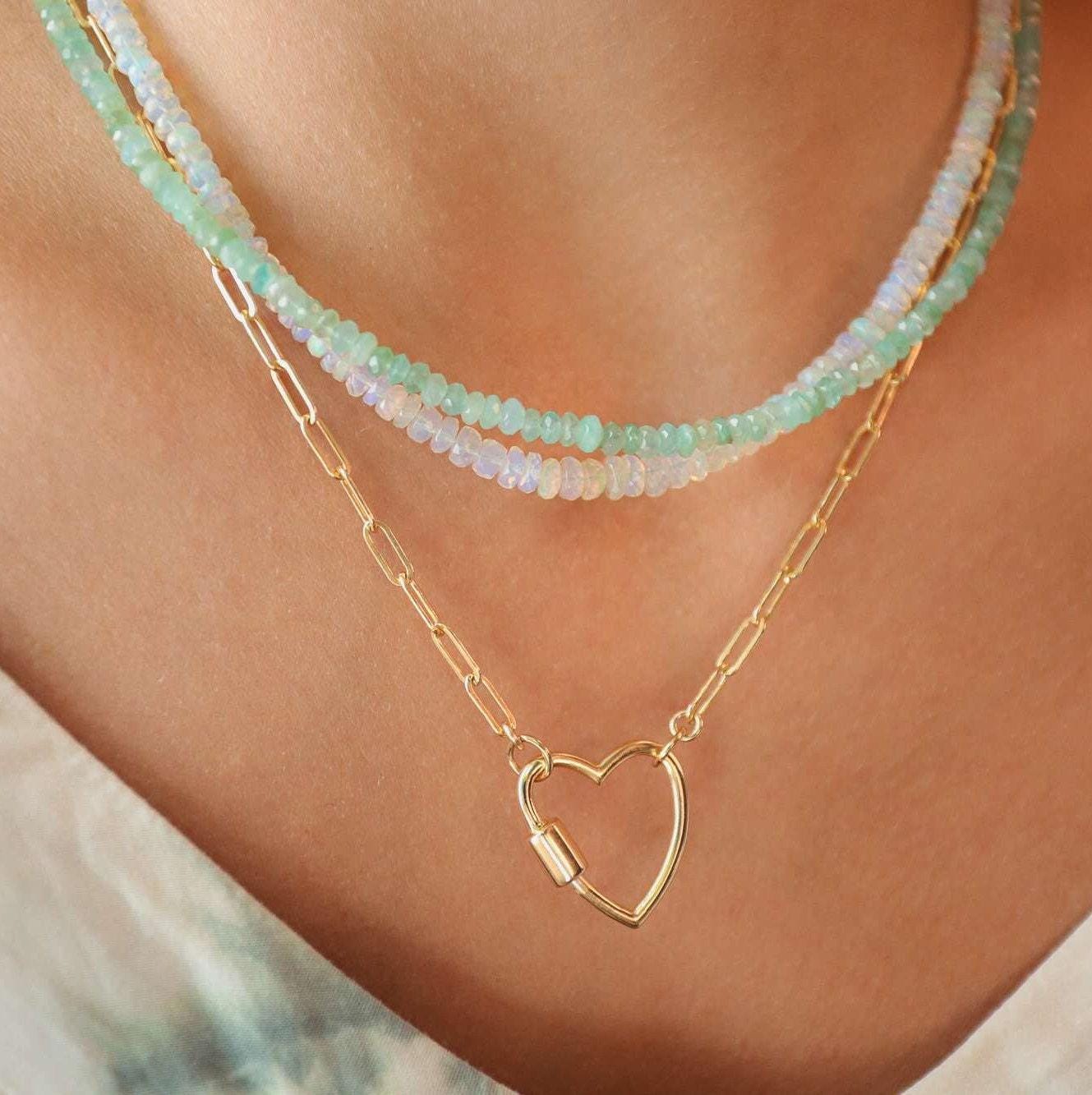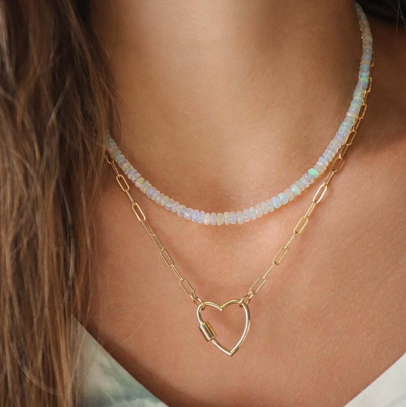 Crafted with natural, untreated Ethiopian opals, this luminous strand radiates gentle fire and emotional depth. The faceted cut enhances each stone’s unique play of color, while a solid 14K gold spring clasp completes the piece with timeless elegance. A delicate, light-filled necklace made for everyday wear and quiet magic.