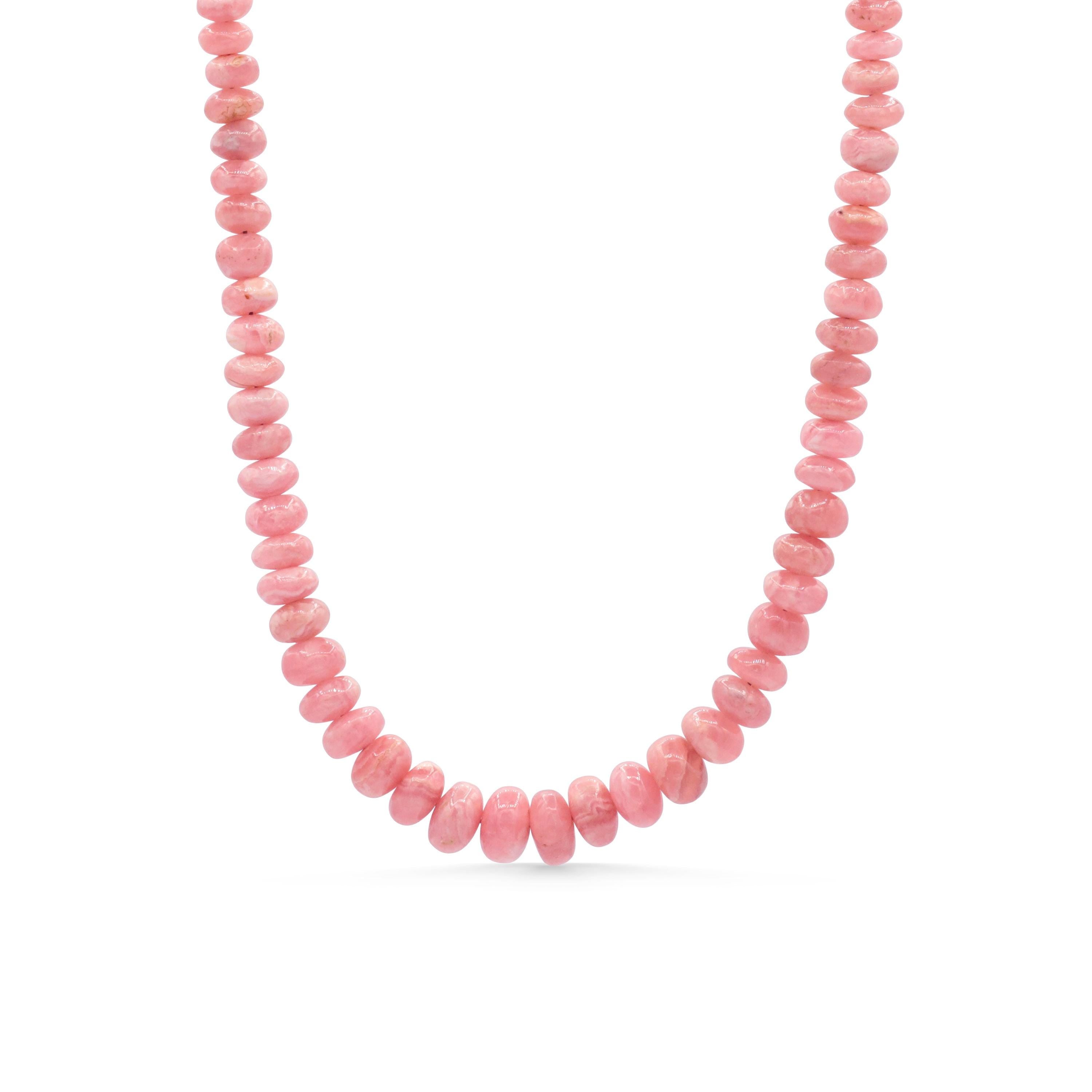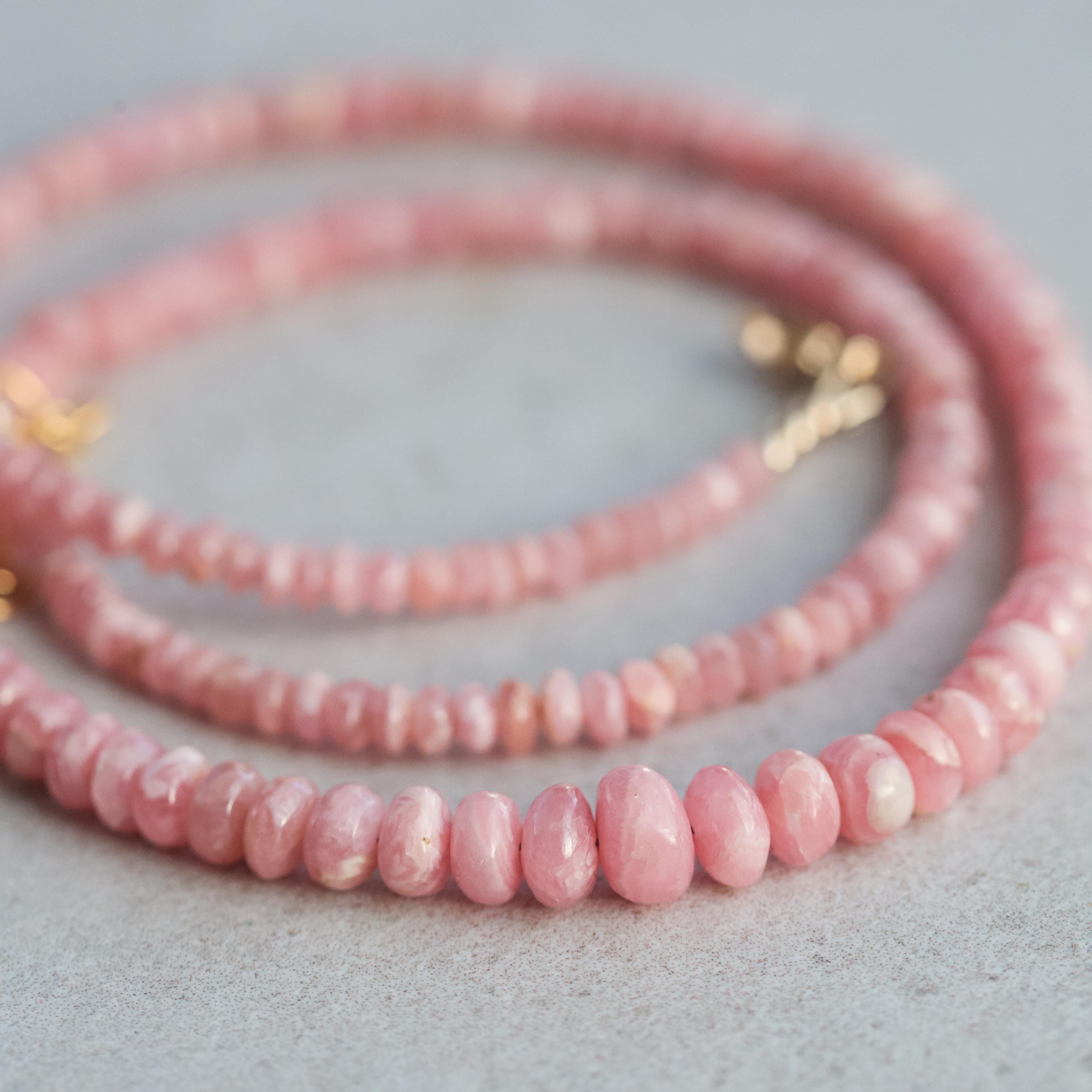 This radiant necklace features AAAA+ natural rhodochrosite in softly varied hues, ranging from blush pink to earthy rose. The 3–6.5mm rondelle beads are hand-strung to highlight the natural beauty and subtle variation of each stone—making every piece one of a kind.