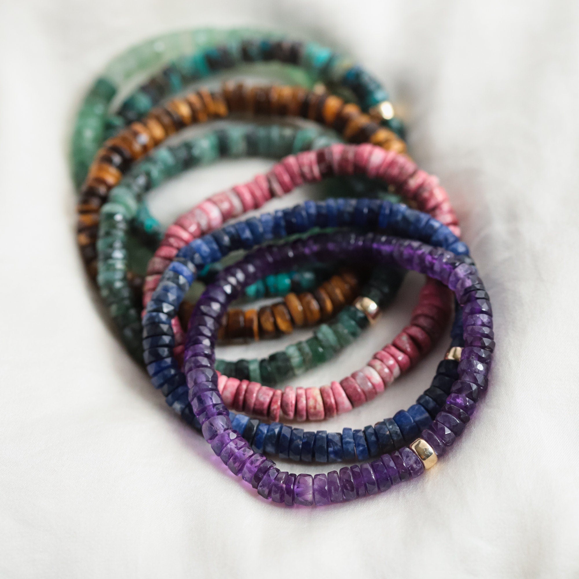Strung on a durable stretch cord for easy everyday wear and finished with your choice of 14K gold filled, sterling silver, or solid 14K gold accent.