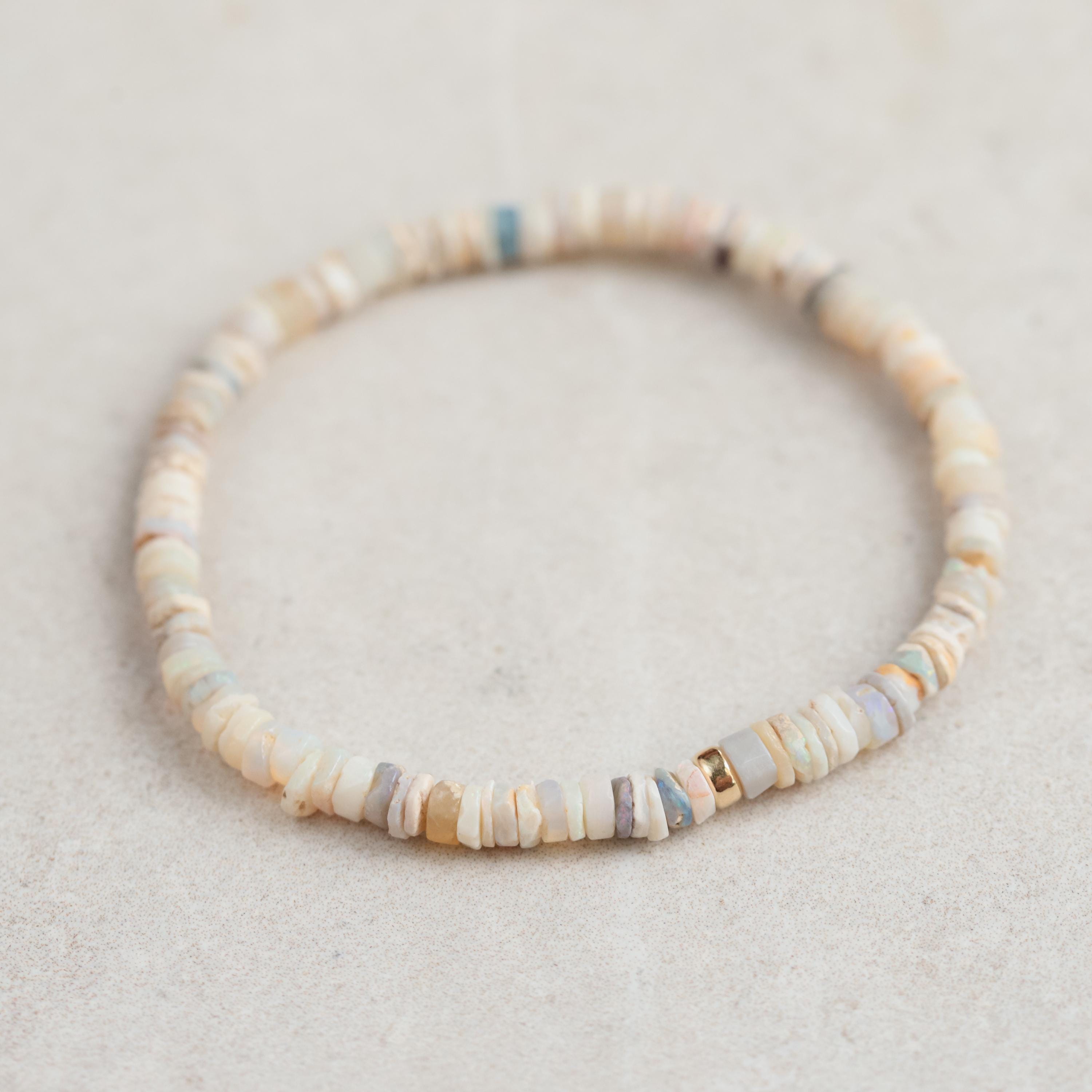 Details • Handmade in Vancouver • Australian opal heishi beads (approx. 4.5mm) • Choice of sterling silver, 14K gold filled, or solid 14K gold rondel • Stretch style — easy to slip on • 100% genuine opal