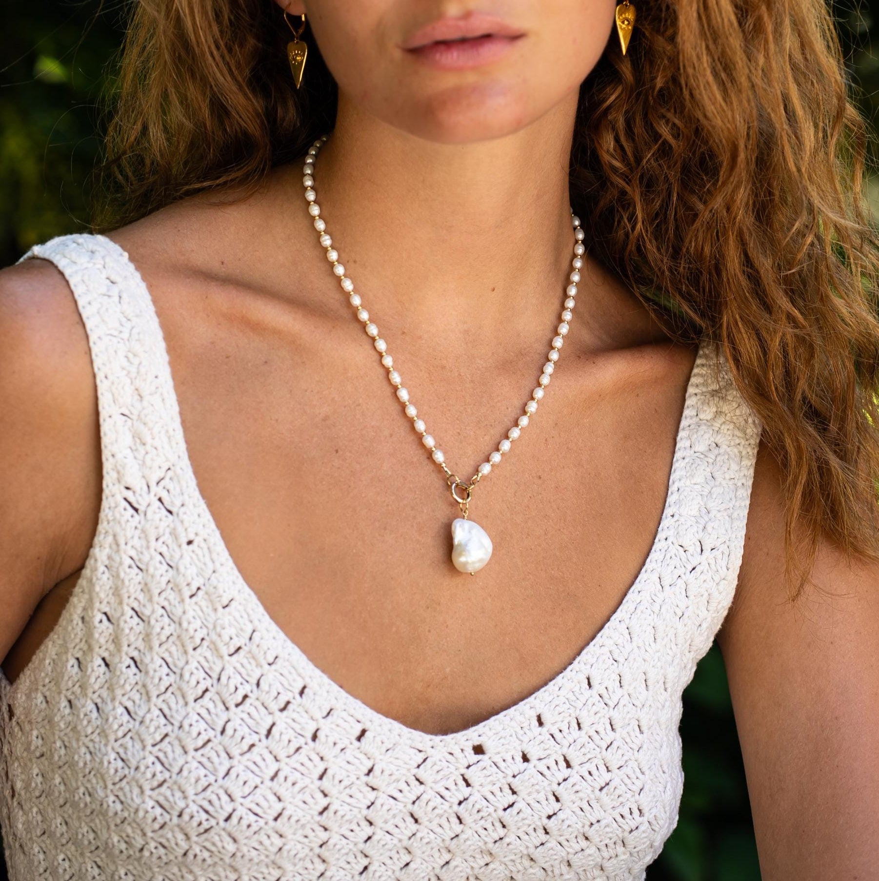 Details • Genuine freshwater pearls • Removable freshwater pearl pendant • Components available in sterling silver or 14K gold filled • Choice of carabiner: oval screw or 10mm circle • Strand length: 18" (carabiner adds additional length when worn) • Handmade in Canada • 100% genuine materials