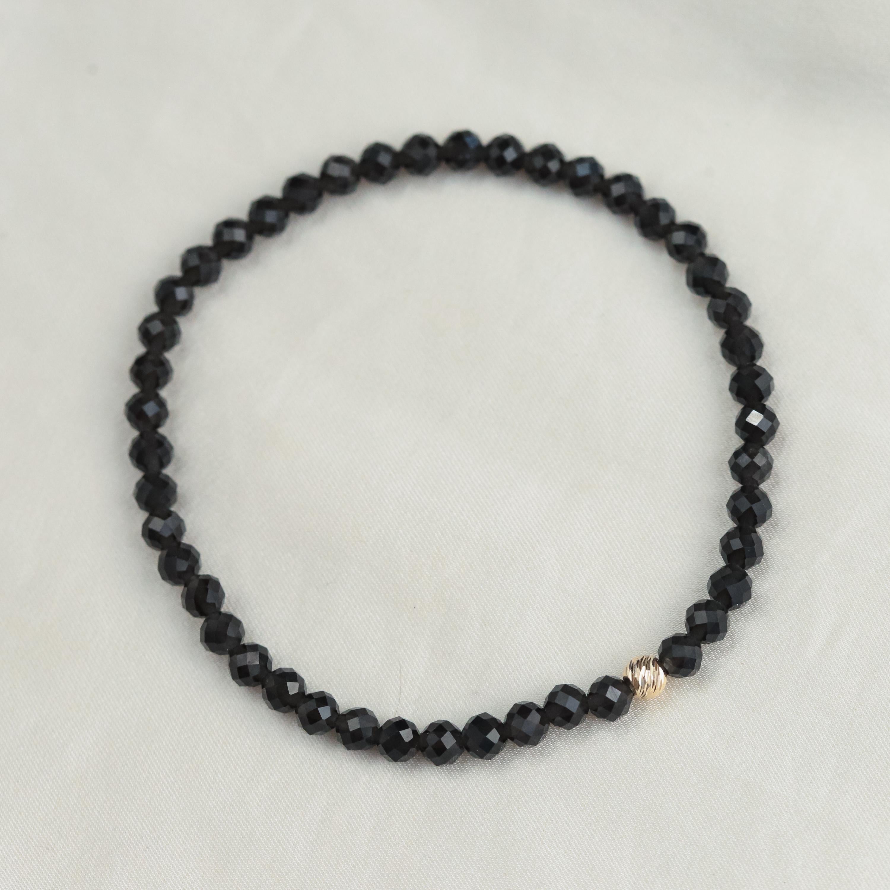 • Genuine faceted black obsidian (4mm) • Solid 14K gold accent bead • Handmade in Vancouver • Strung on durable stretch cord for easy wear • 100% genuine gemstones