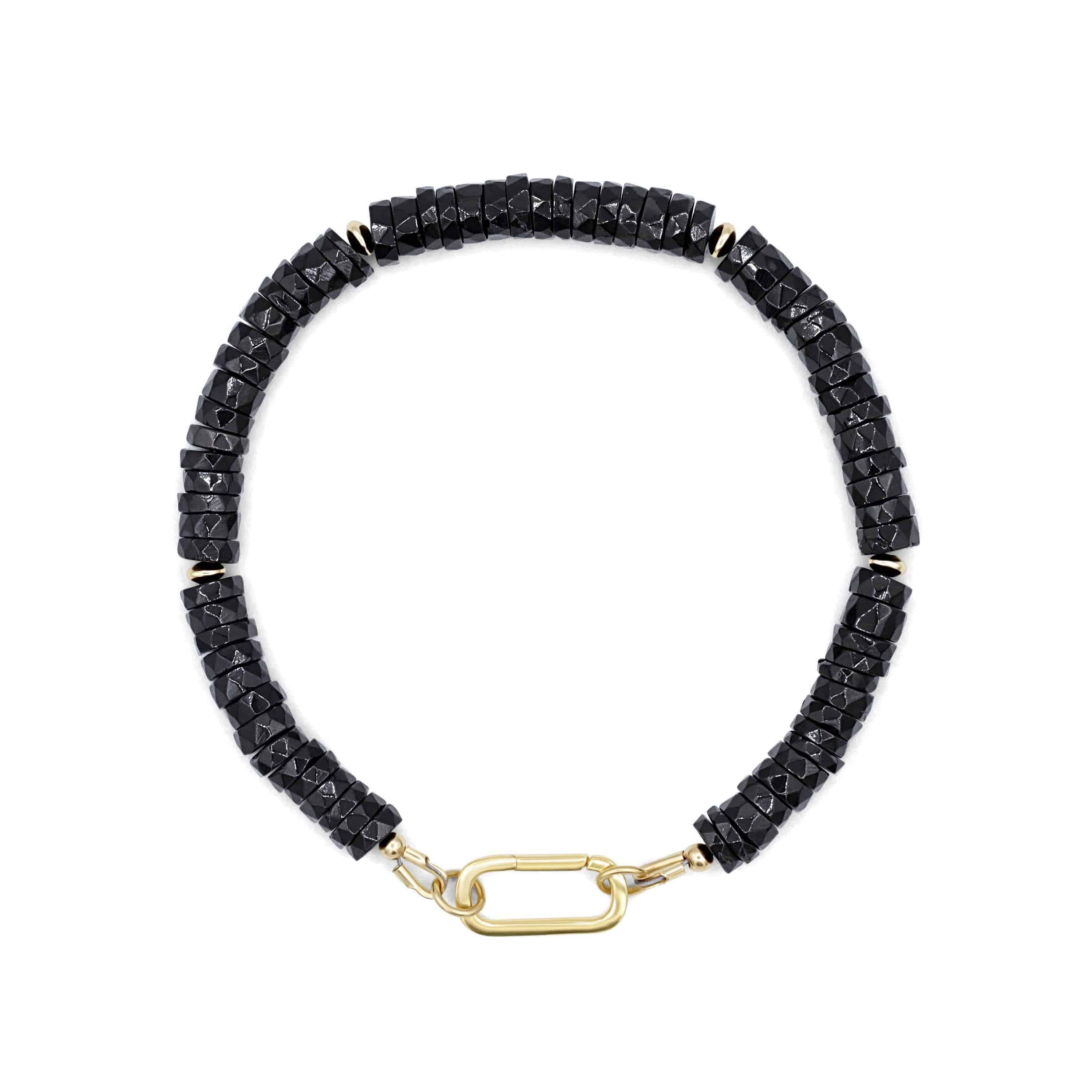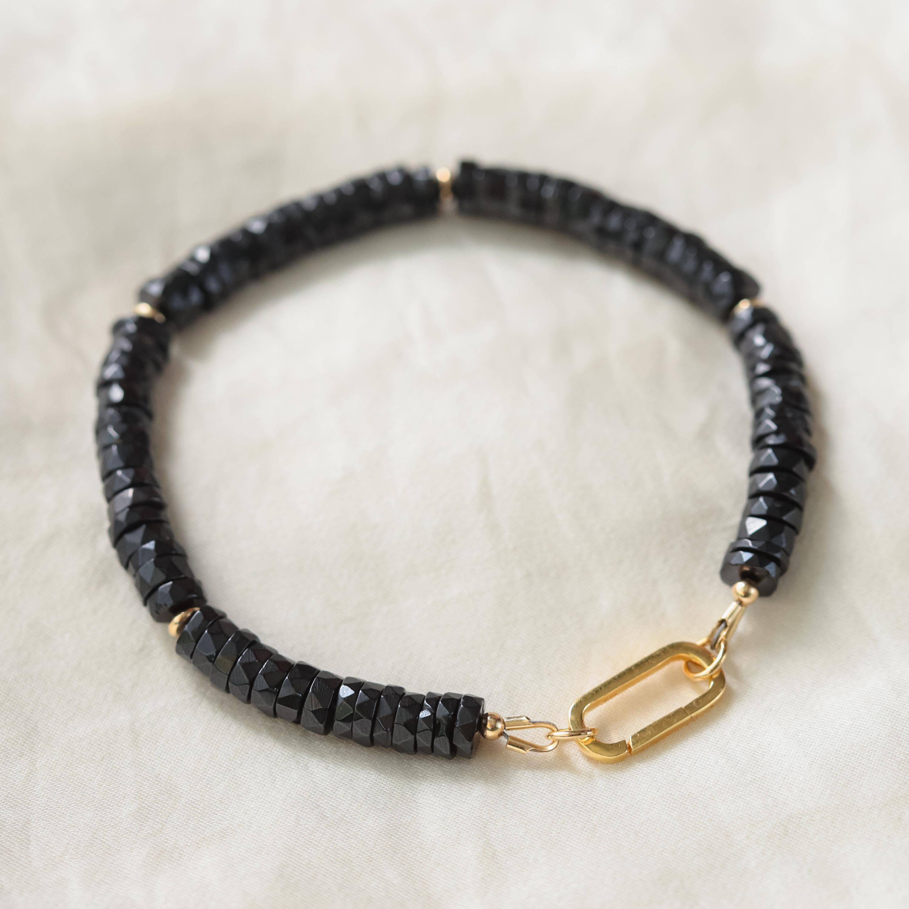 Crafted with genuine 5.5mm black spinel, this bracelet is a bold, grounding staple known for its energy of strength, stamina, and protection. Choose your finish — sterling silver, gold vermeil with 14K gold filled accents, or solid 14K gold — and style it your way. Each bracelet features a front-clasp carabiner designed to hold your favorite charms or to be worn as a clean, modern statement on its own.