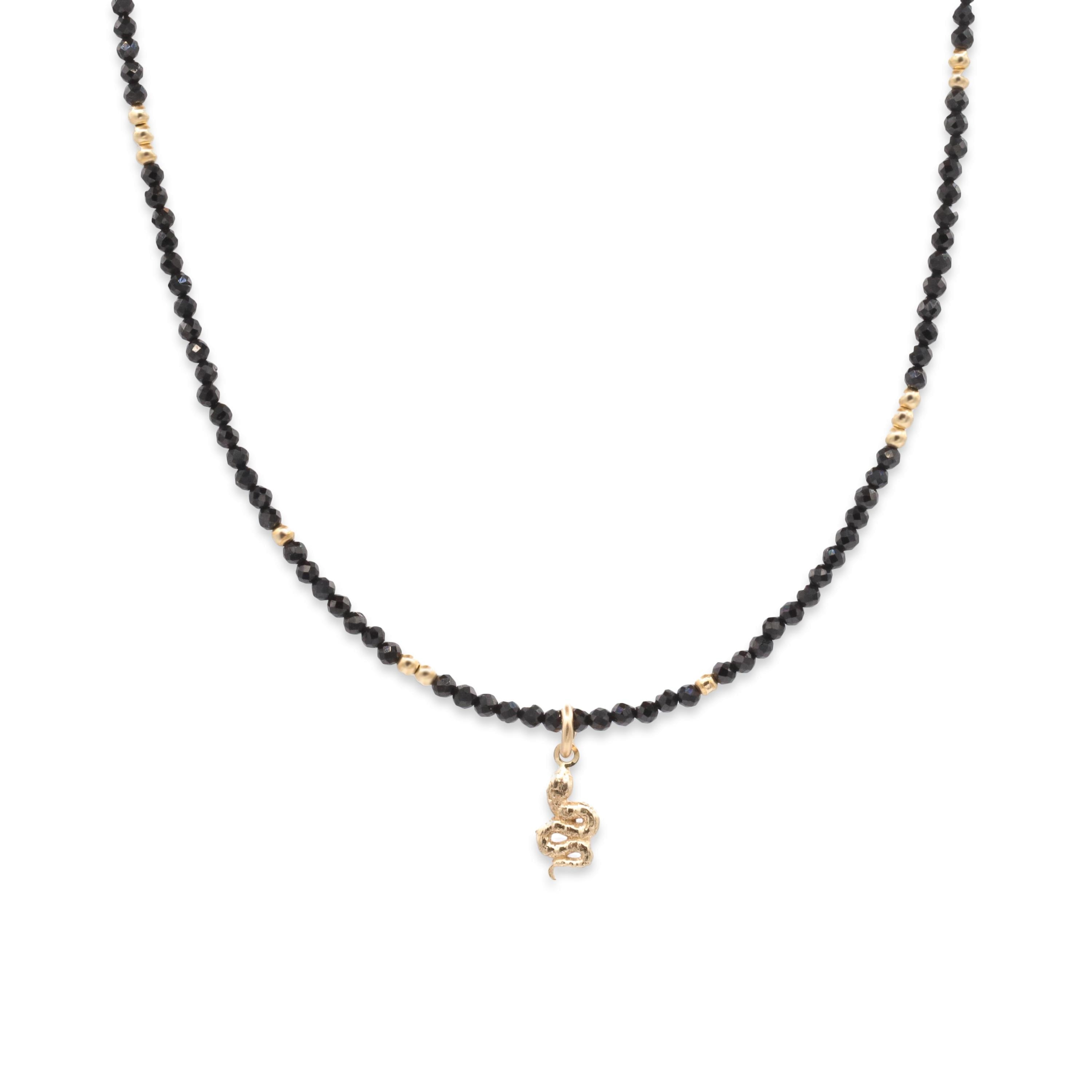 This powerful yet delicate necklace is crafted from genuine 2mm black spinel beads—known for their grounding, protective energy. Finished entirely in solid 14K gold and adorned with a symbolic snake pendant, it’s a bold, minimal piece that carries both edge and elegance. Perfect for layering or wearing solo as a statement of strength.