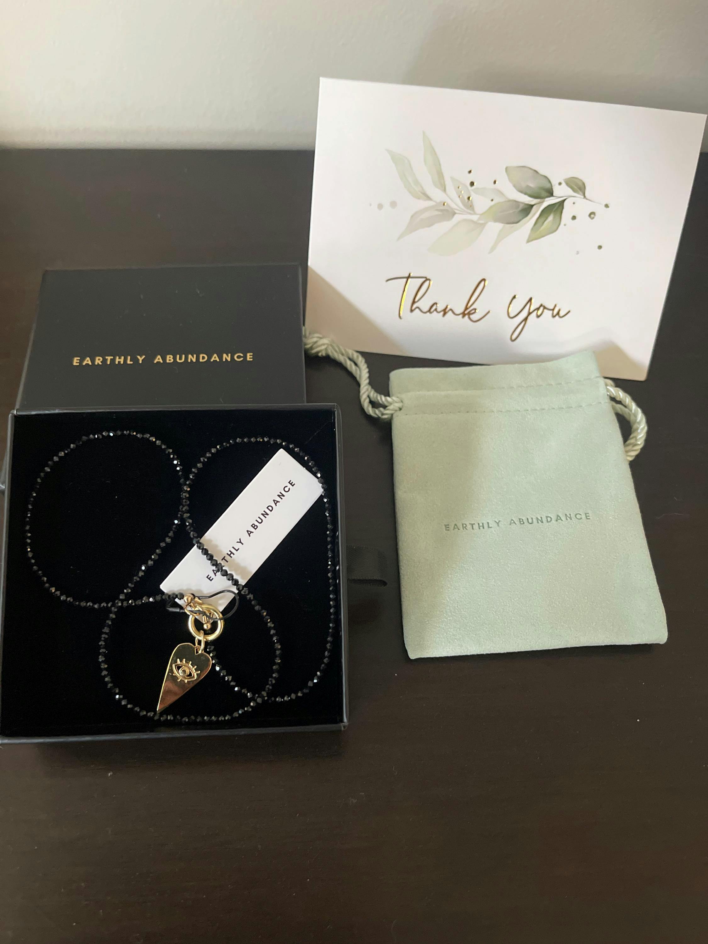 Minimal yet powerful, this three-piece set is crafted with genuine black spinel—known for its protective and grounding energy. The delicate 2mm strand is paired with a 10mm gold vermeil carabiner and a symbolic heart evil eye pendant, giving you endless styling options. Wear the strand on its own, layer with your favorite pendants, or mix and match the included pieces for a bold, personalized look.