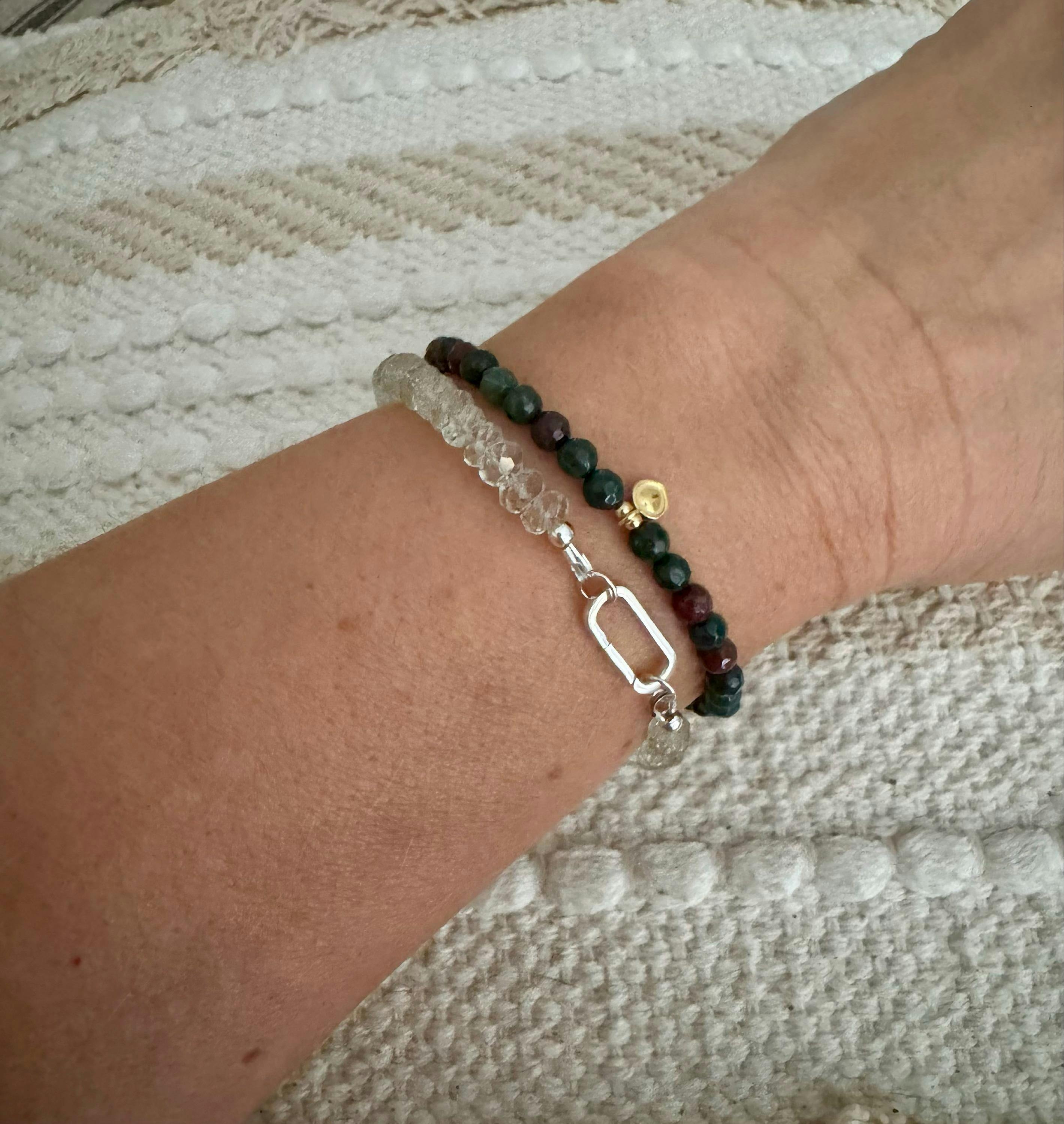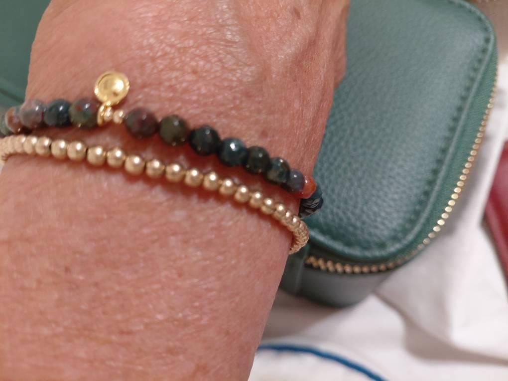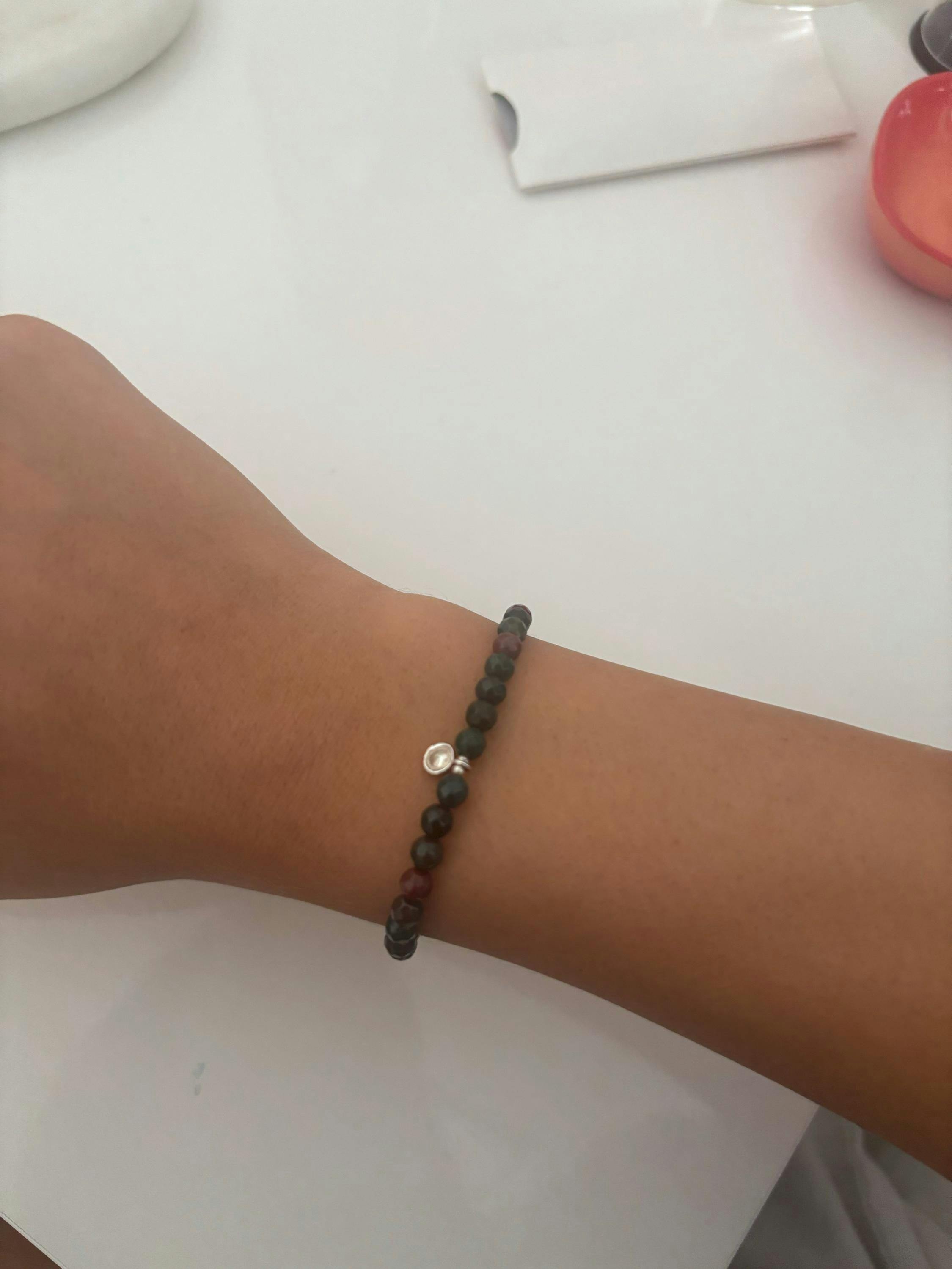 Grounding and quietly powerful, this bracelet features genuine 4mm bloodstone with earthy green tones and natural variation. A gold vermeil heart charm adds a soft, symbolic touch to this protective and intuitive piece.