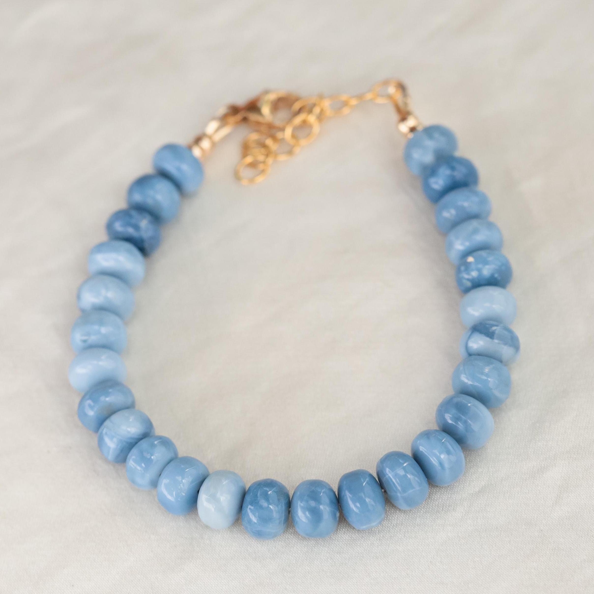 This calming bracelet features smooth 7.5mm blue opal beads, offering soft color and soothing energy. Finished with a 14K gold filled clasp and extender, it's a beautiful, everyday piece—elegant on its own or stacked with your favorites.