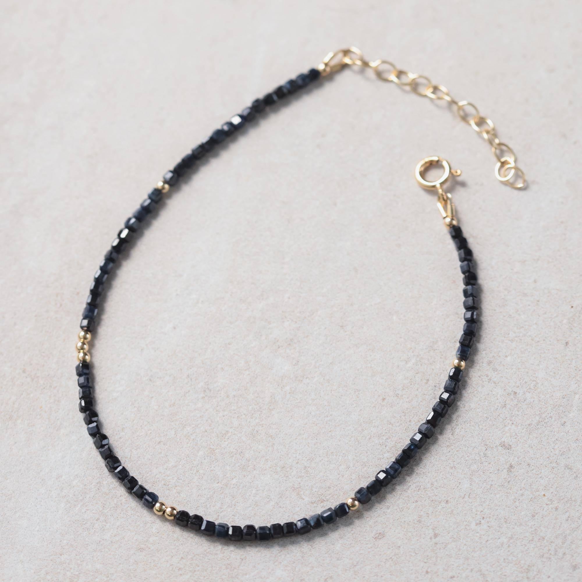 • Handmade in Vancouver, Canada • Genuine blue sapphire (approx. 2.5–3mm faceted cut) • Choice of finish: – Sterling silver – 14K gold filled – Solid 14K gold • Accent beads, spring clasp (5.9mm), and extender in selected metal • Length options: 9"–10" or 10"–11" • 100% genuine gemstones