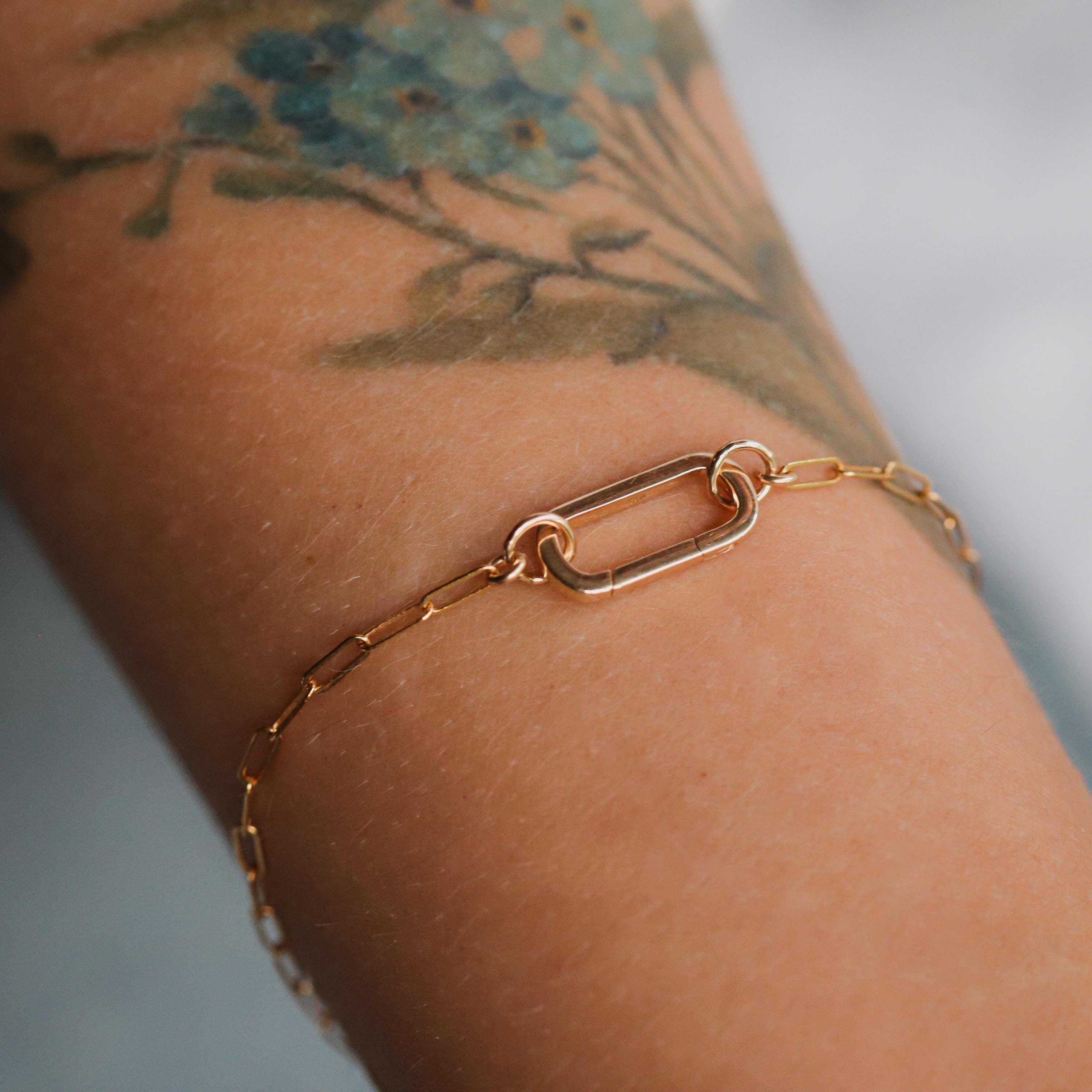 Delicate and easy to wear, this extra-small paperclip chain bracelet adds a subtle edge to your everyday look. Choose your favorite closure—classic circle snap, modern rectangle, or crescent moon carabiner—for a personalized finish. Each piece is handmade in Vancouver with care and intention.