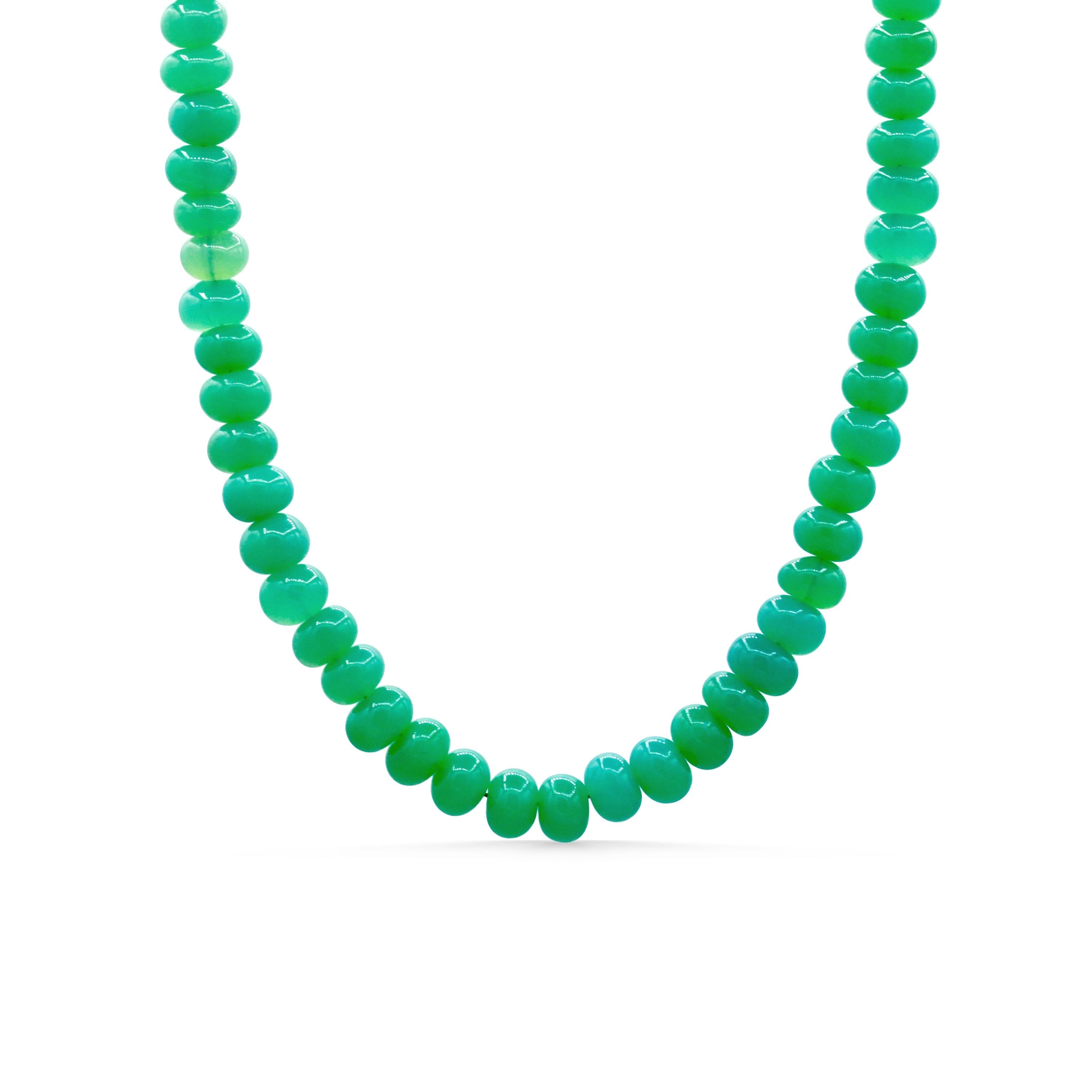 A vivid strand of smooth chalcedony rondelles, chosen for their bright, uplifting green tone and soft translucence. Each 6mm bead has a polished, modern presence — bold enough to wear on its own, yet effortlessly wearable for everyday. Finished with your choice of sterling silver, 14K gold filled, or solid 14K gold components, this necklace brings a refined, fresh burst of colour to any collection.