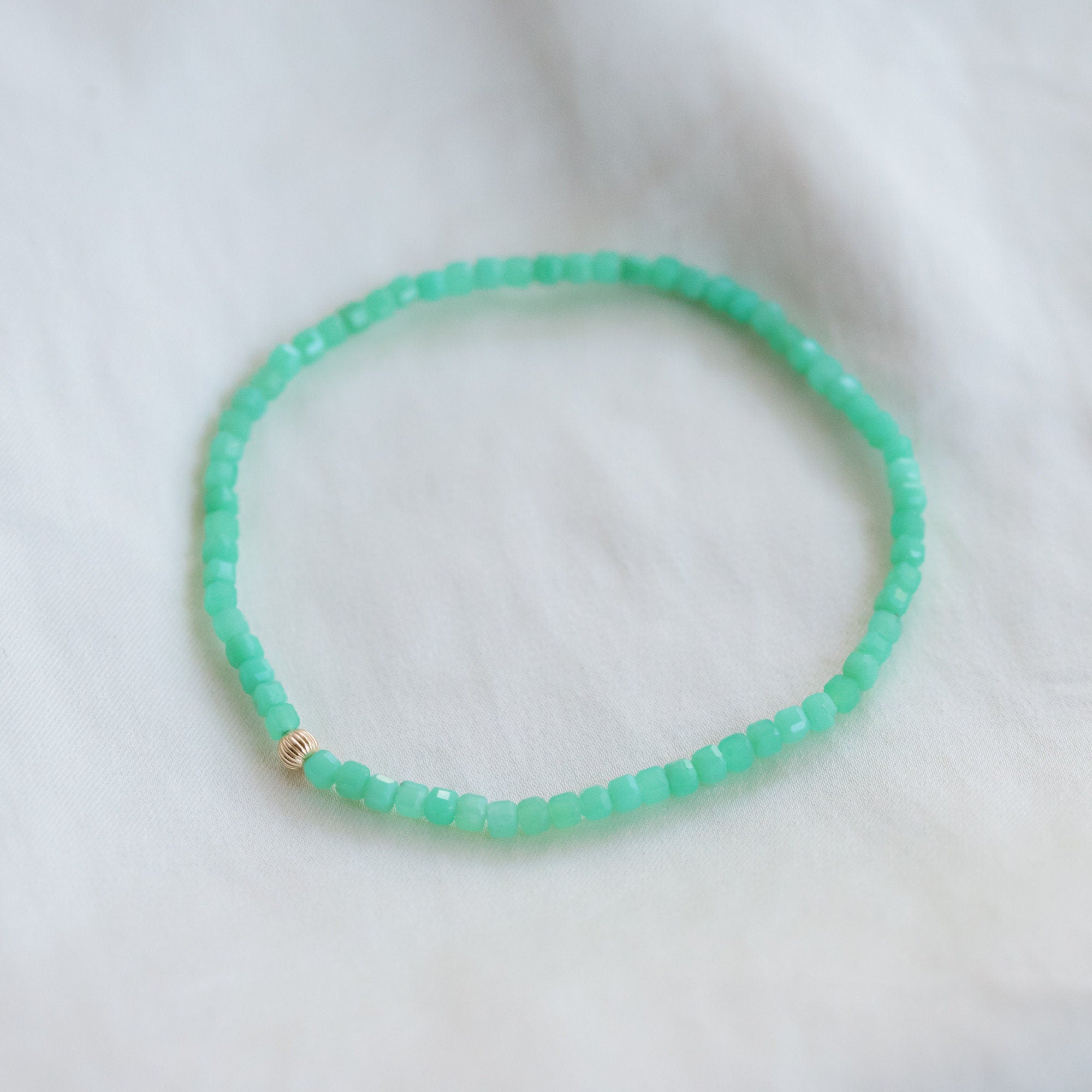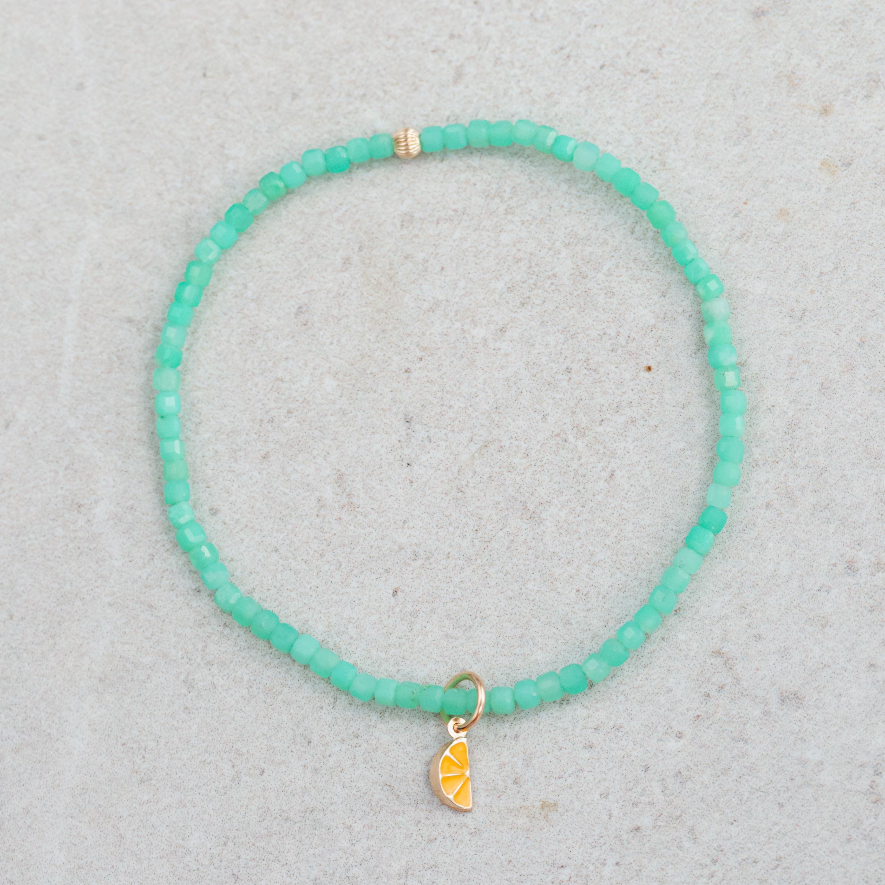 Fresh, vibrant, and full of heart, this dainty stretch bracelet features genuine 2.5mm chrysoprase beads in a soft green hue. Choose your finishing touch: a minimalist solid 14K gold bead or a playful lemon enamel charm in solid gold. Designed for stacking, gifting, or everyday wear with meaning.