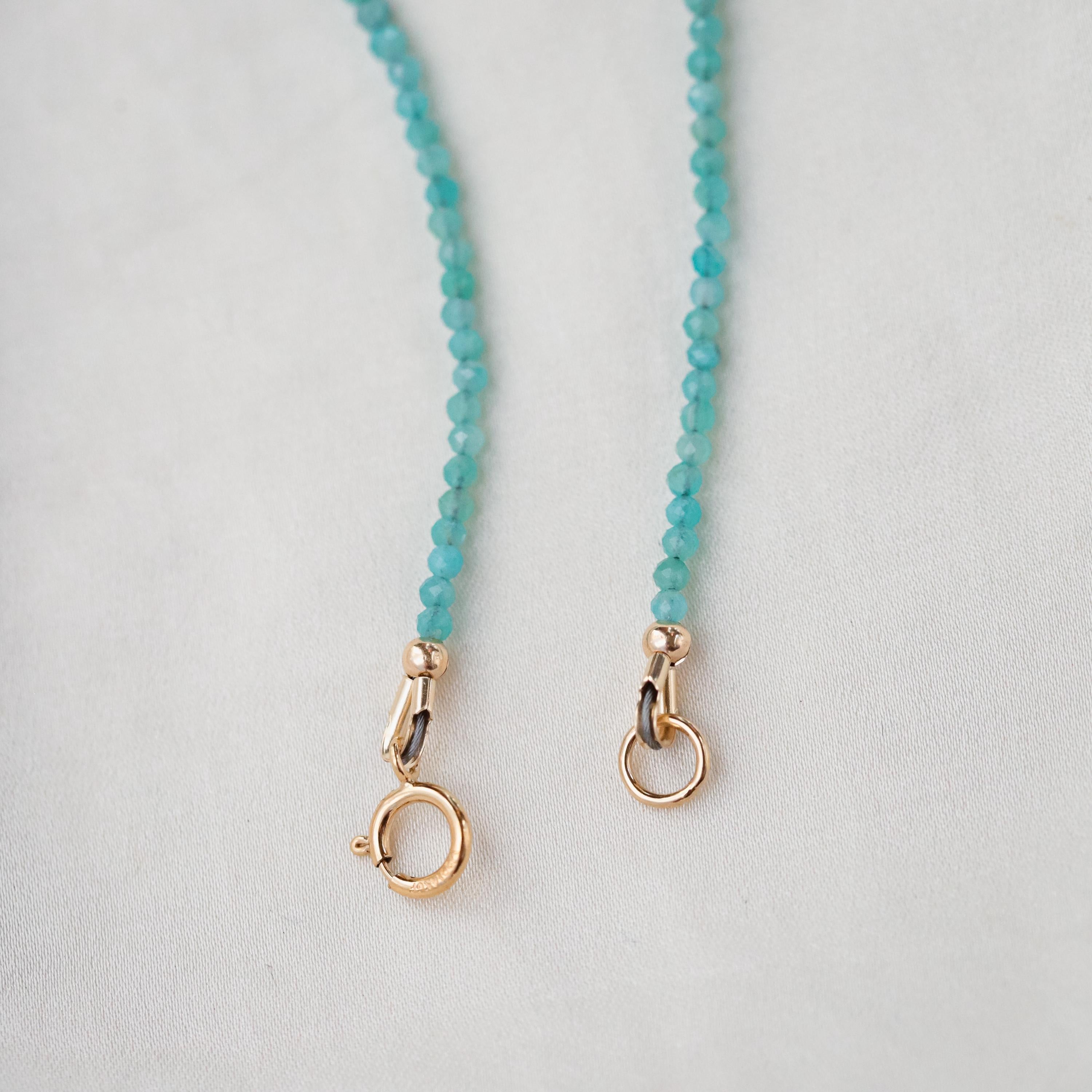 Crafted with tiny faceted 2mm amazonite beads, this minimalist necklace offers a soft wash of ocean-blue color and a calm, grounding presence. Subtle yet luminous, it’s designed to sit beautifully on its own or layer effortlessly with your everyday favorites.