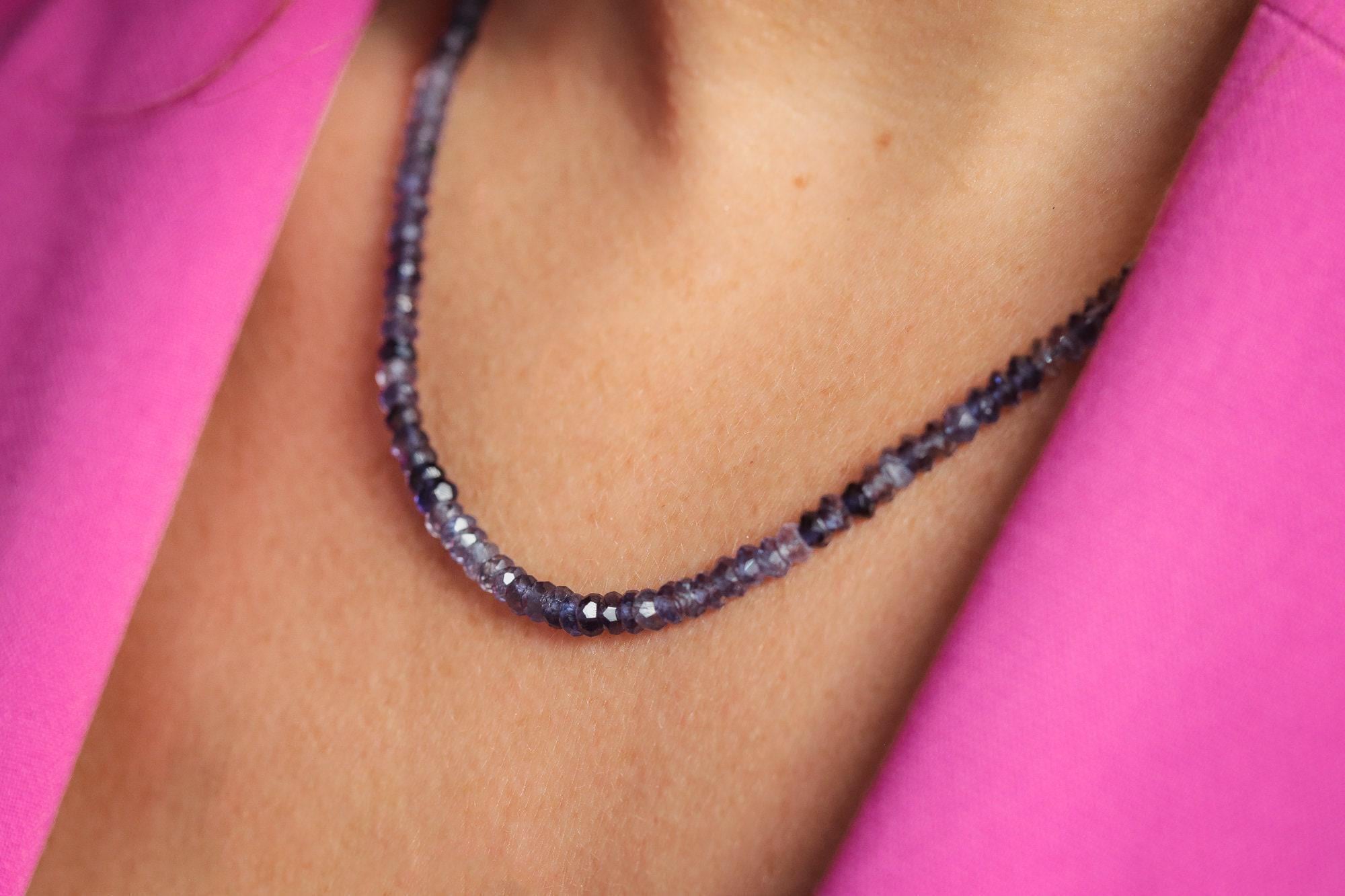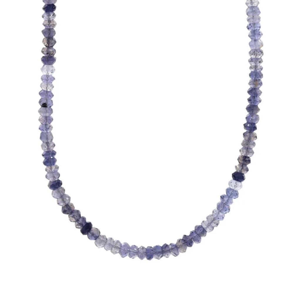 This refined strand features AAAA+ faceted iolite in natural shaded tones—deep indigo and violet hues that shift with the light. Known for enhancing inner vision and spiritual awareness, iolite is a stone of quiet strength and intuition.