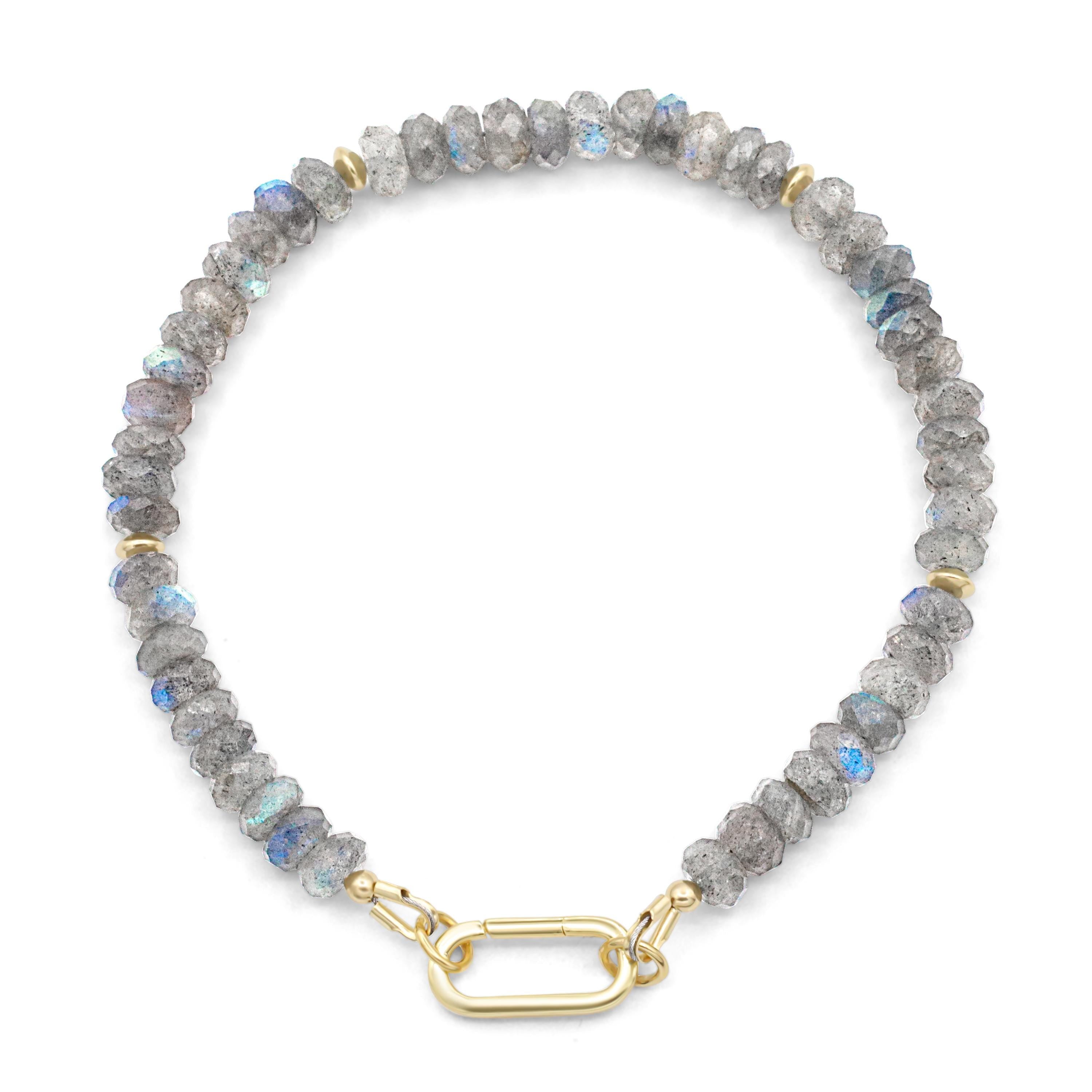 This standout bracelet features AAA+ faceted labradorite in a luminous rondelle cut, radiating bold flashes of blue, green, and gold. It arrives in two pieces: a gemstone strand and a solid gold rectangular carabiner—both can be worn separately or styled with other pieces from our shop for ultimate versatility.