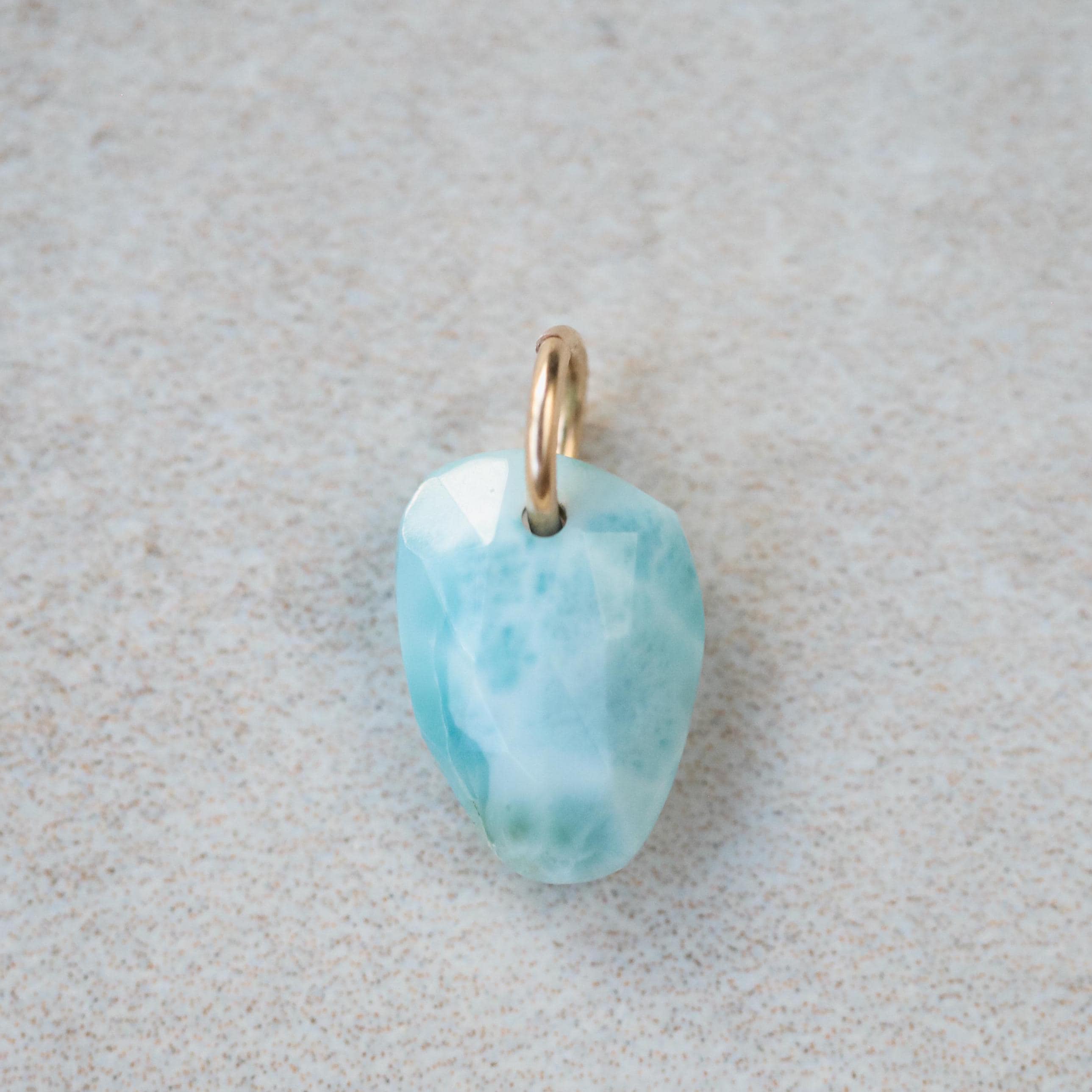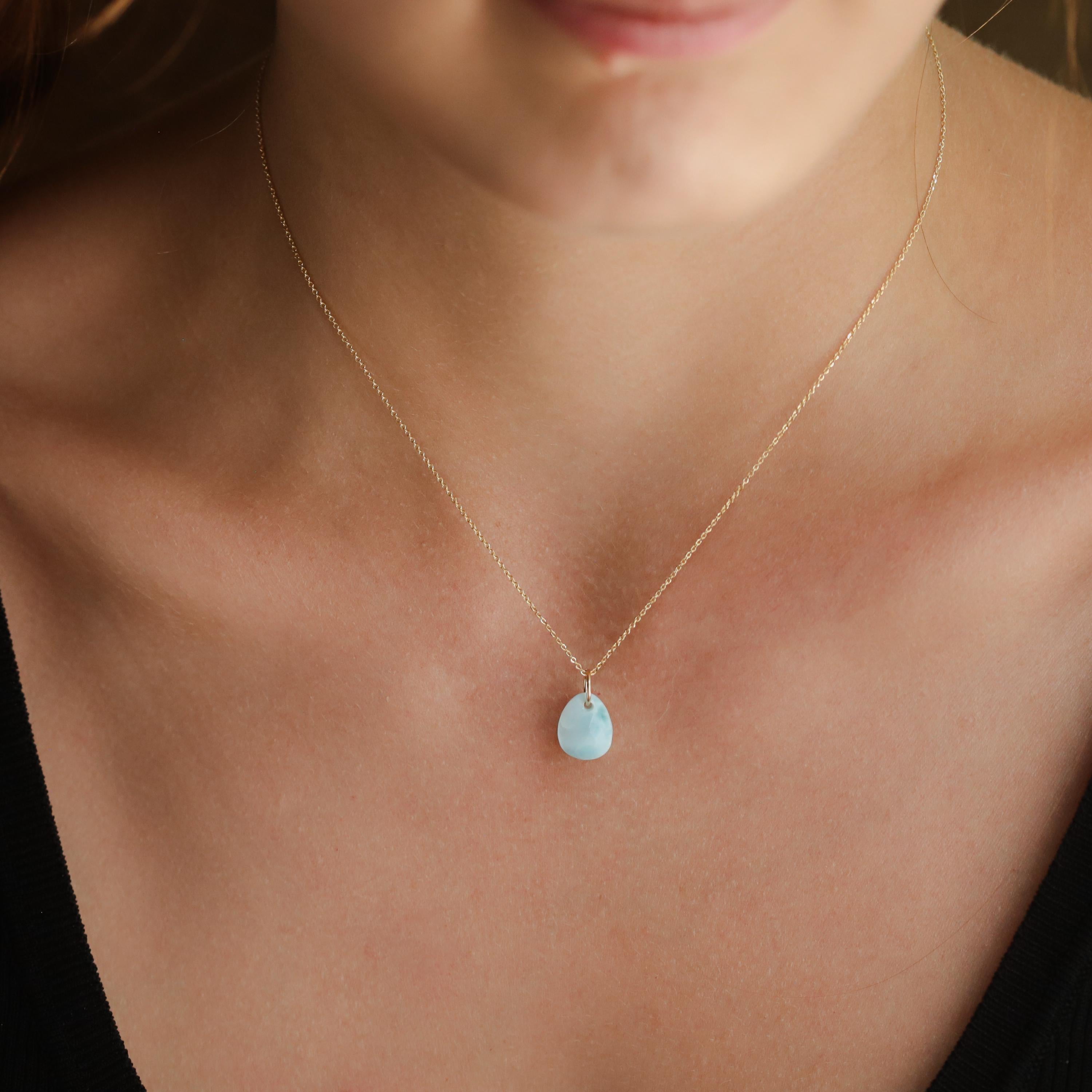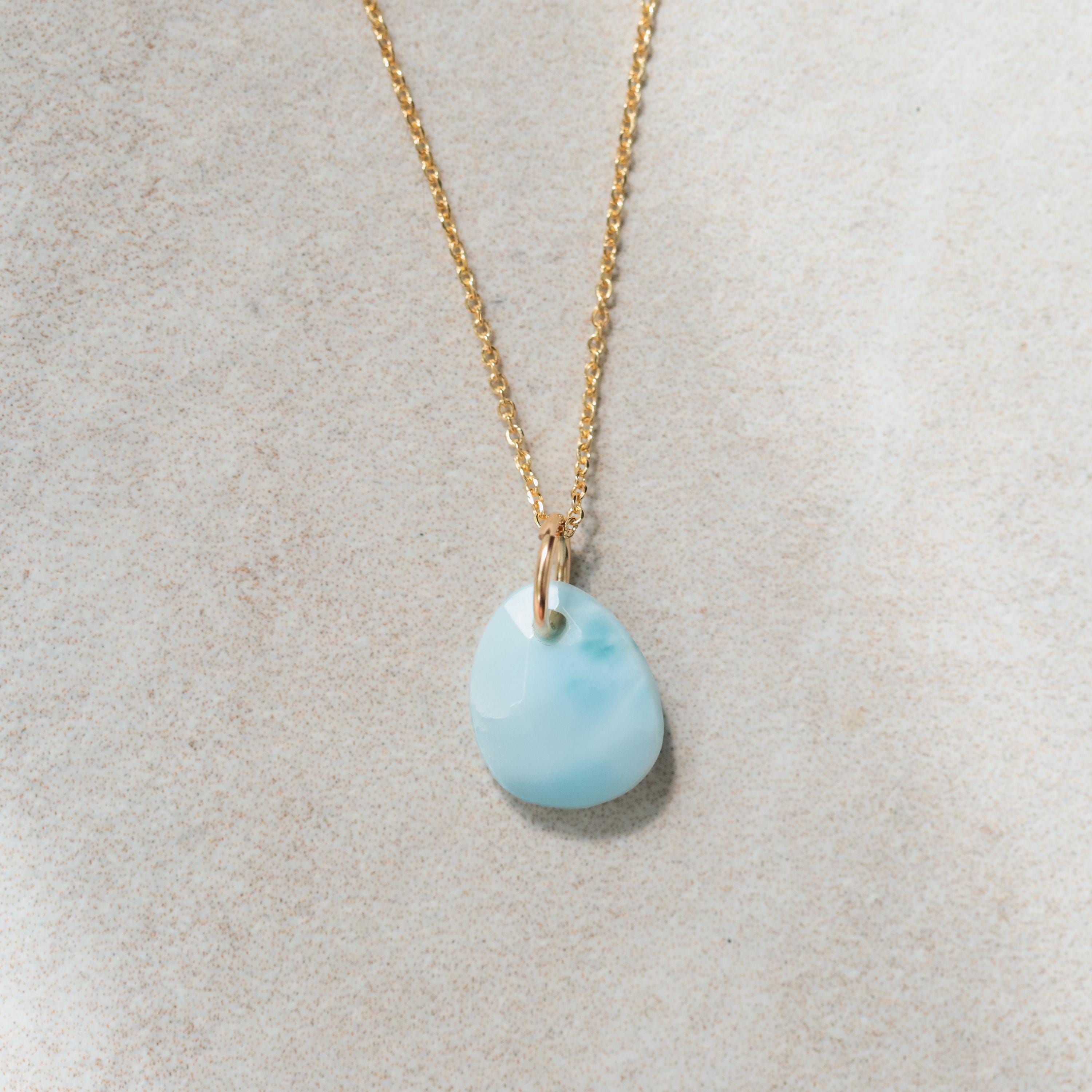 A calming stone of sea and sky, larimar carries the energy of the Caribbean—soft, serene, and deeply feminine. Each piece is selected for its unique sky-blue tone and natural matrix, and set with solid 14K gold. Choose the pendant on its own or paired with a solid 14K gold chain for effortless everyday elegance.