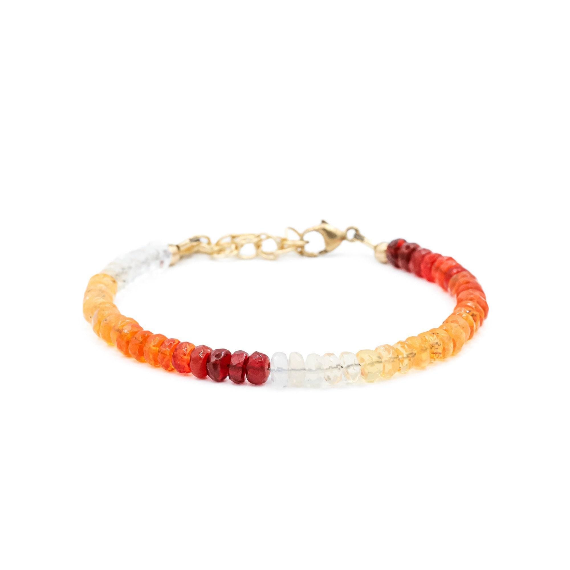 This radiant bracelet features AAAA+ Mexican fire opals arranged in a glowing ombré gradient — shifting from warm golden amber into vivid, fiery orange. Each 4.5–5mm gemstone is gemmy, translucent, and light-catching, creating luminous movement with every turn of the wrist. Finished with your choice of sterling silver, 14K gold filled, or solid 14K gold findings, this bracelet is a refined, high-vibration piece made for daily wear, stacking, and collecting.