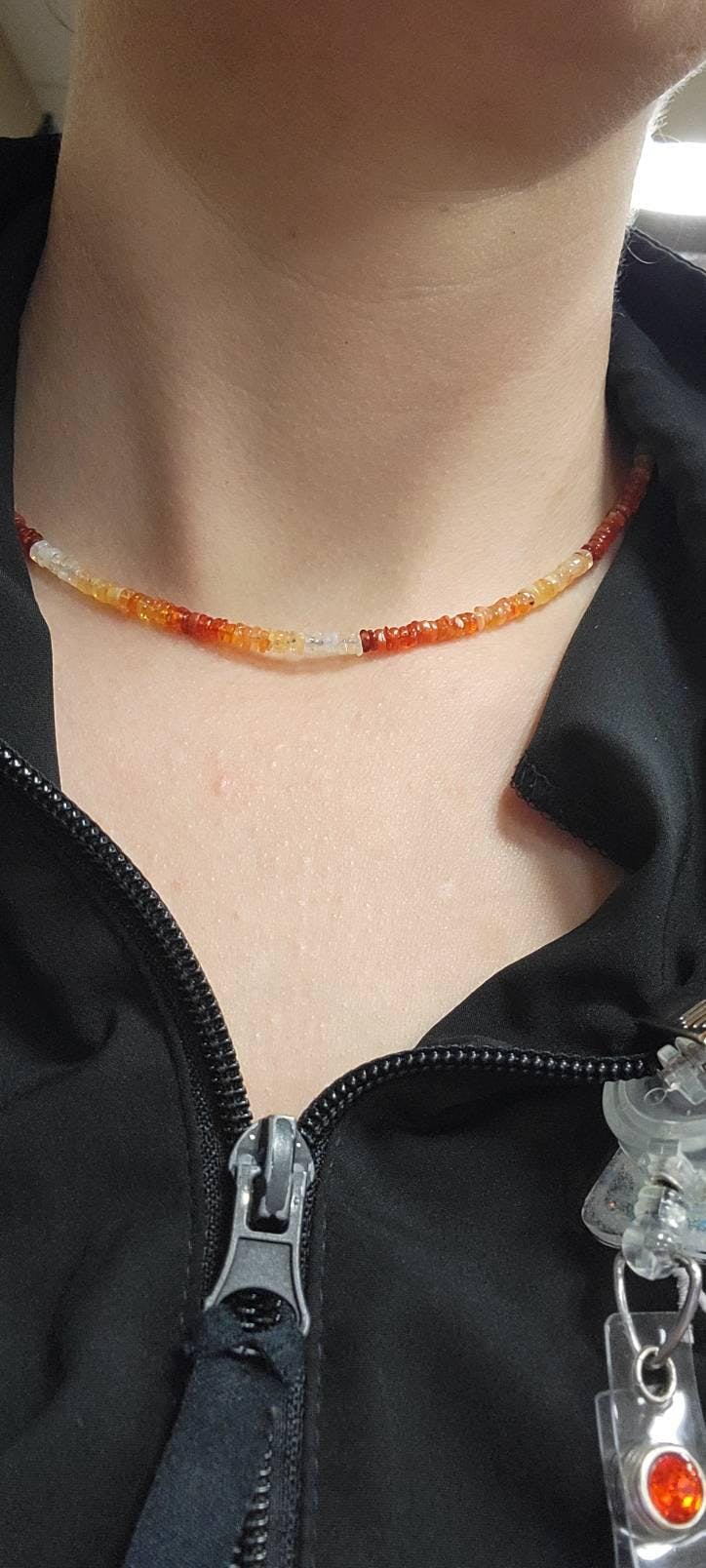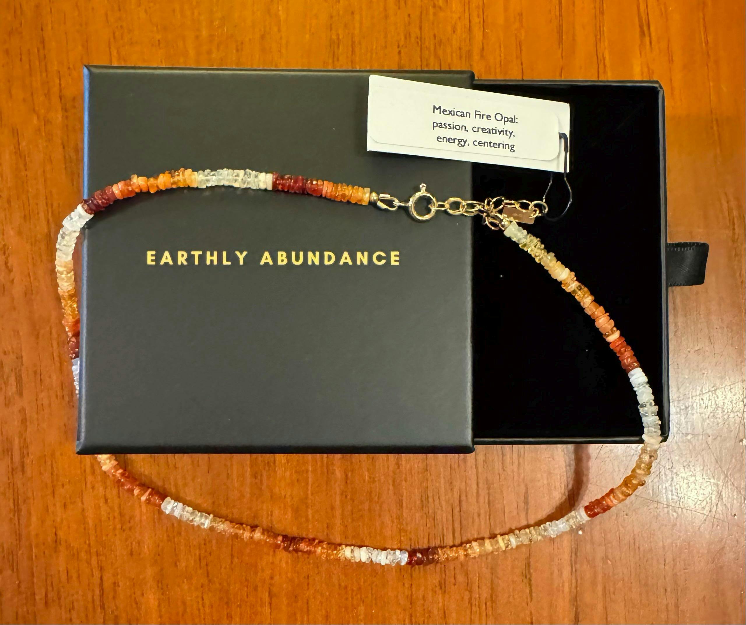 This stunning necklace features AAAA+ Mexican fire opal in a smooth rondel cut, glowing with warm tones of orange, amber, and gold. Known for its vibrant energy and bold elegance, each bead is full of natural brilliance. Finished with a 14K gold filled clasp and extender, it’s a luminous everyday piece made to inspire and uplift.