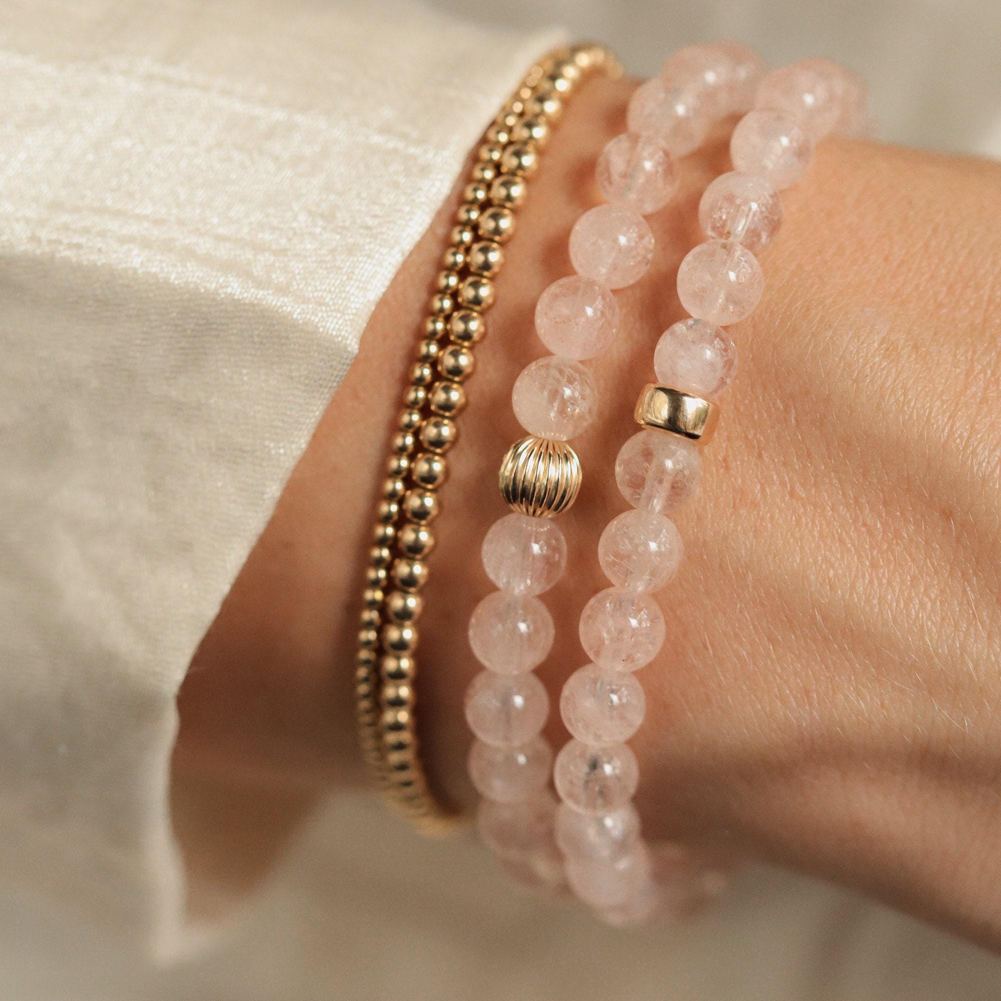 Details • Handmade in Canada • AAAA+ morganite (approx. 6mm smooth round) • Durable stretch cord – comfortable, easy wear • Choose: sterling silver, 14K gold filled, or solid 14K gold • Choose rondel or corrugated accent (optional set of two) • 100% genuine gemstones