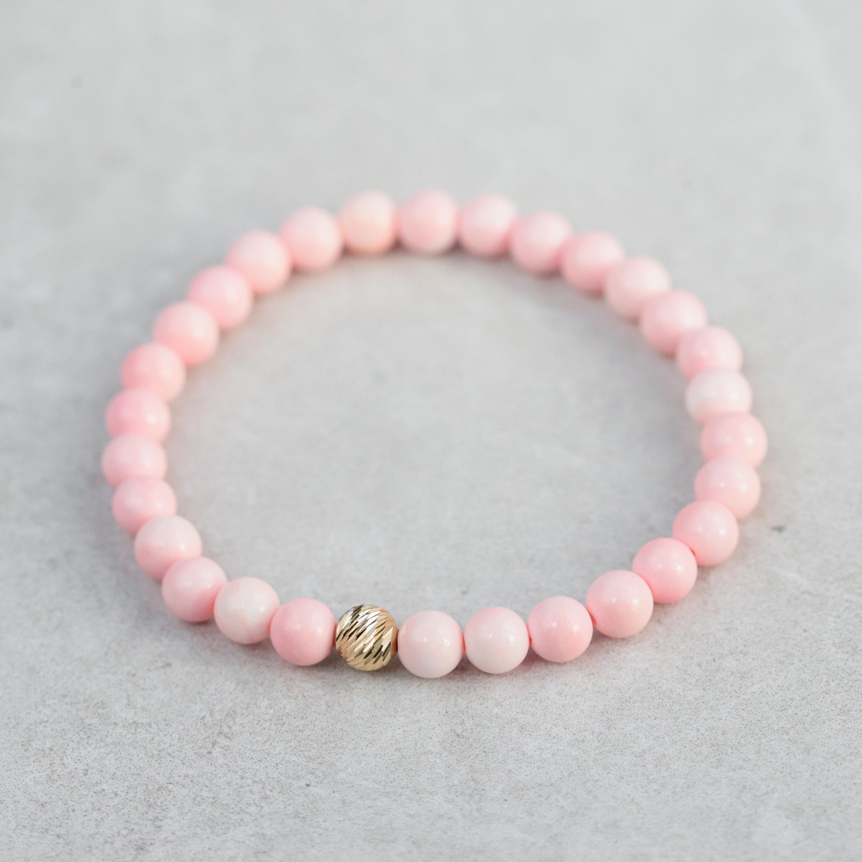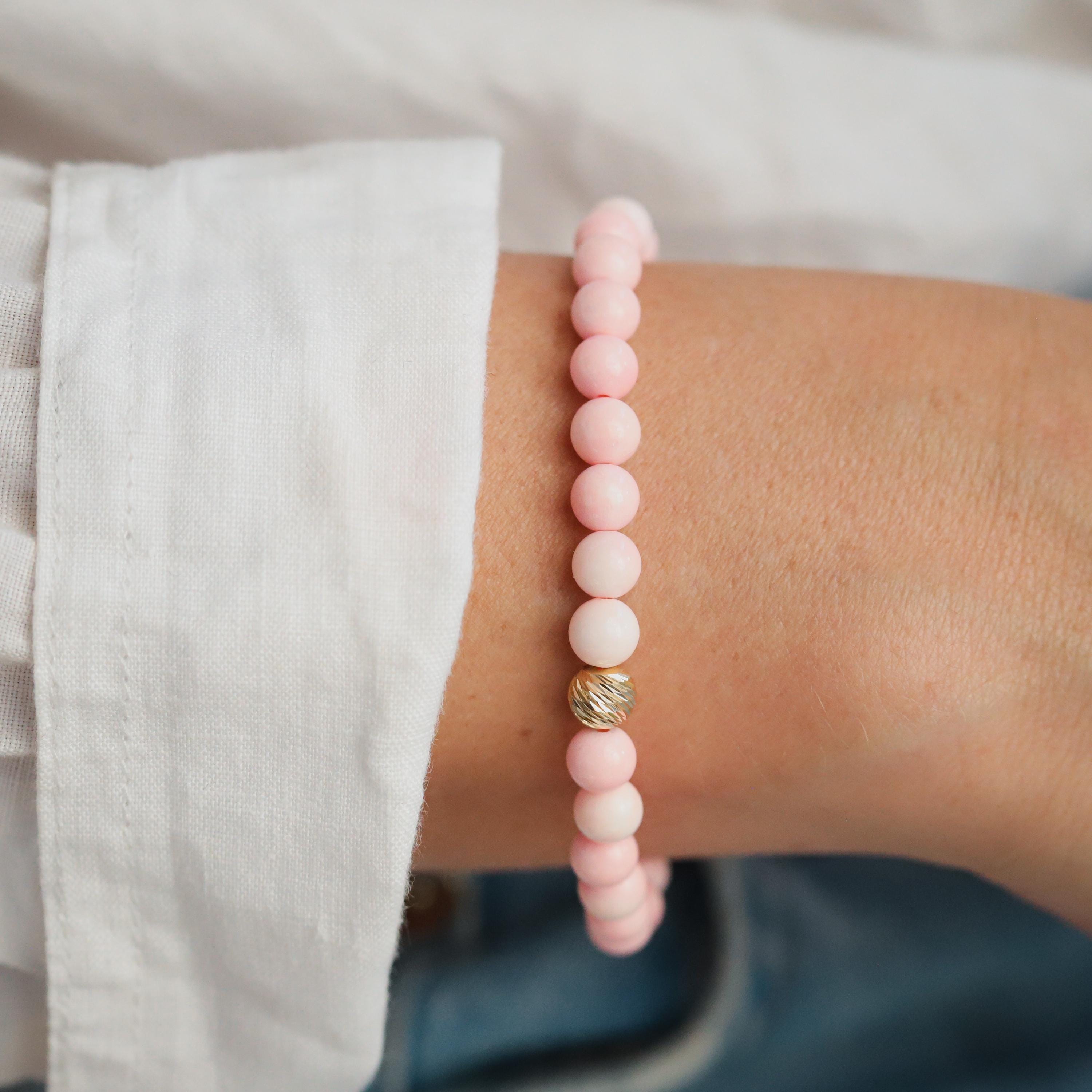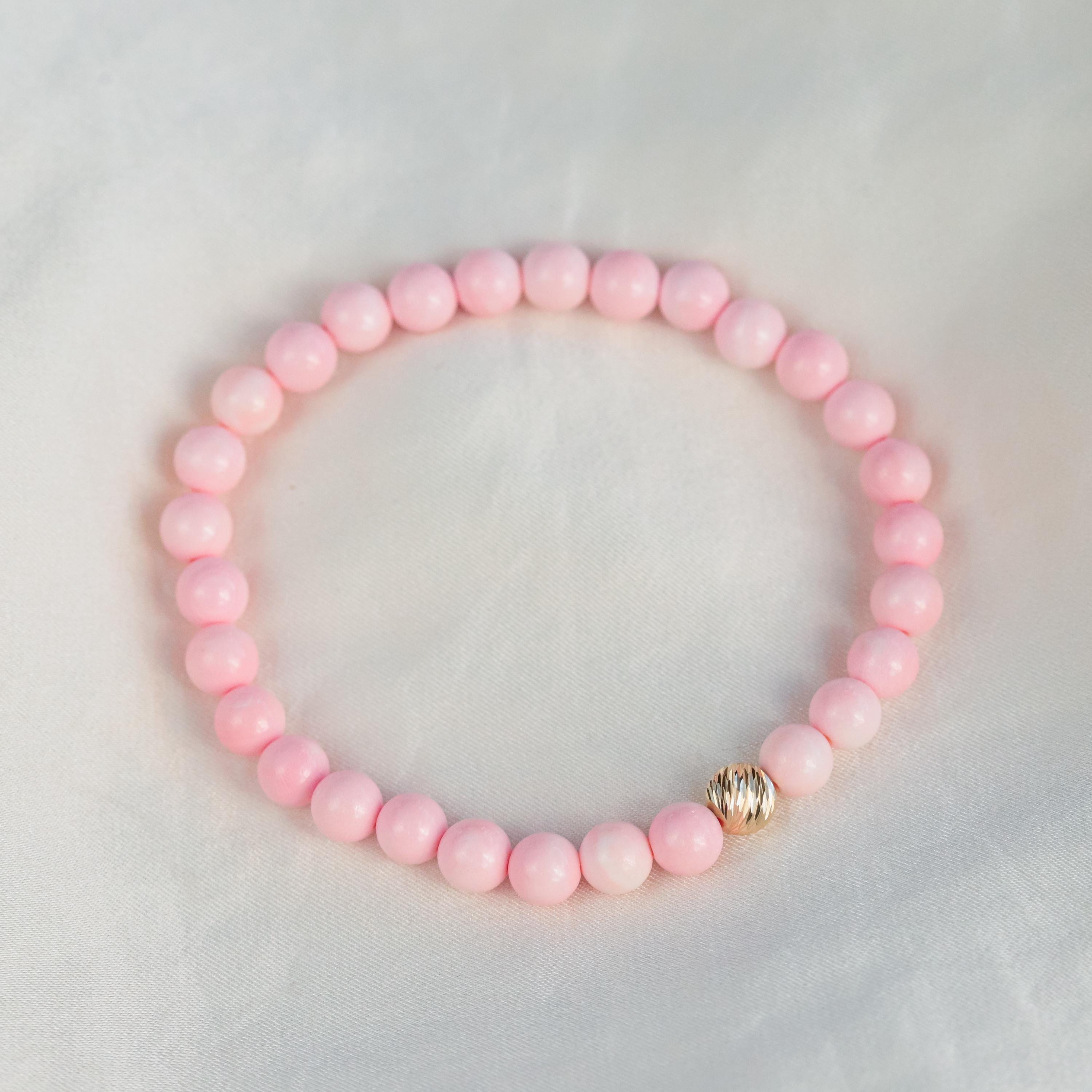 This limited-edition bracelet features vibrant pink conch shell beads in a smooth 6mm round, paired with a polished 14K solid gold accent. The warm, coral-pink tone is bold yet soft—bringing joy, femininity, and a touch of the sea to your stack. Small batch and rare, this piece won’t be restocked.