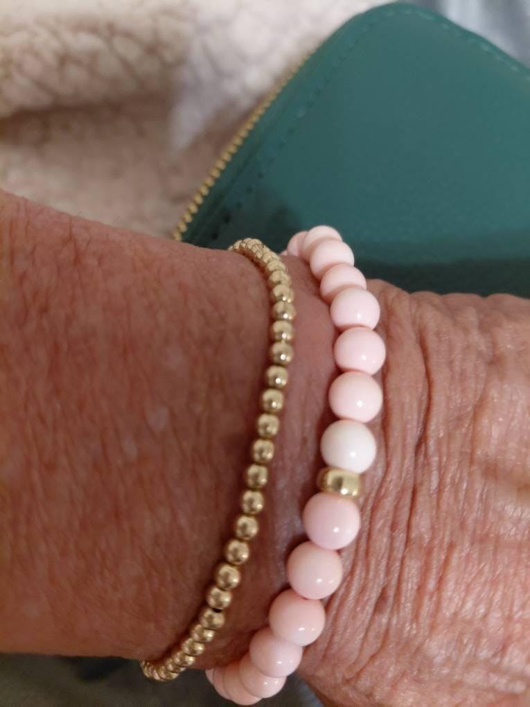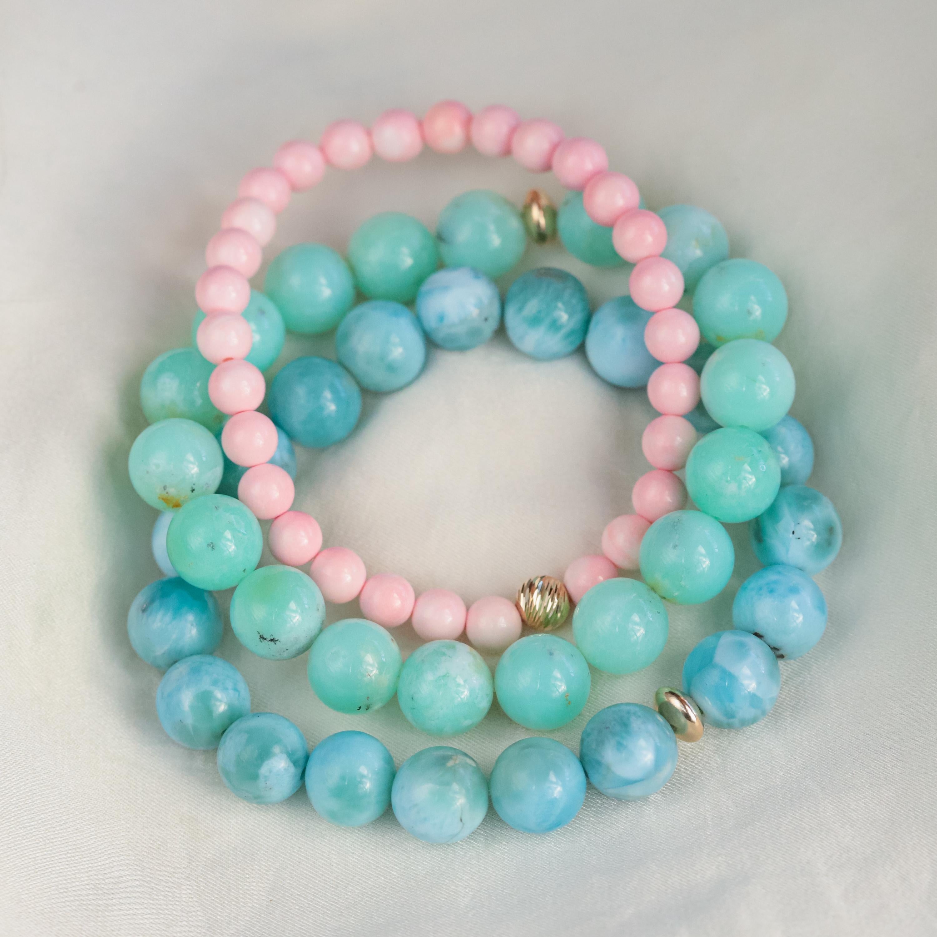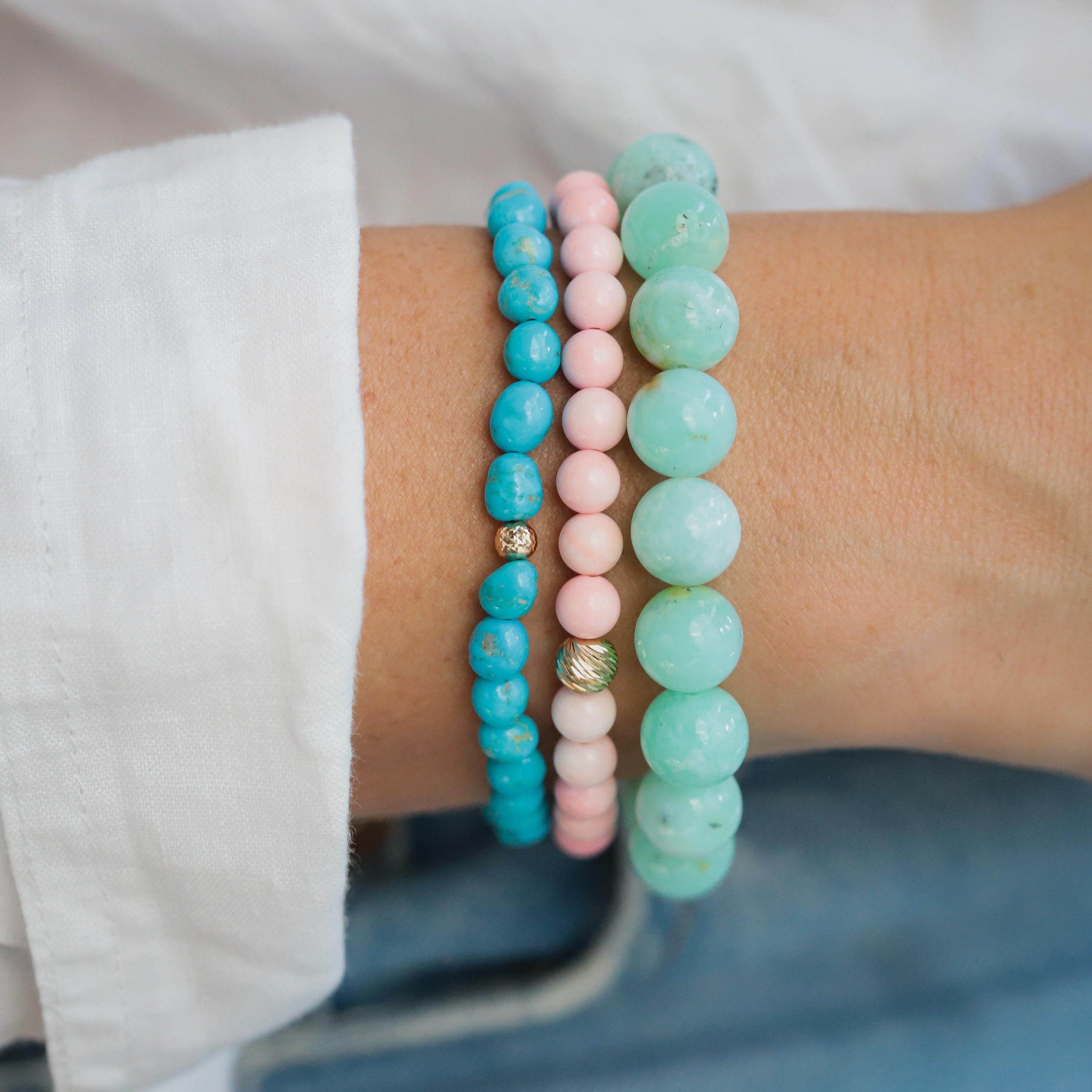 This limited-edition bracelet features vibrant pink conch shell beads in a smooth 6mm round, paired with a polished 14K solid gold accent. The warm, coral-pink tone is bold yet soft—bringing joy, femininity, and a touch of the sea to your stack. Small batch and rare, this piece won’t be restocked.