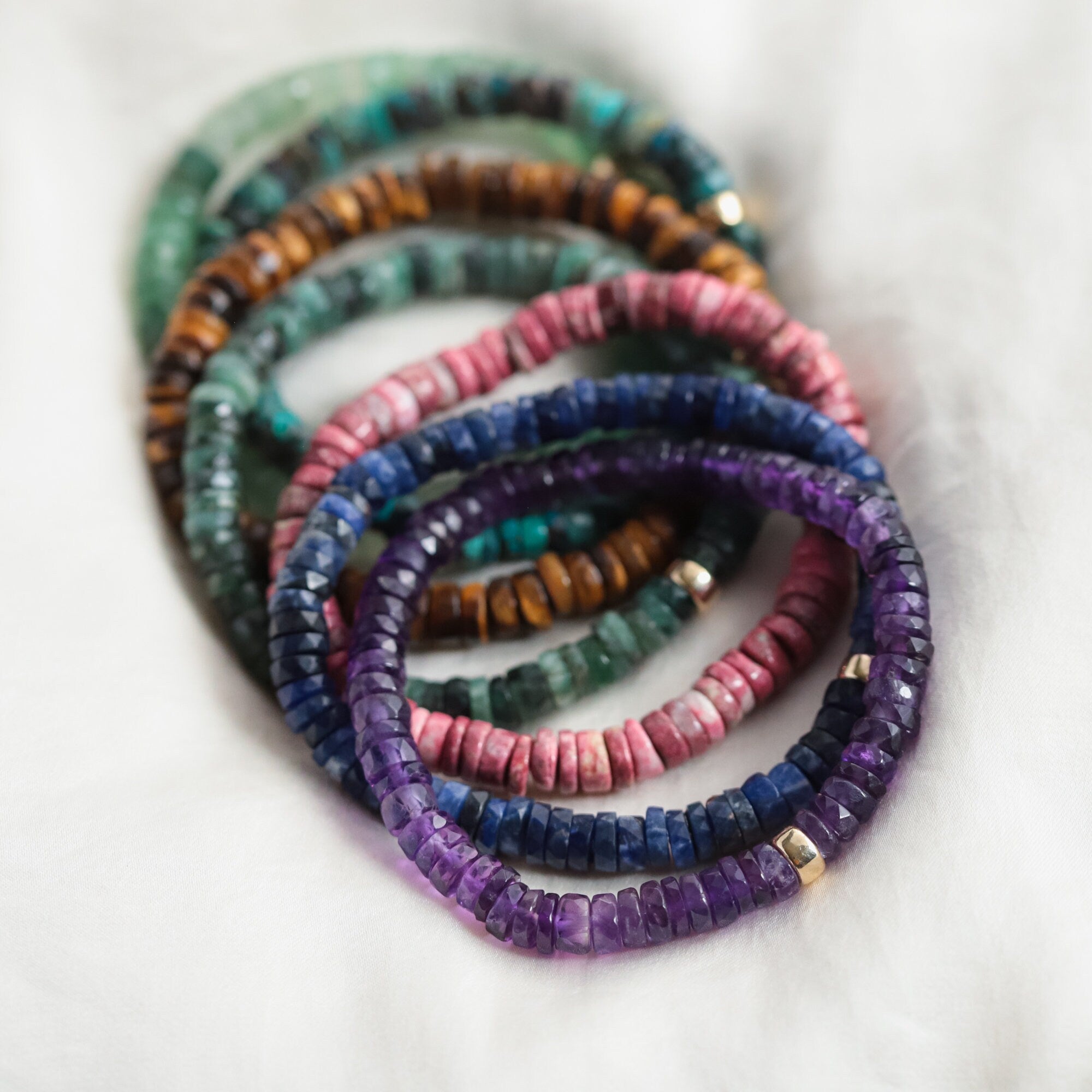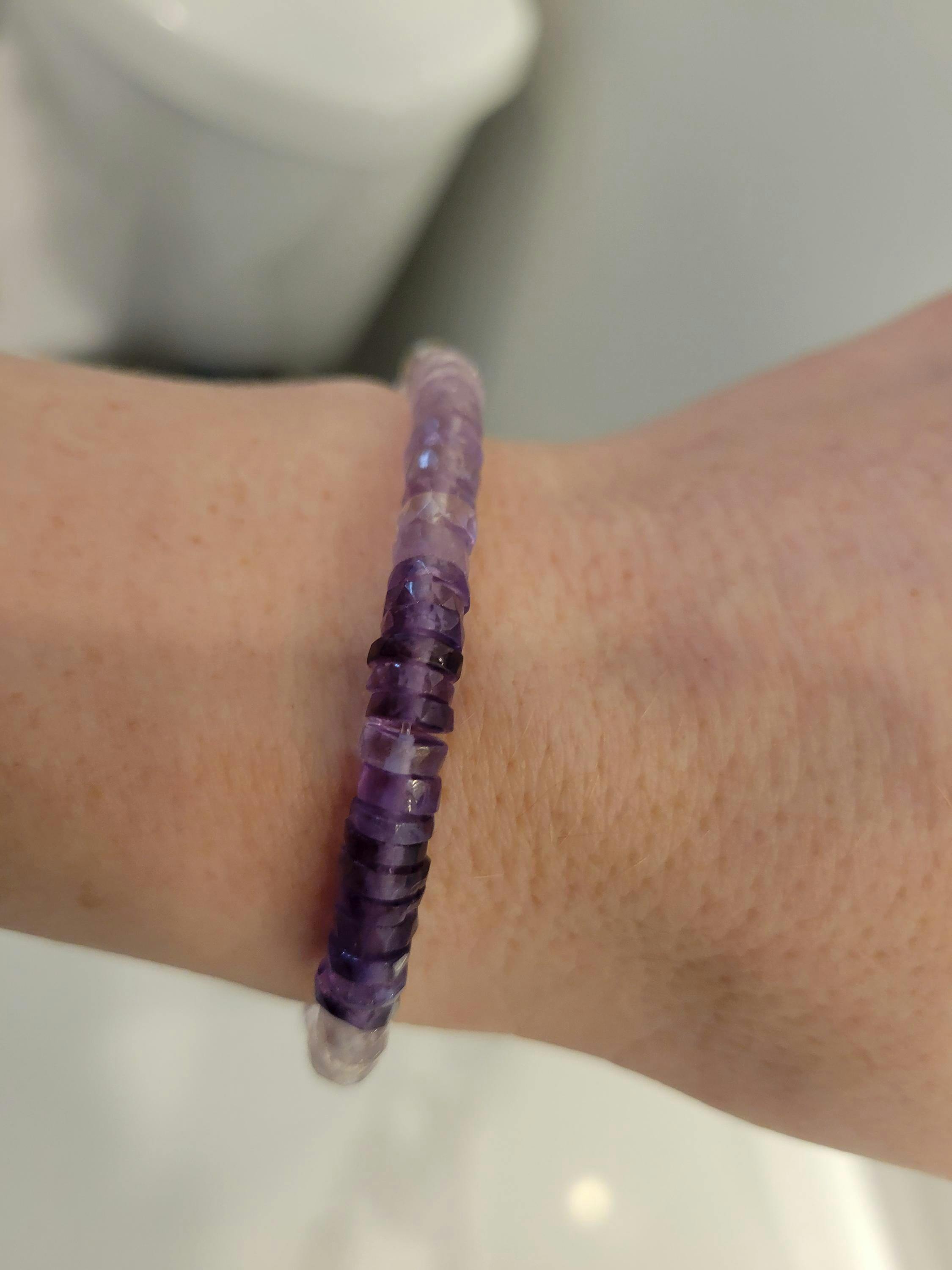 This luminous bracelet features faceted amethyst heishi beads in a soft ombré of violet tones—from deep royal purple to delicate lilac. Its natural sparkle and dimension make it a versatile piece, perfect for stacking or wearing solo. Finished with your choice of 14K gold filled, sterling silver, or solid 14K gold rondel, it’s a refined expression of beauty and tranquility.