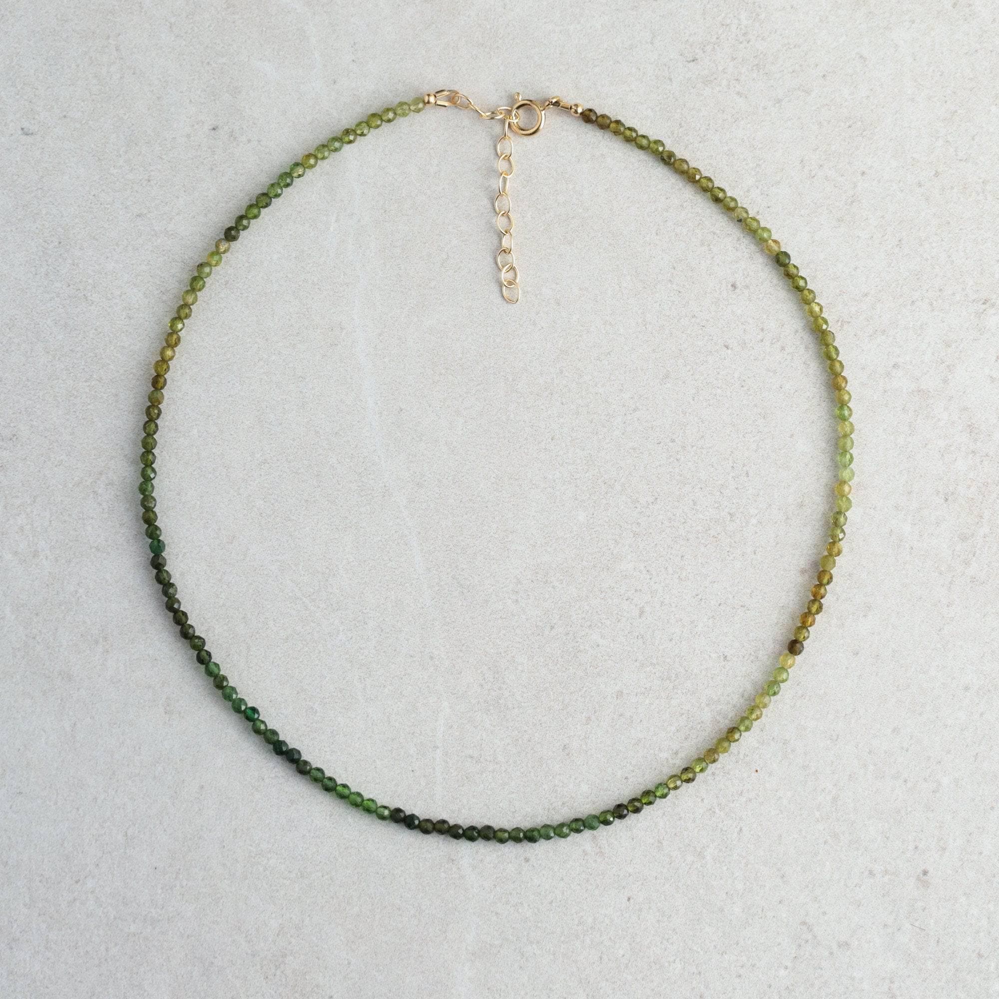 Crafted with rare green tourmaline in a delicate 3mm faceted cut, this necklace shows a natural ombré of earthy green tones, ranging from soft moss to deeper forest shades. The colors feel fresh, grounding, and quietly uplifting, with a gentle heart-centered energy that makes this piece feel both calming and alive. Light and refined, it layers beautifully with gold chains and other gemstone strands, but also has enough presence to be worn on its own.