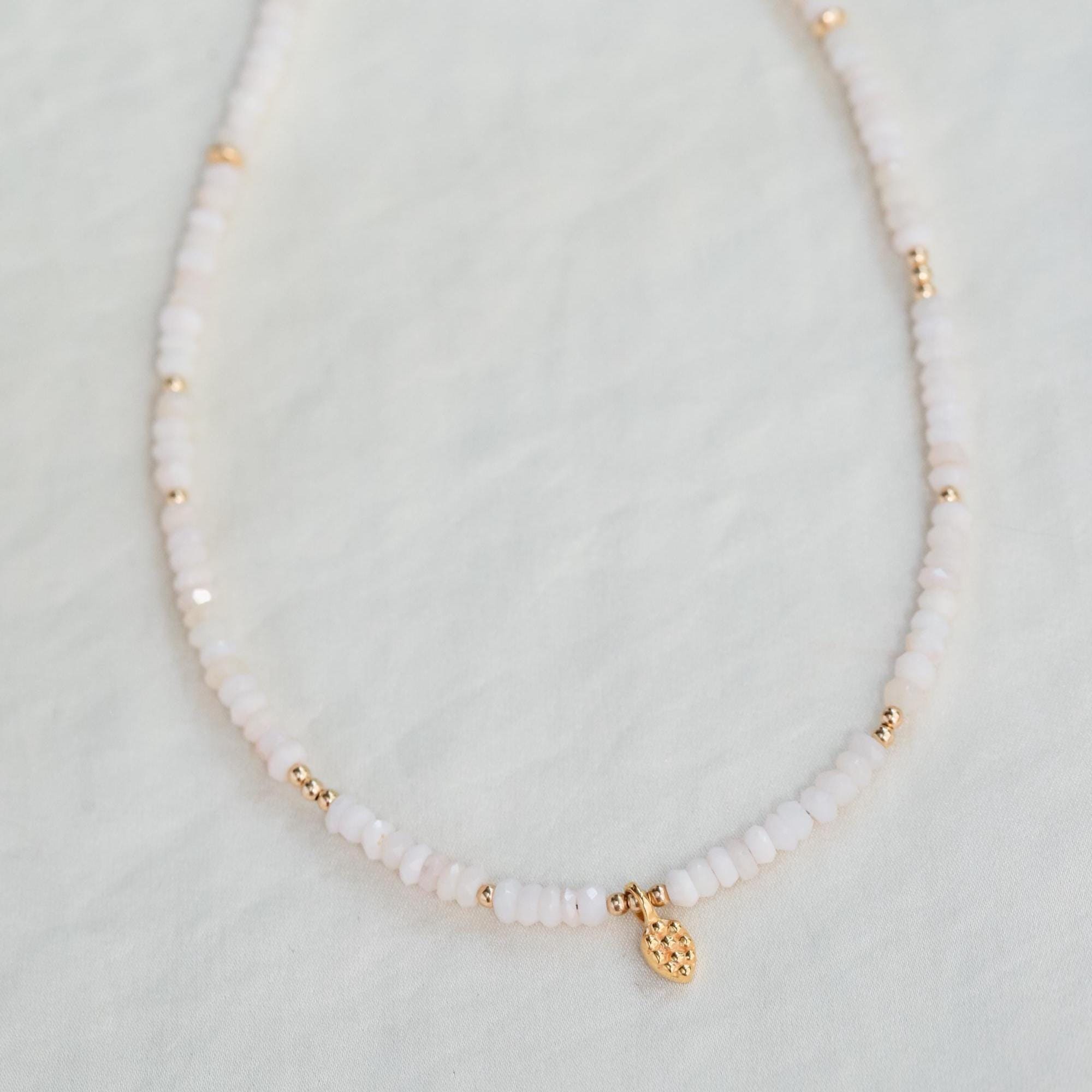 Delicate and light-filled, this necklace features genuine pink opal in a fine 3mm faceted rondelle cut. The airy blush tones feel soft and heart-centered—perfect for warm days, meaningful moments, and everyday elegance.