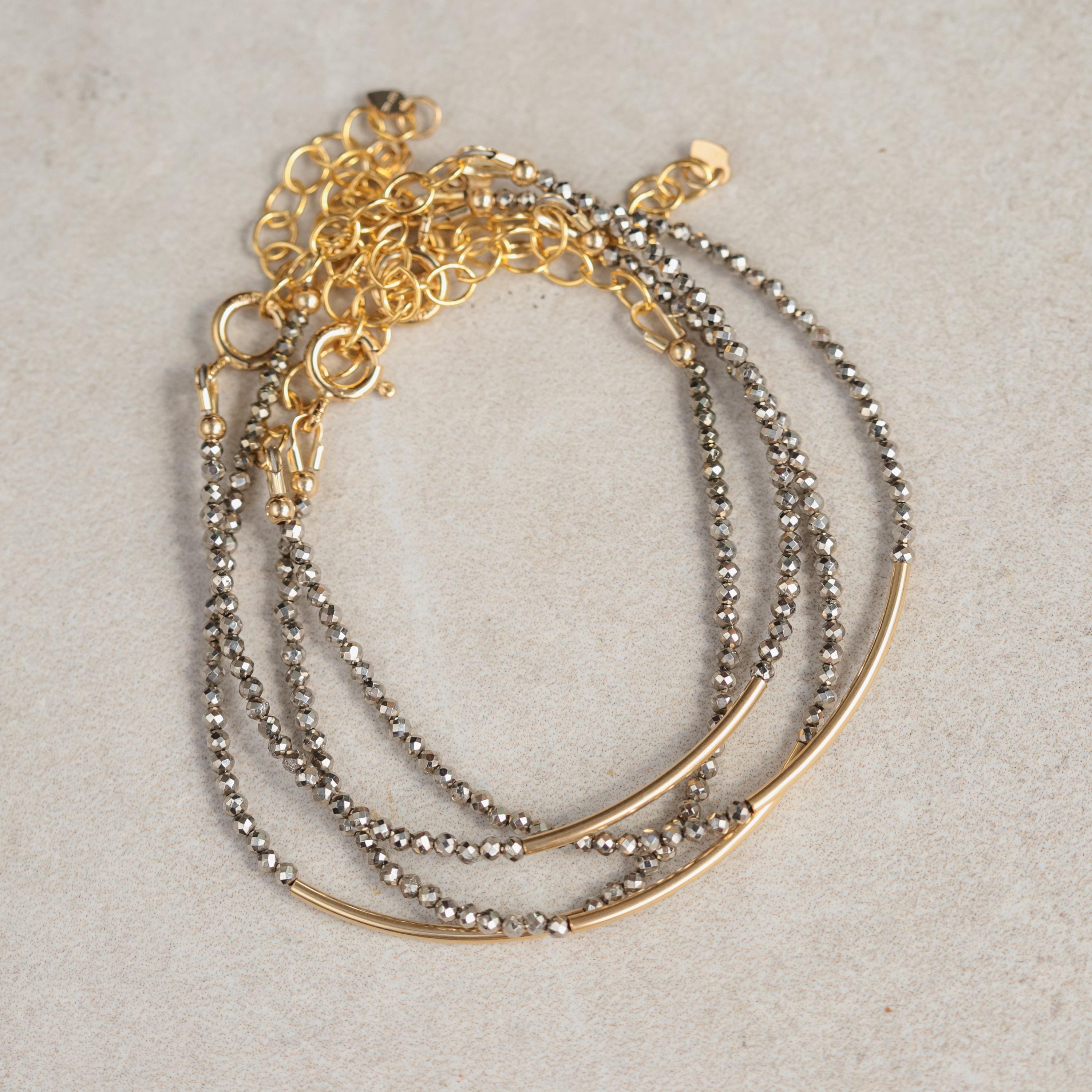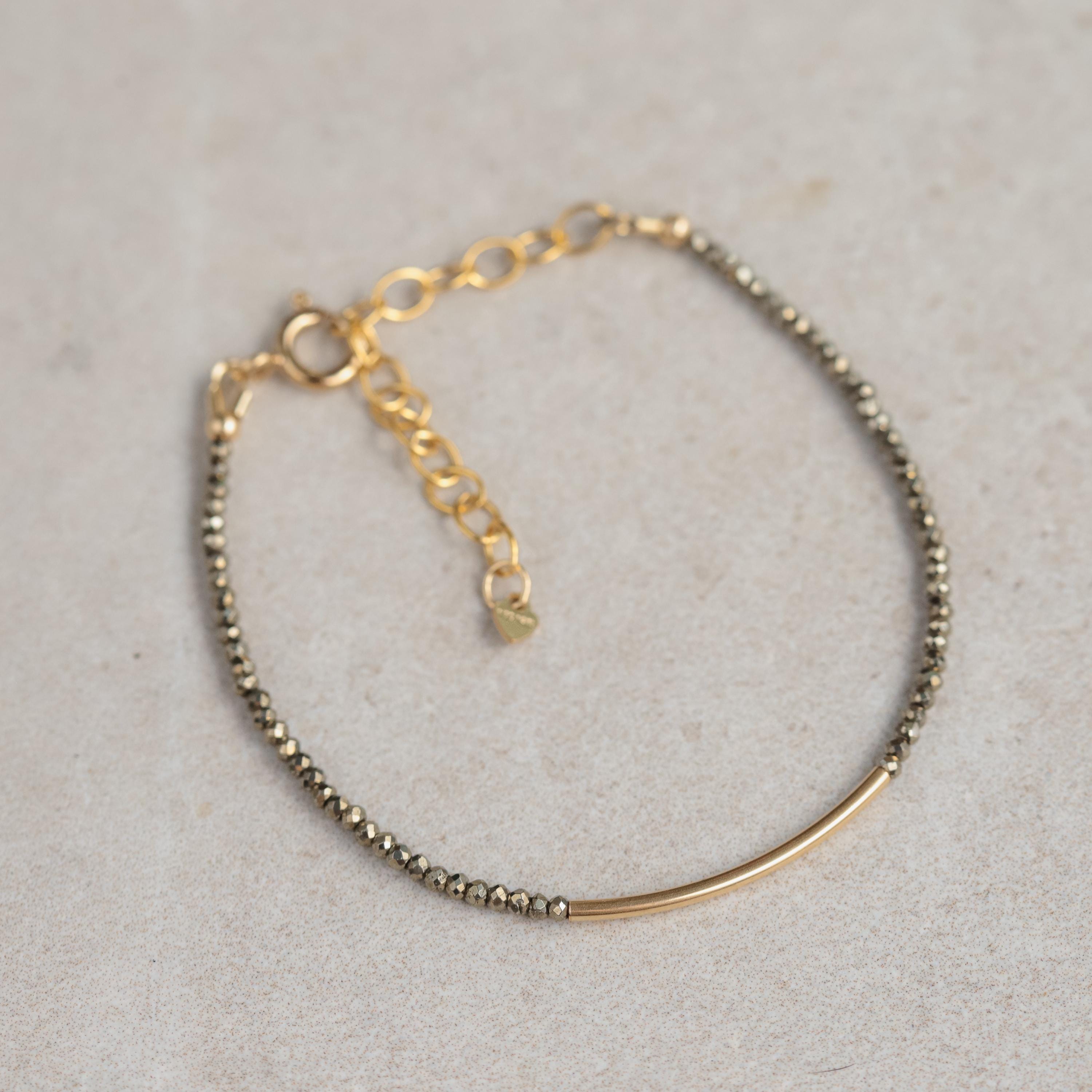 • Handmade in Vancouver, Canada • Genuine pyrite 2-2.5mm (faceted) • 14K gold filled • Lobster clasp and extender in selected metal • Adjustable length: 6.5"–8" • 100% genuine gemstones