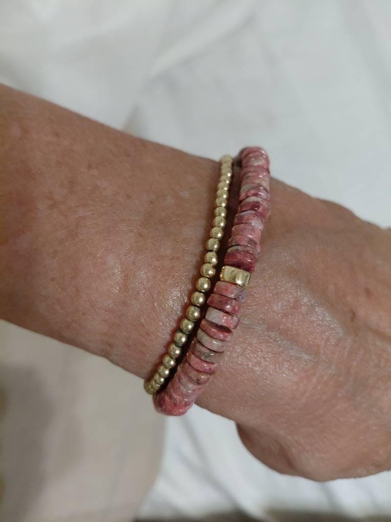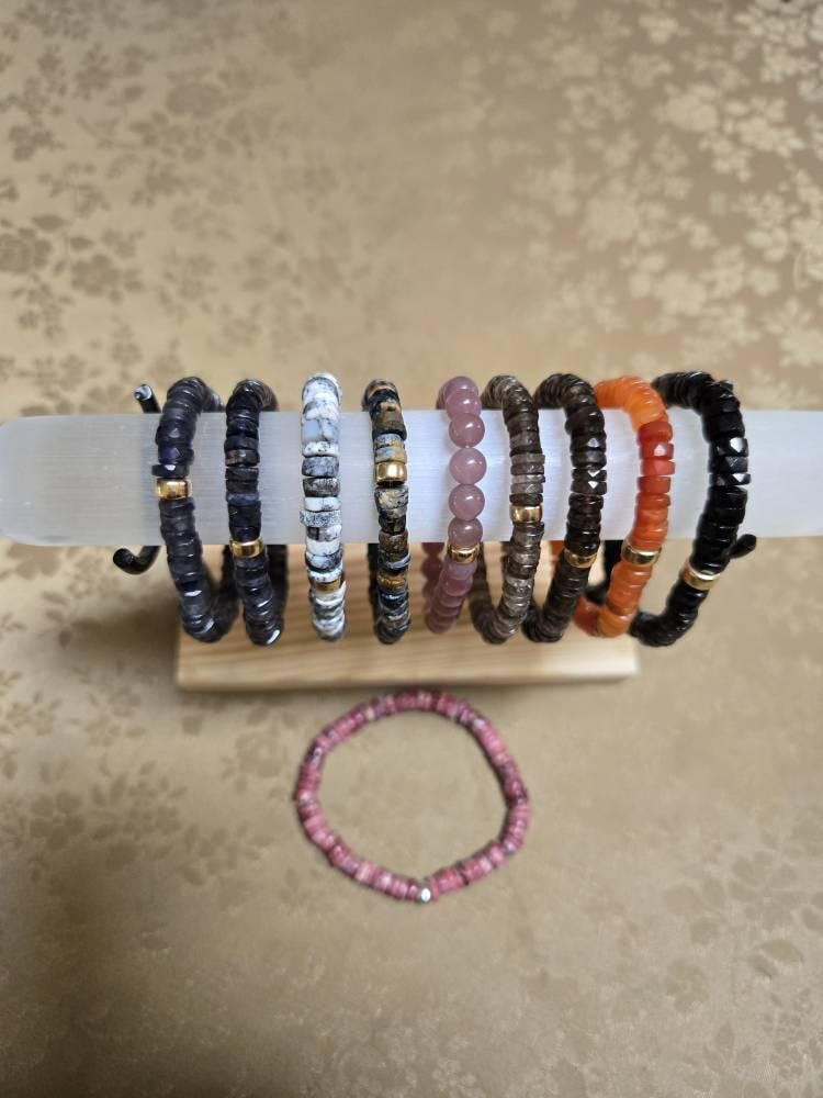 With its rich, earthy pink tone and smooth heishi cut, this bracelet brings a sense of warmth and emotional strength. Each 7mm thulite bead offers subtle texture and a grounded presence—perfect for everyday ease or intentional stacking. Choose your preferred metal accent and optional heart charm for a personalized finish.