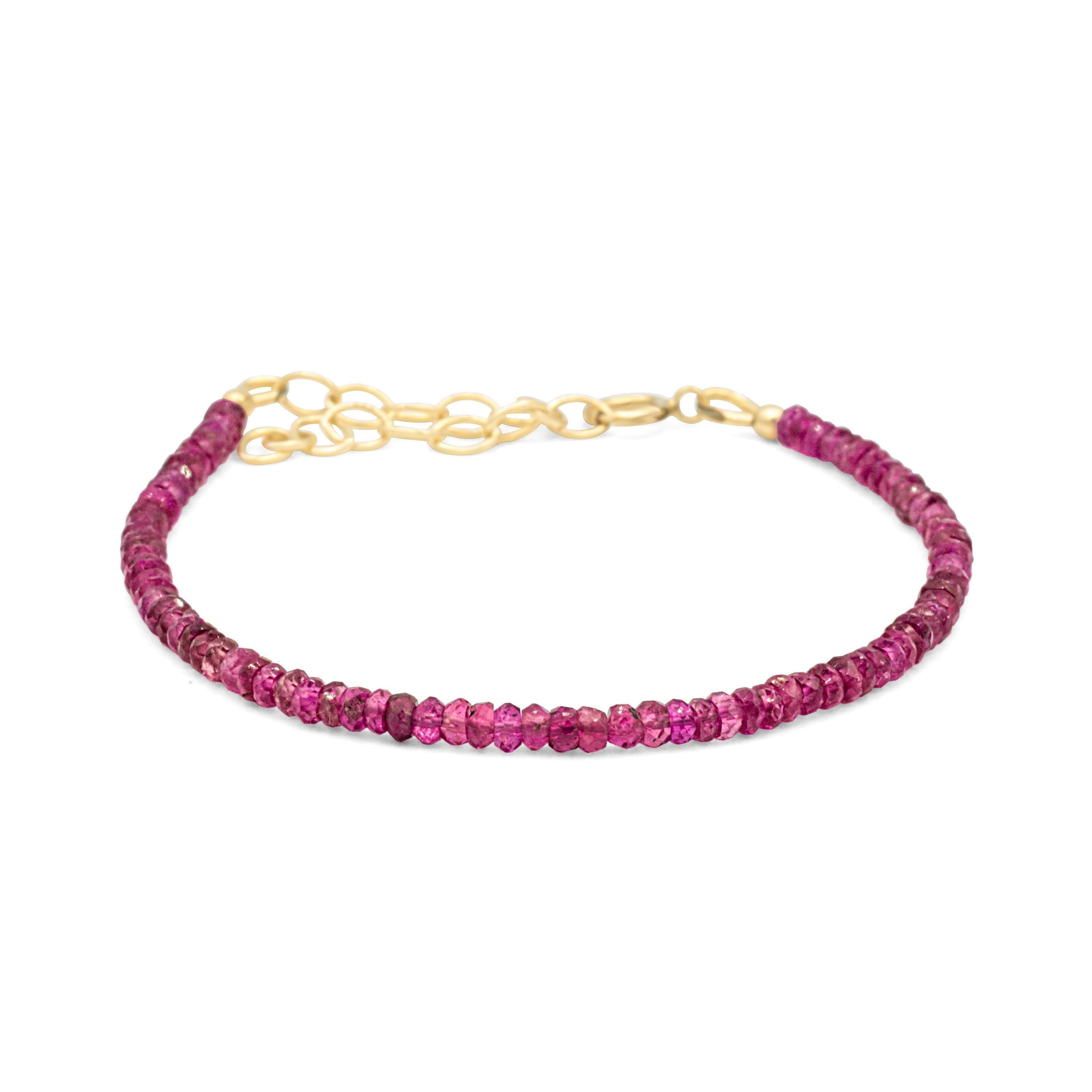 • Handmade in Vancouver • Genuine rubellite pink tourmaline (approx. 2.5mm) • Choice of sterling silver, 14K gold filled, or solid 14K gold clasp & extender • Adjustable fit: 6-7", 7-8", 8-9" • 100% genuine gemstones