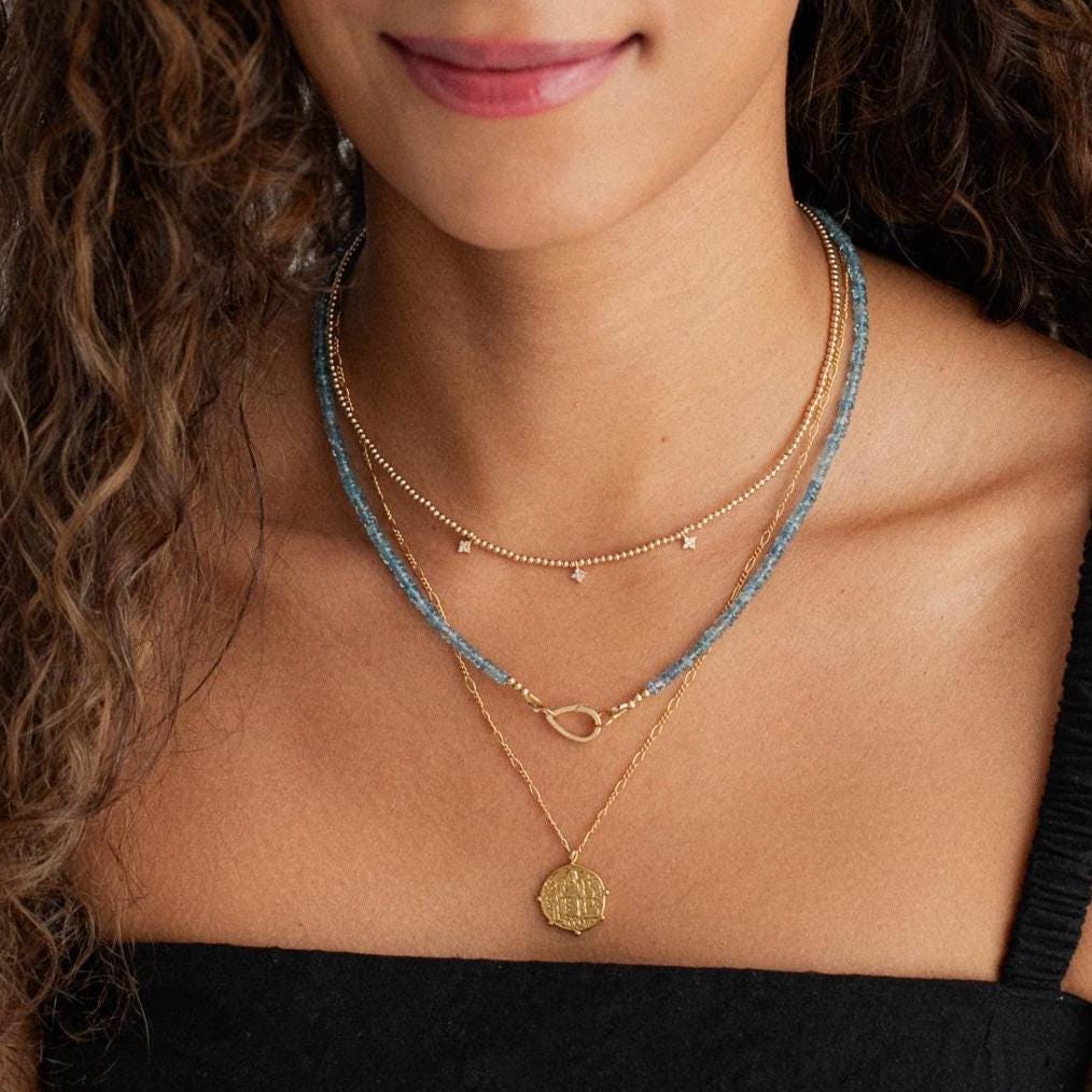 Santa Maria aquamarine carries a luminous, water-like glow that shifts beautifully in the light. This AAAA+ strand features faceted 3mm rondelle beads—known for inspiring confidence, clarity, self-expression, and open communication. Finished entirely in solid 14K gold, the piece is elevated, timeless, and designed for a lifetime of wear.