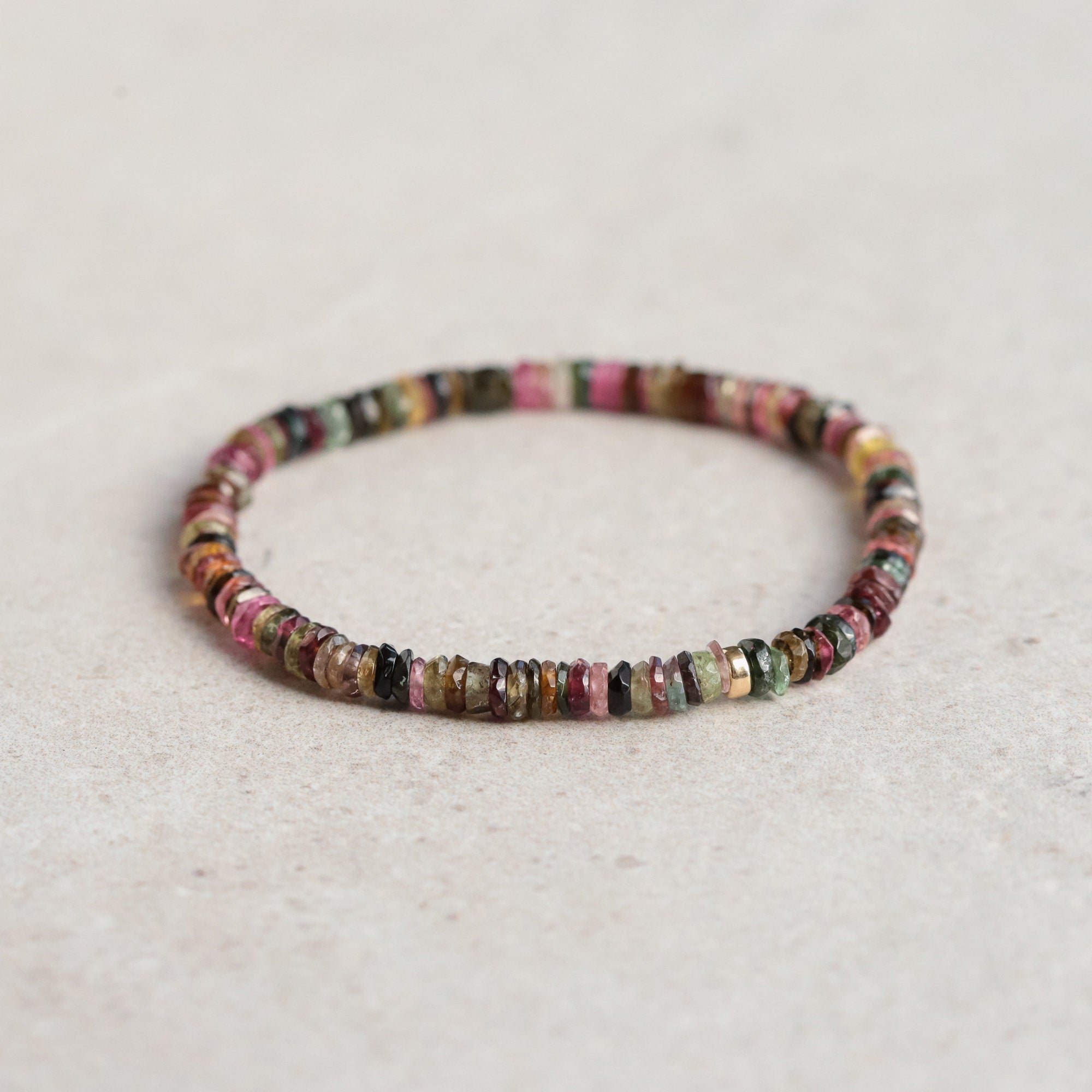 A vibrant strand of AAAA+ mixed tourmaline in a unique faceted heishi cut—full of rich, earthy color and natural radiance. Finished with a solid 14K gold accent, this bracelet offers a grounding yet joyful energy, designed for effortless, everyday wear.