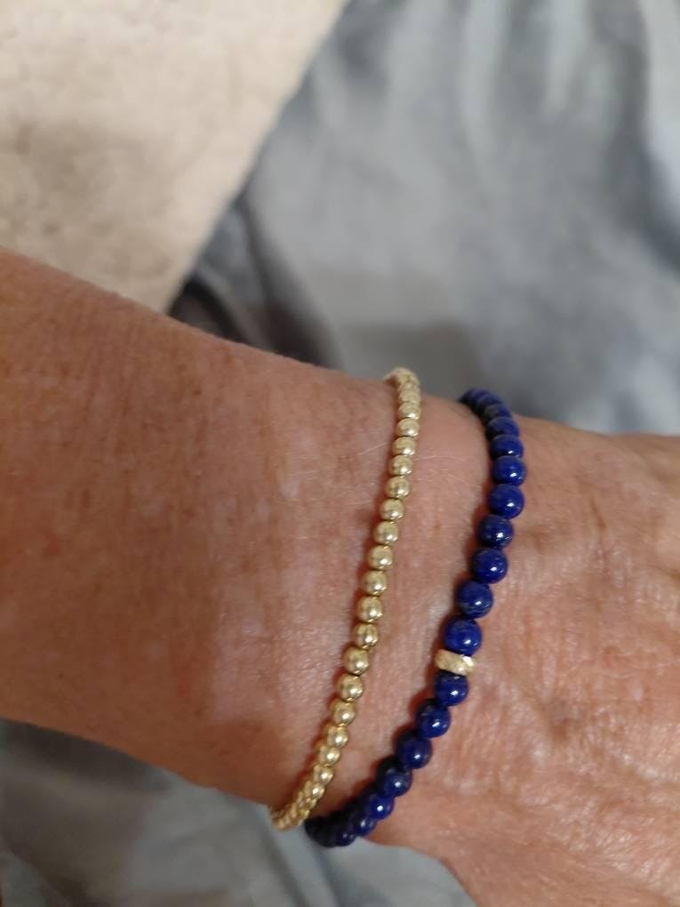 LAPIS is such a pretty blue and the 14k Solid gold rondel sets it off even more. It is so dainty. Thank you Jen. Best shop by far for lovely stretch bracelets.