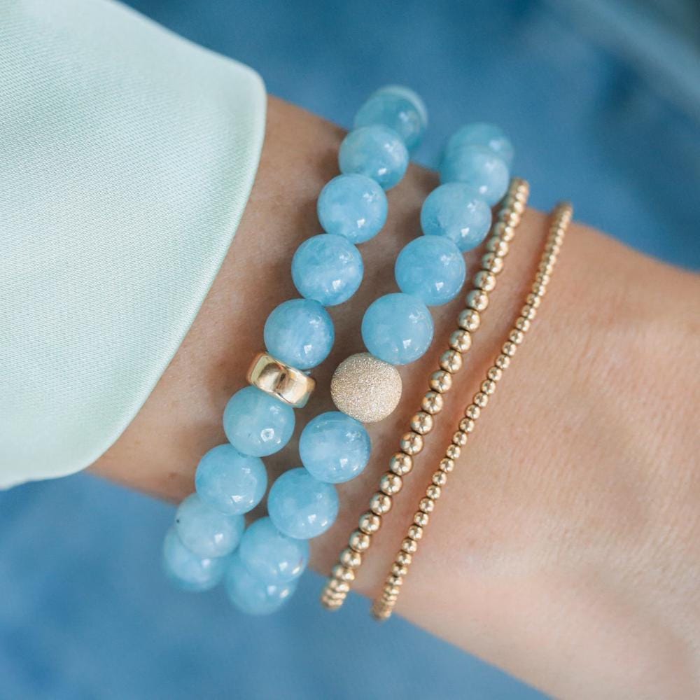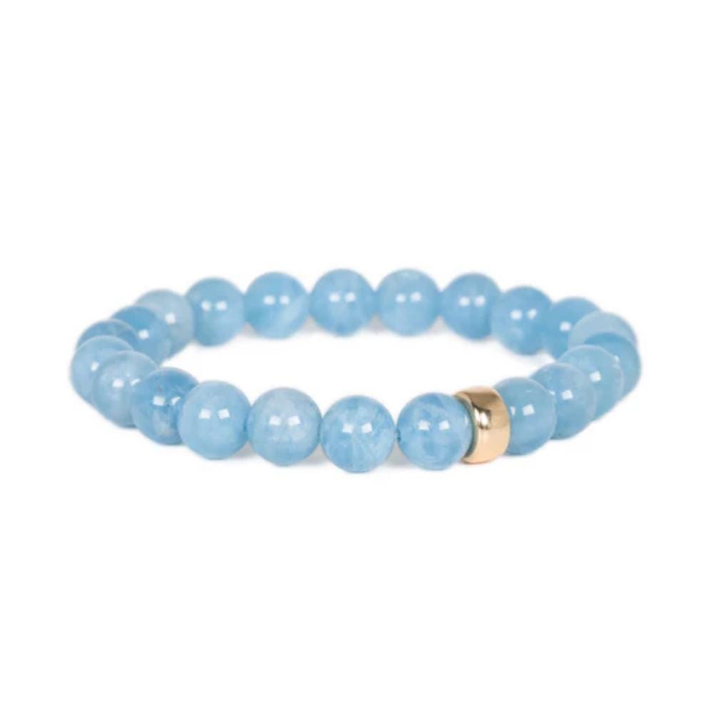 Crafted from exceptionally rare AAAA+ aquamarine, this bracelet radiates serenity, clarity, and oceanic calm. Each 8mm bead glows with a soft, luminous blue — a quality of aquamarine seldom seen. Choose your perfect finish: a classic rondel in 14K gold filled, sterling silver, or solid 14K gold, or opt for the uplifting smiley charm in gold vermeil (3 microns of gold on sterling silver), solid 14K gold, or sterling silver.
